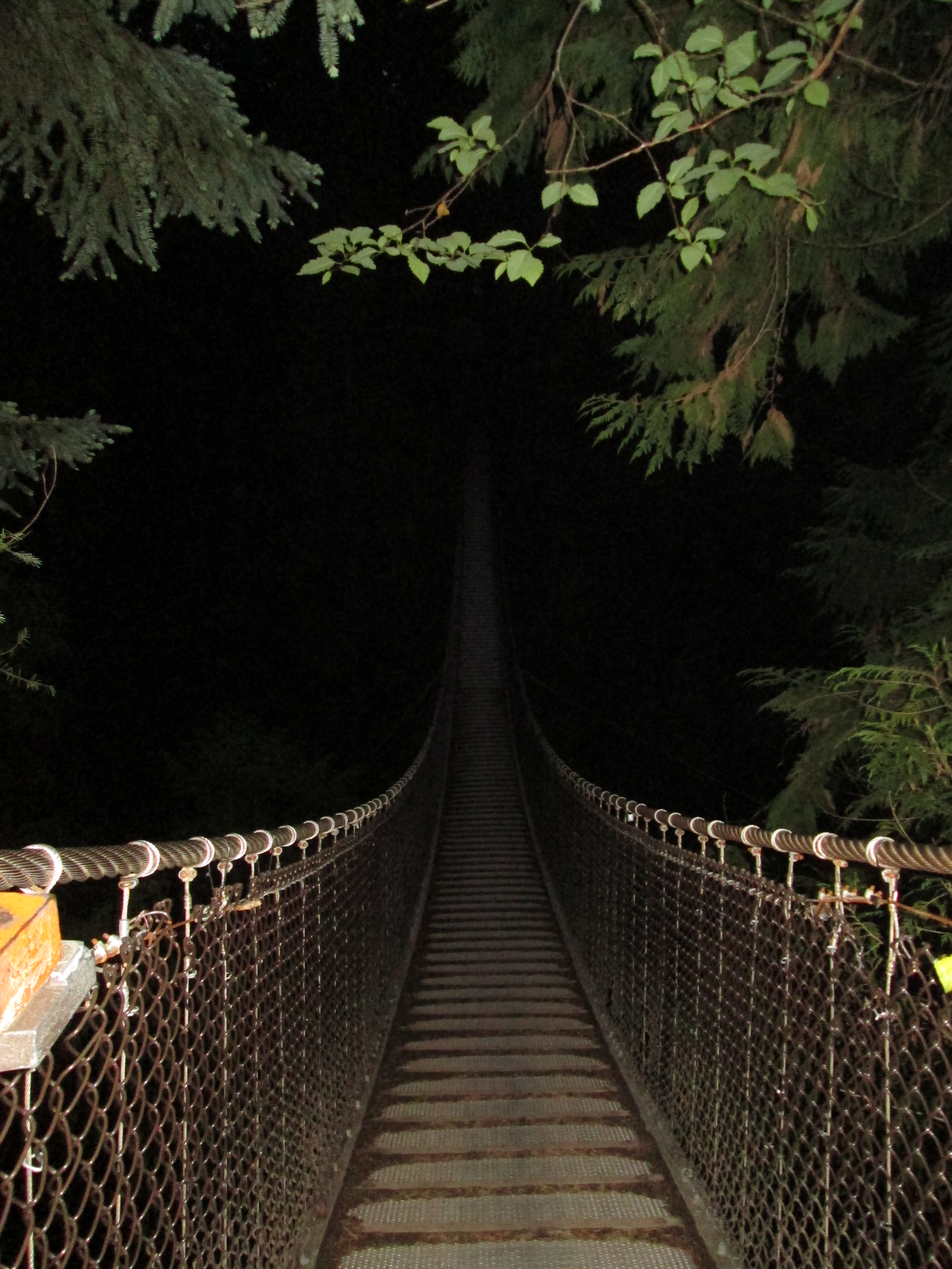Once it had begun to get dark we decided to continue walking down stream in the hope that we would eventually find the suspension bridge. Mike and I went on ahead while Curt and Zach ended up going back the way we had came for reasons unknown, and the two of us eventually came out on the bridge. While we waited for the others to catch up we discussed how hard you would hit the water if you were to jump or fall and what we would do if a bear appeared at either end of the bridge, trapping us on it. Jumping wasn’t out of the question.