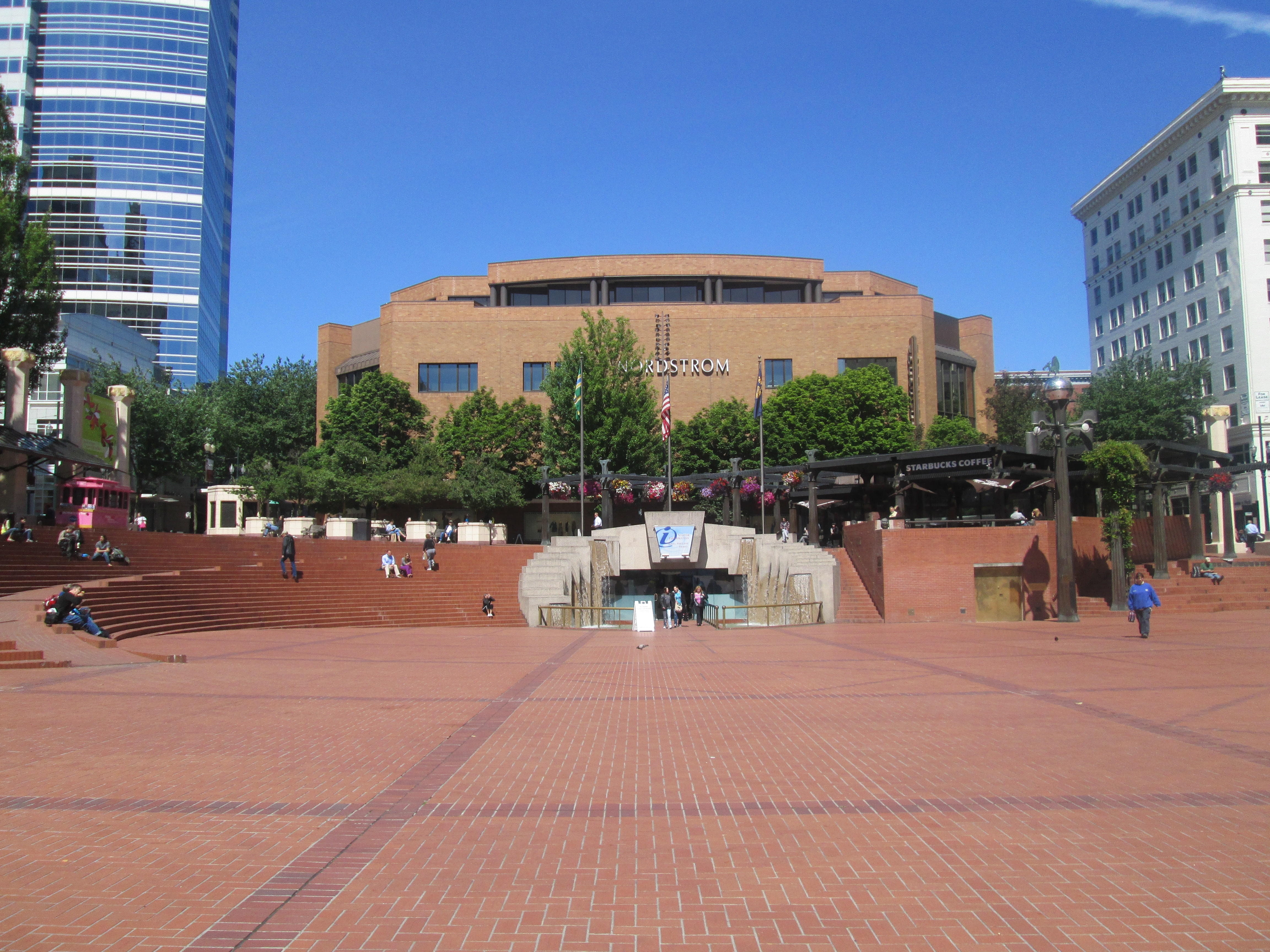Continuing up 5th until I hit Yamhill and followed it until I came to Pioneer Courthouse Square, this is where Tourist Information is tucked away behind a fountain and underneath a Starbucks. It’s considered to be Portland’s living room and everytime I’ve walked by, even when the weather has been fair it has been almost empty so I’m not sure how it’s got this reputation.