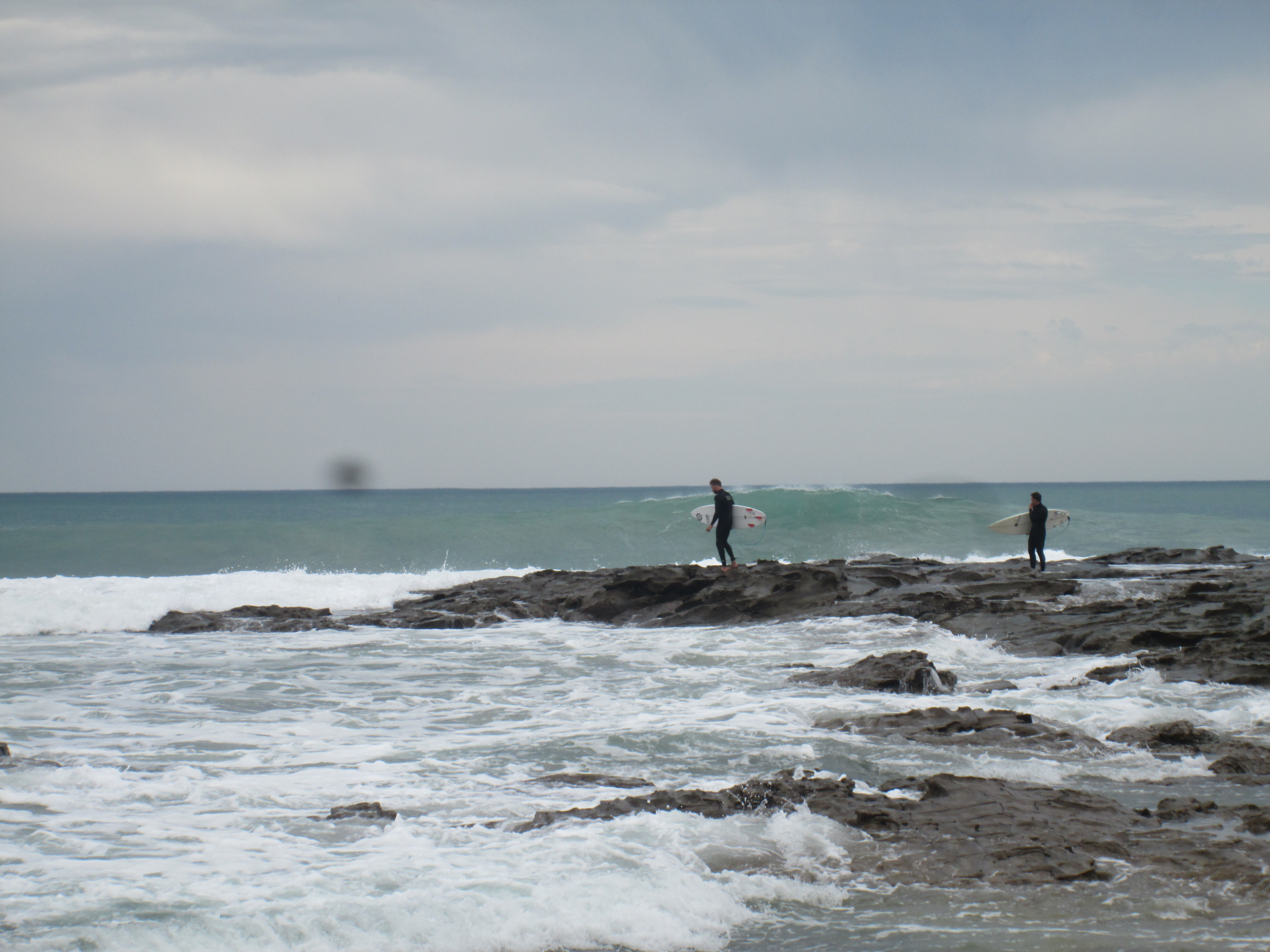 We edged our way along the coast line, nervous about not knowing exactly what the tide was going to and about whether or not a big wave would just come and wash us out to sea. There were a couple of high adrenalin moments as we clung to the cliffs and covered with ocean spray. Eventually we realized we must be safe, there were a group of surfers looking for a spot to put in and take advantage of the waves we were struggling to avoid.