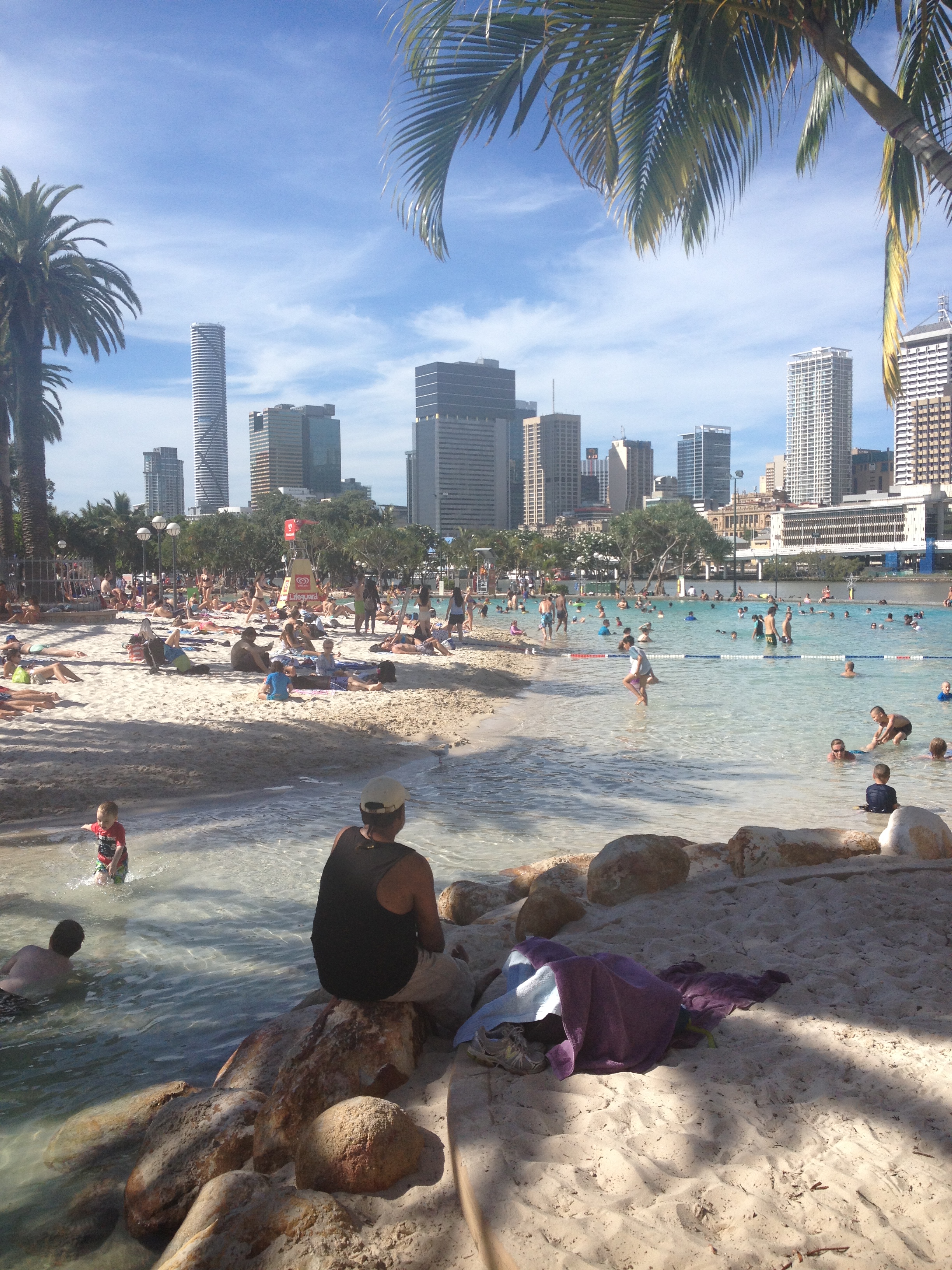Our tour then continued through the city to South Bank where I once again expected to tap into those past memories. Still nothing. We walked through arches until we got to the artificial beach which I will admit actually looked familiar. However, I’m unsure if this is because I actually remember being here or because I’ve seen photographs of me in the water and have created false memories based on what I’ve seen. I certainly don’t remember it being so busy, or anything else that surrounded it. Maybe it was because at the time I was so young and would have had less interest in the bars, but we stopped for a beer anyway.