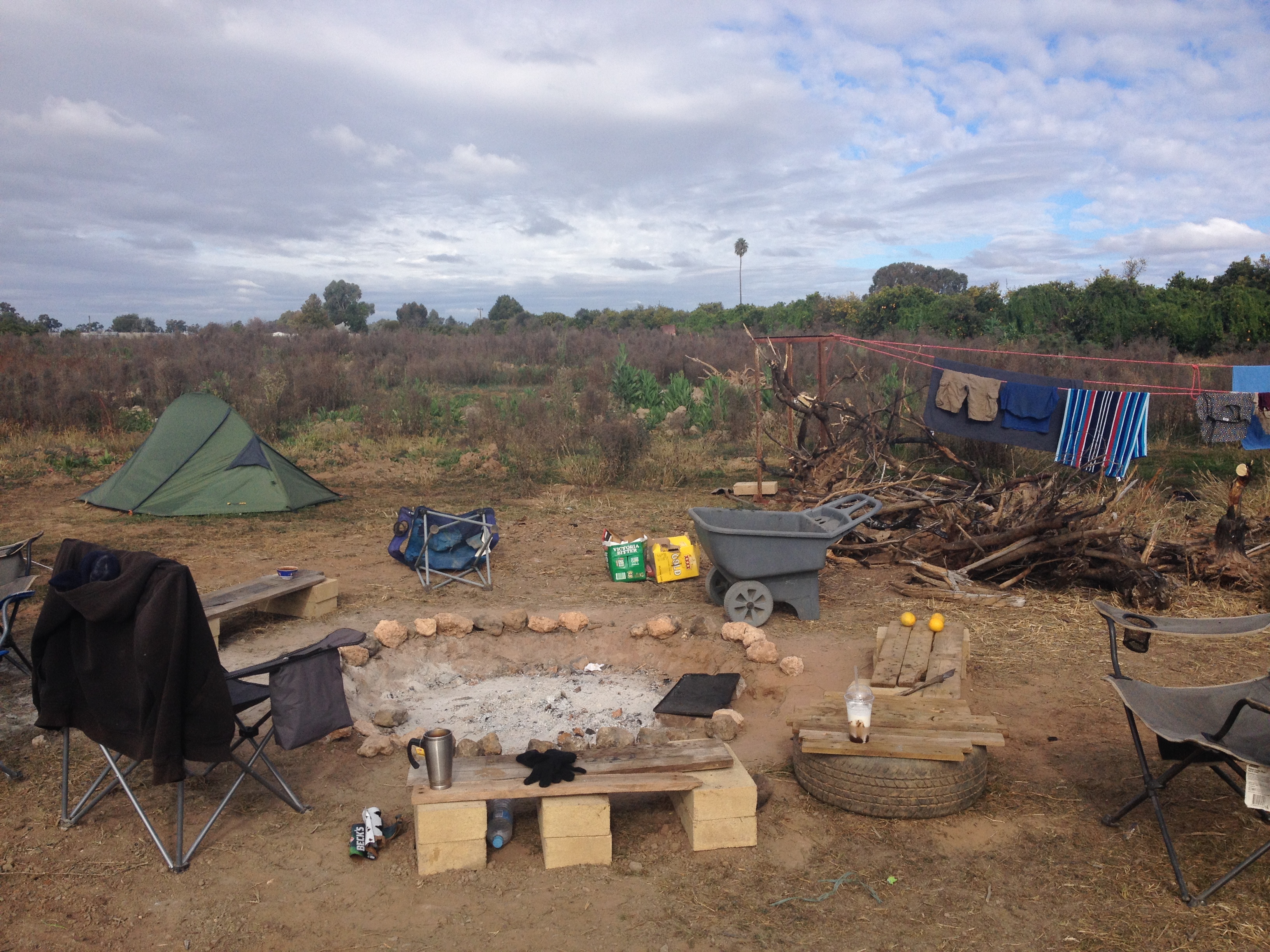 A washing line has gone up, Yves has built a porch for his tent, Bastien has dug a bigger fire pit and made several benches for us to sit around. We found a steel box to keep our food safe from the cat that has an addiction to bread and have set up a camp stove on the work top in the shed.