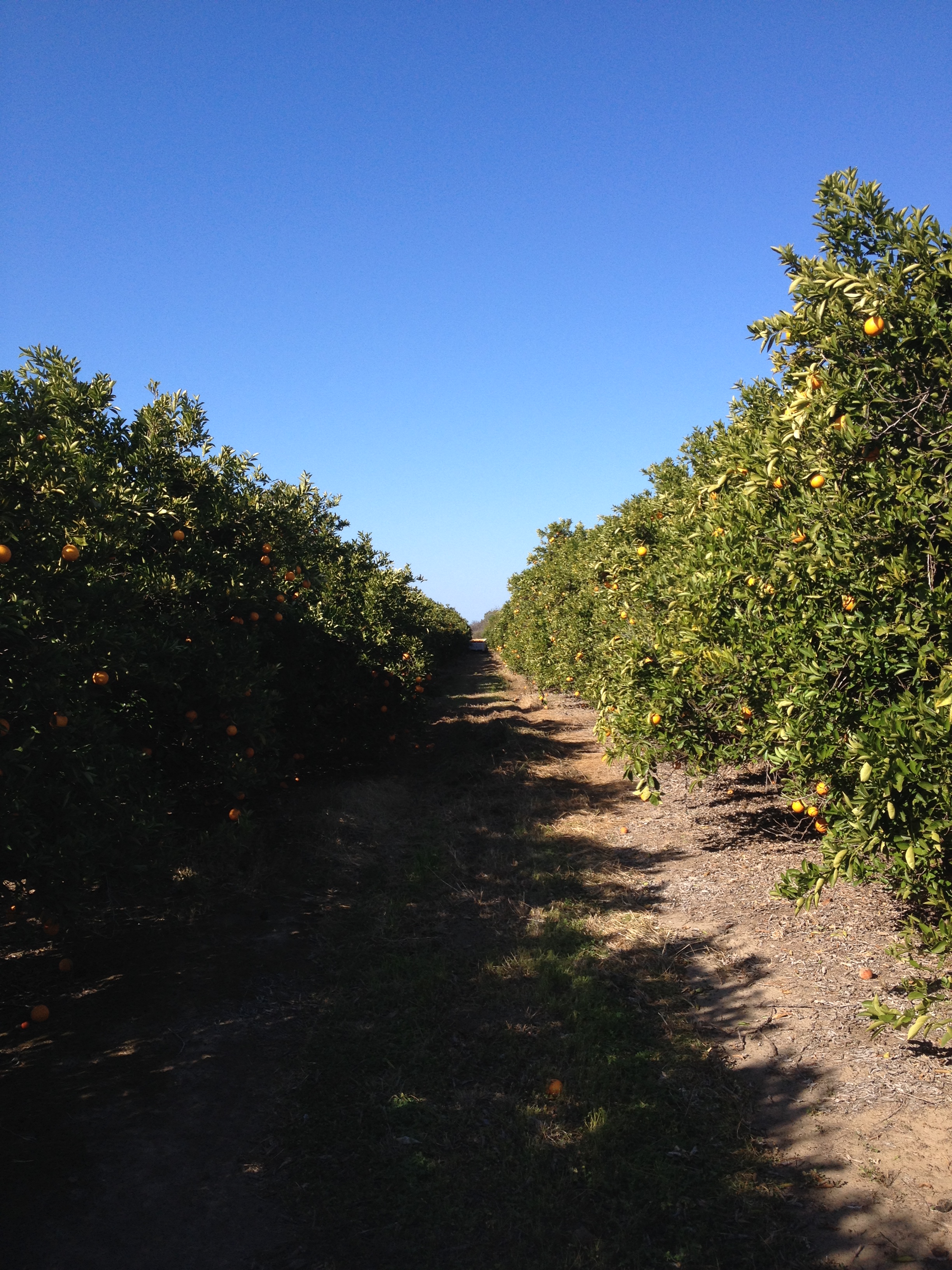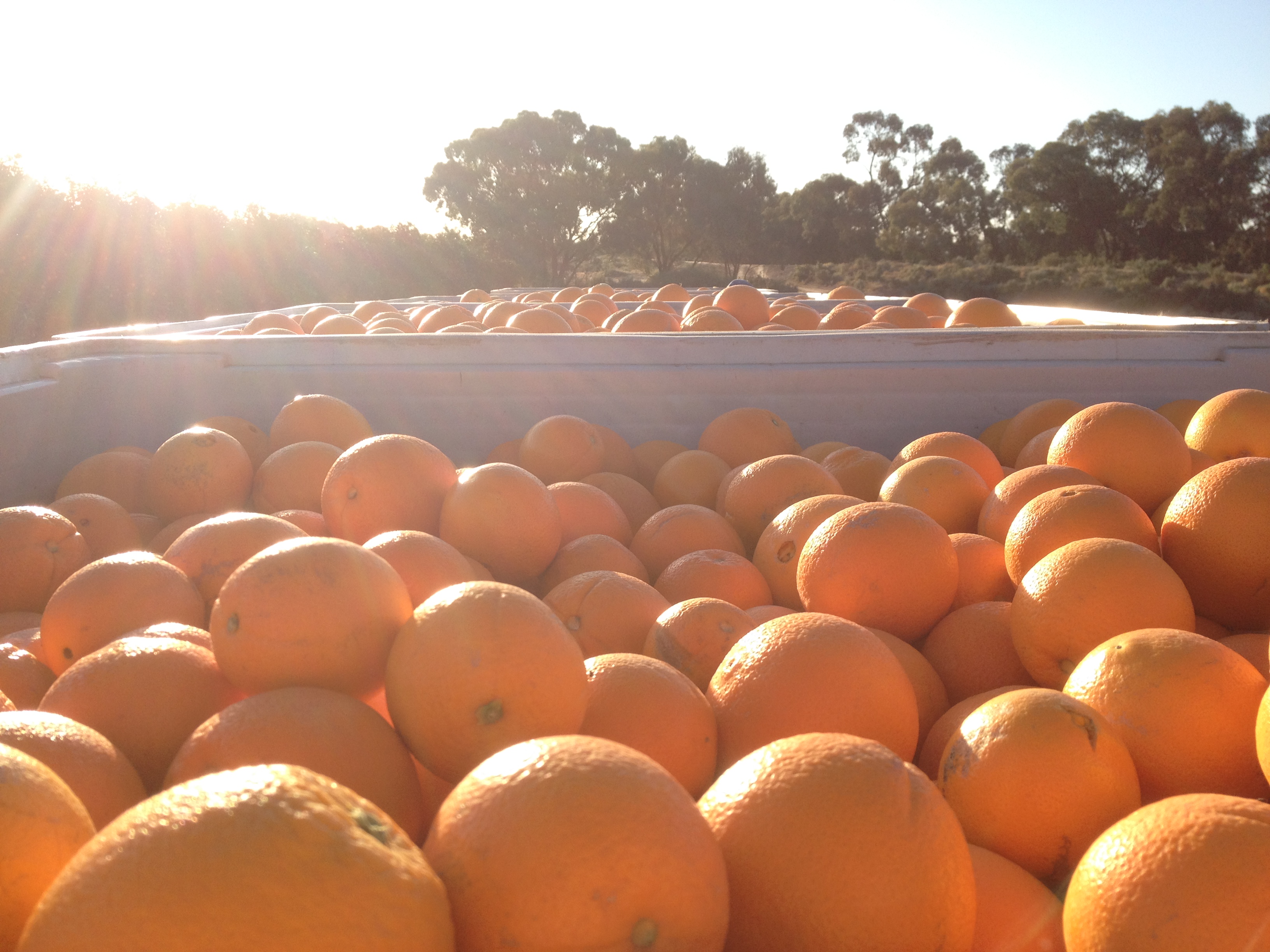 Picking in a team of four is great. There’s someone else picking seventy five percent of the row. You only have to worry about your section. If, like me, that’s the bottom you’ve got it easy. There’s often two bags of oranges on the bottoms of every tree, and so after four trees you’ve picked your share of the bin and it’s likely full by now.