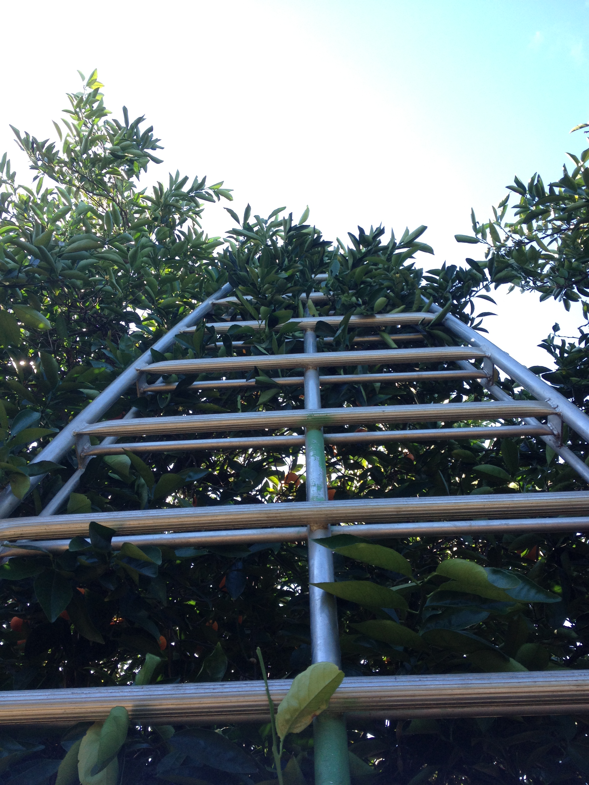 Alone, things aren’t so easy. My first day in a row on my own was tough, I picked two bins in four hours and was totally exhausted and felt like I’d never be good at picking. My problems start with the ladder, I’m not confident on my feet when I’m walking on flat Tarmac so when I’m twelve foot high resting on a metal rung little over an inch wide I’m a long way from my comfort zone. I’m also suffering because of my height, I am not a tall man and reaching the tops of the trees and some of the middles is close to impossible for me. I’ve now come to accept that some oranges just aren’t getting picked.