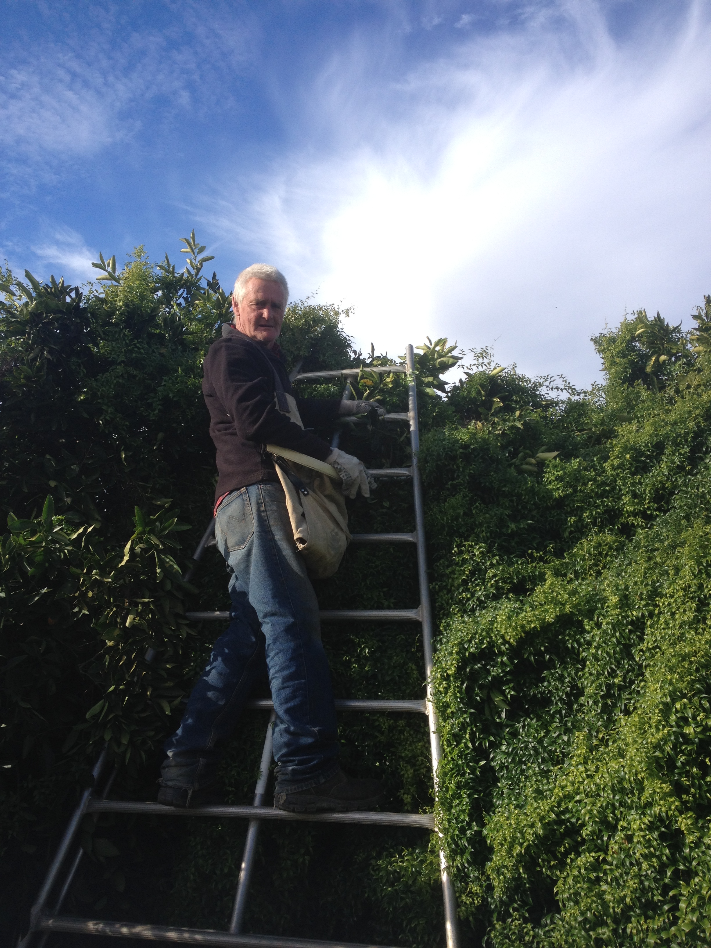 I’ve had the pleasure of picking some fruit over at Karen’s Dad, Doug’s place recently. Everyone had me believing that he was some fire-breathing demon who would come out with a gun and tell me to get off his land but once we arrived I came to understand that this was probably the side to him you’d likely meet if you crashed a tractor into one of his trees. After spending a day over there it was easy to see where Karen got her hospitable and generous traits from. Doug has been kind enough to come through the orchard after us with his afron, which is not dissimilar to a cherry picker, and cleans up the tops of our trees for us and if that wasn’t enough he always has the kettle ready to go for a tea-break. You couldn’t have it much better than that when you’re out picking. And if that wasn’t enough, he took me and Val (who I’ve been picking with of late) out to the pub for dinner to thank us for doing such a good job on his mandarins. What an absolute gent!