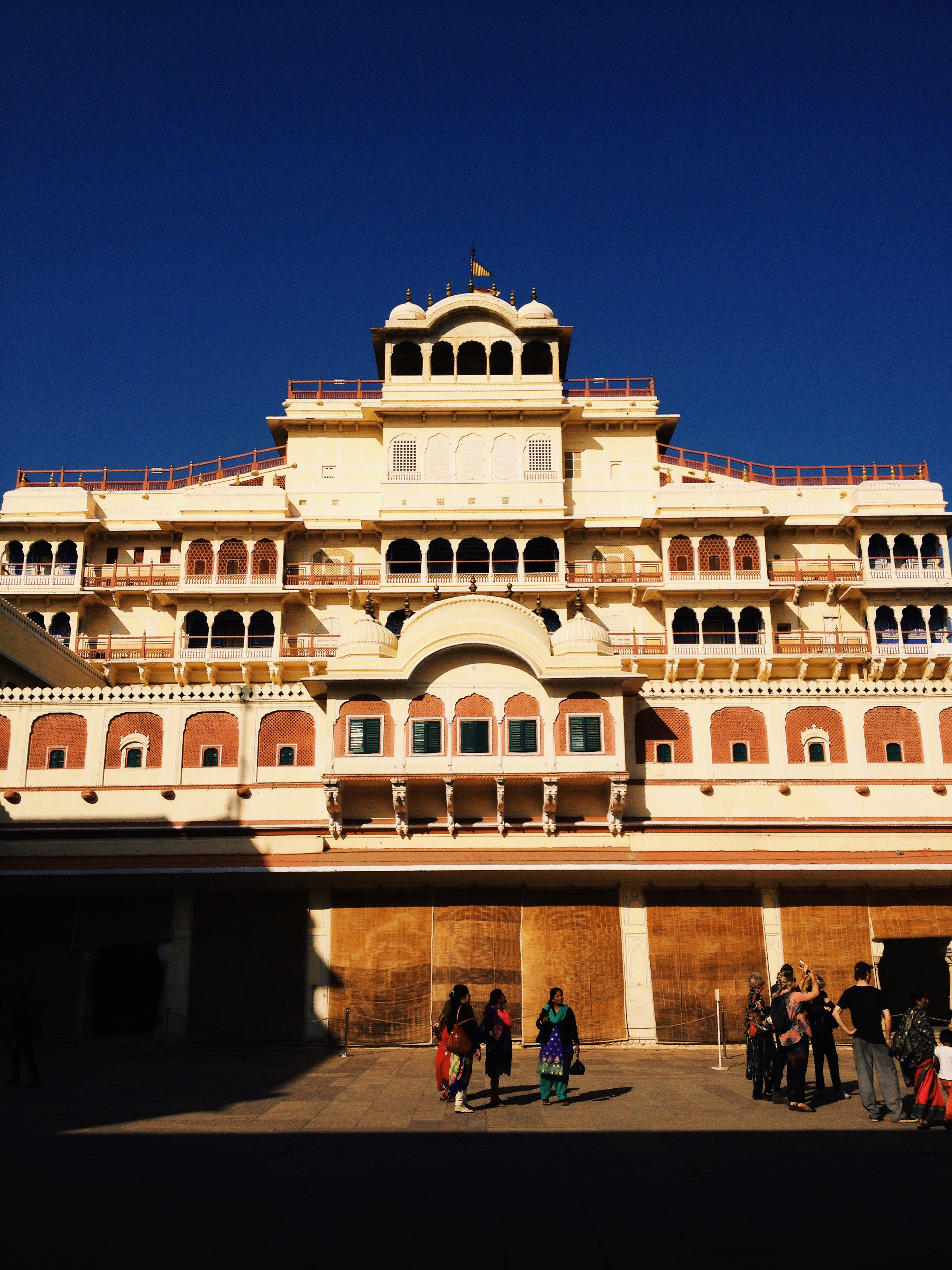 Clean, fed, almost well rested it was time to get back on the bus for a relaxed day of sight seeing in the city. We had a short hit list that began with the city palace. Jaipur’s famous pink city is at it’s heart, like an old walled town. Passing through the orange rather than pink gates, almost every building was the same colour. The walls appear to have carved arches and alcoves but a closer inspection reveals they’re just painted on. The city palace itself is yellow which was just a little unexpected. On picking up our tickets, there’s no pretending in India that you don’t pay more if you’re a tourist. Two ticket types, foreign national and Indian. I’ll leave it up to you to decide which is four times more expensive.
