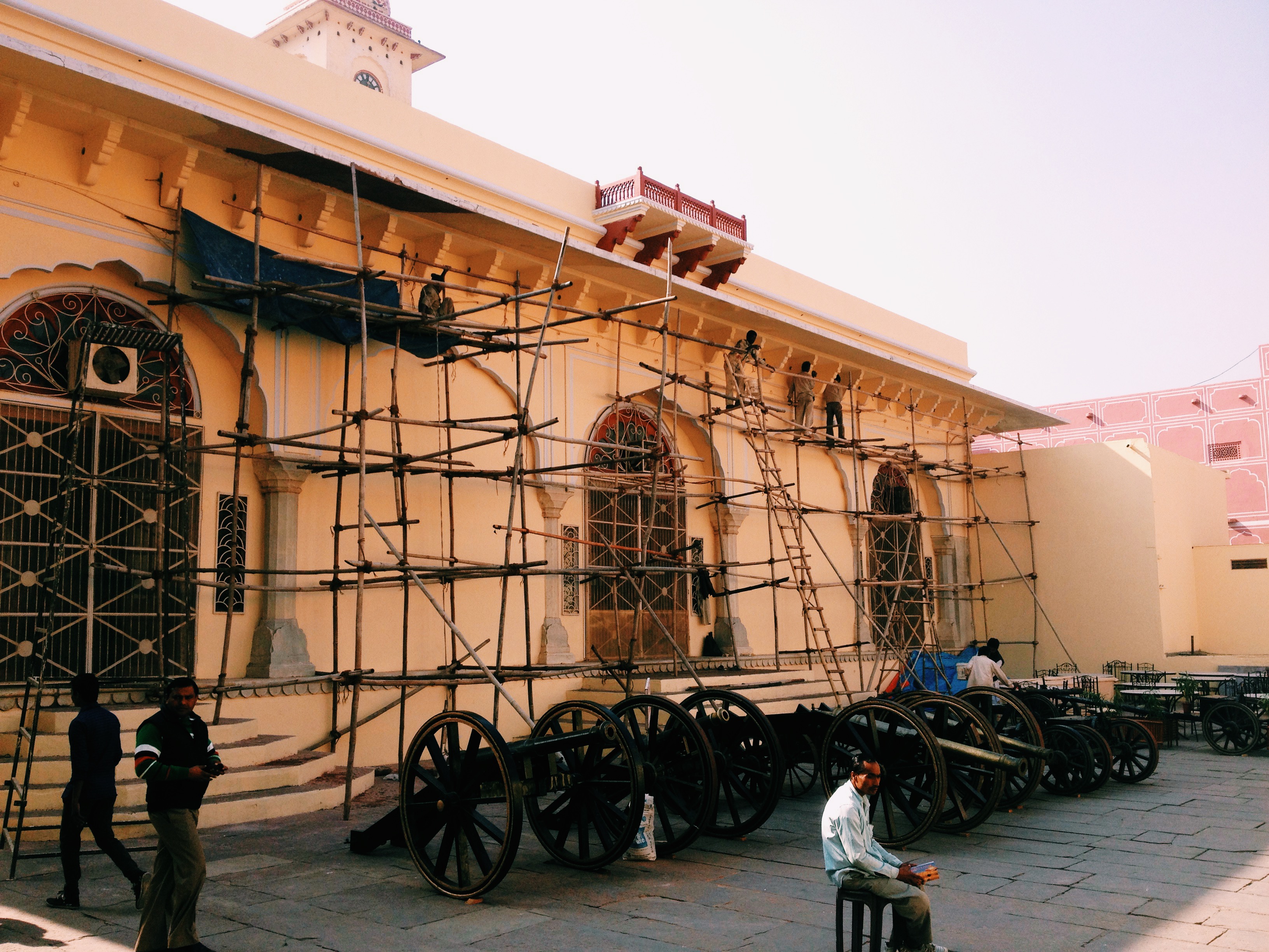 The first thing that we saw was scaffolding. Less than a minute in and I’d already mentioned that it wasn’t finished yet. How very typical of a sight straight from the guide book. Men were precariously balancing on bamboo poles without platforms painting one of the buildings. Risk assessments don’t exist in India. We slowly ambled through the palace grounds, courtyards opened up beyond intricately decorated gateways filled with huge ornamental doors. The buildings within had become museums, galleries or gift shops, all containing their fair share of unusual artefacts.