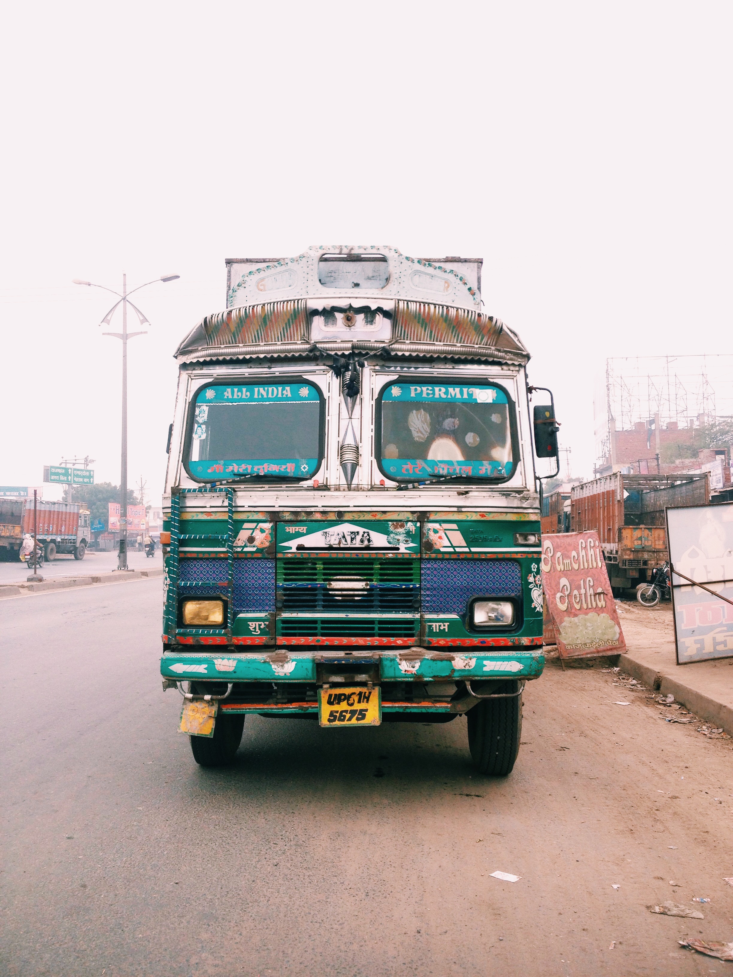 On the road again in India. How anyone knows what is happening is beyond me. In size order I have seen goats, sheep, pigs, children, bicycles, motorcycles, cows, buffalos, horses, carts, cars, camels, vans, elephants and lorries, the biggest lorries I have ever seen, all attempting to navigate the completely ignored lanes. There’s a sign on the side of the road that we’ve passed several times. “Lane driving is sane driving.” Nobody cares. At one point on the way out of New Delhi the road spread across ten marked lanes in each direction. I think I’m probably greatly relieved that I slept for most of the journey. Waking up in a dense traffic jam surrounded by these huge brown shipping containers that are attempting to merge into the lane that I suppose we are in. It feels like it’s only going to be a matter of time before the trucks on either side of us crush us between them like an empty can. Then, all of the sudden, the road opens up, everyone begins to move freely. An intersection has been the cause of our hold up.