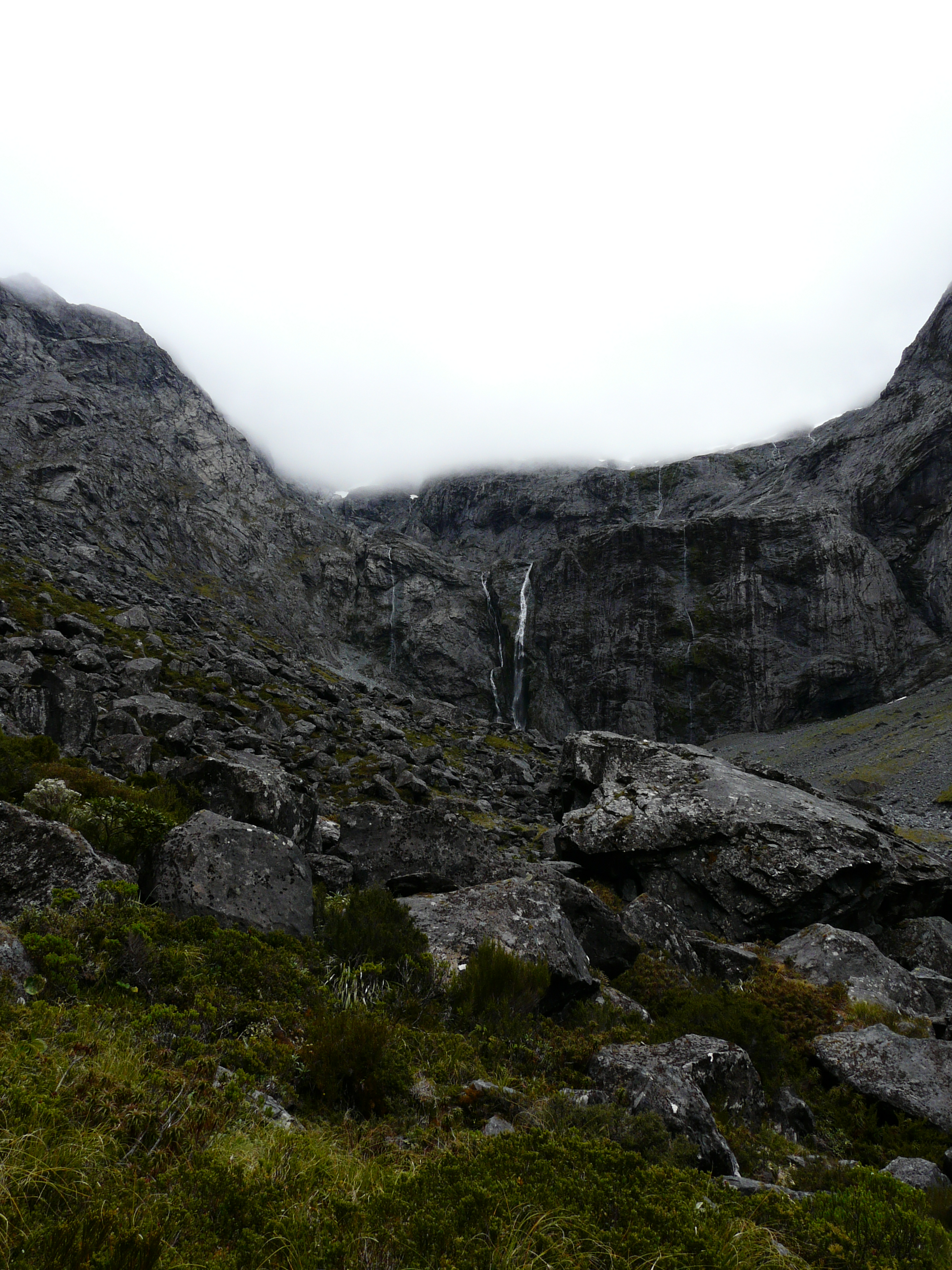 The road climbed, heading towards Homer Tunnel. The mountains closed in. Huge grey vertical walls of granite surrounded us. The clouds formed a low false ceiling. Water trickled over the edge of the cliffs into the valley. We might have reached the end of the world. There was nothing to do but turn back. Of course that’s not what happened. However, were it not for Homer Tunnel this would be the end of the road. Lights glisten off the moisture inside. Is that a pressure-headache forming? It’s less than a mile long, cutting straight through the mountains. That’s a lot of weight sitting on top of us. Then, you’re through. Emerging into bright blue skies and sunshine. People on this side of the tunnel were in shorts and t-shirts. It could have been ten degrees warmer. It felt like a different world.