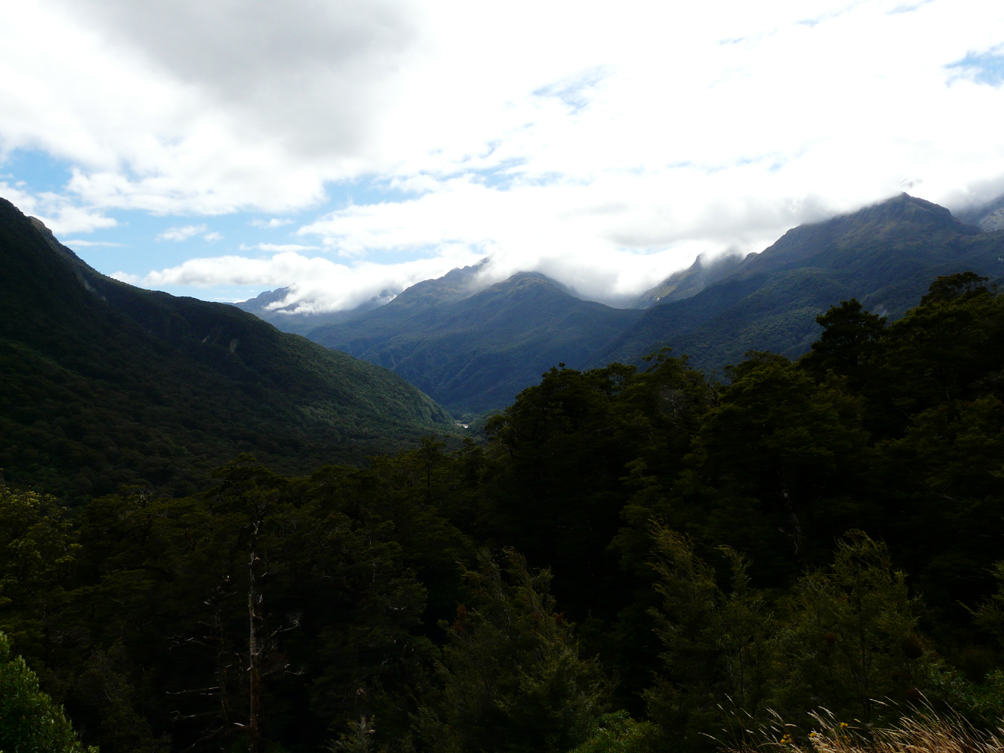 I’ve found myself getting a real kick out of the roads that climb through the valleys to emerge on a dividing range. Going deeper into the Fiordland National Park found us another slow incline that twisted and turned along the valley walls until we crested to descend into the next one. More often than not there’s a car park and a viewpoint waiting for us at the top.We were still very much surrounded by giant peaks. The weather was beginning to turn in our favour the closer we got to Milford Sound. Our silent deal with the weather may yet work out.