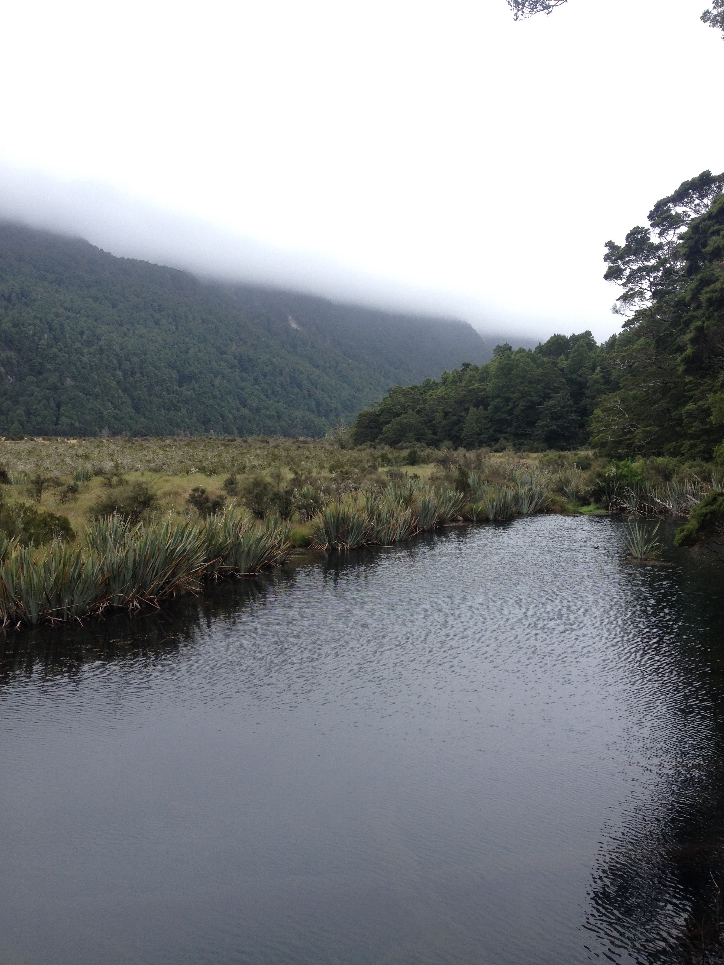 The trail came out on the shores of Lake Gunn. In the distance, nestled between the shoulders of mountains was a hint of blue. A suggestion perhaps, that this day was going to improve. We could see the soft curve of pebbles on the lake bed a few meters from the shore as they disappeared into the depths. We found ourselves again amazed at the clarity of the water. An outlet flowed from the lake was also pristine, it had already began to take on shades of green and blue. It makes you wonder if we’ll ever get used to clear, blue waters of New Zealand. We returned to the van, ready to continue further up the valley.