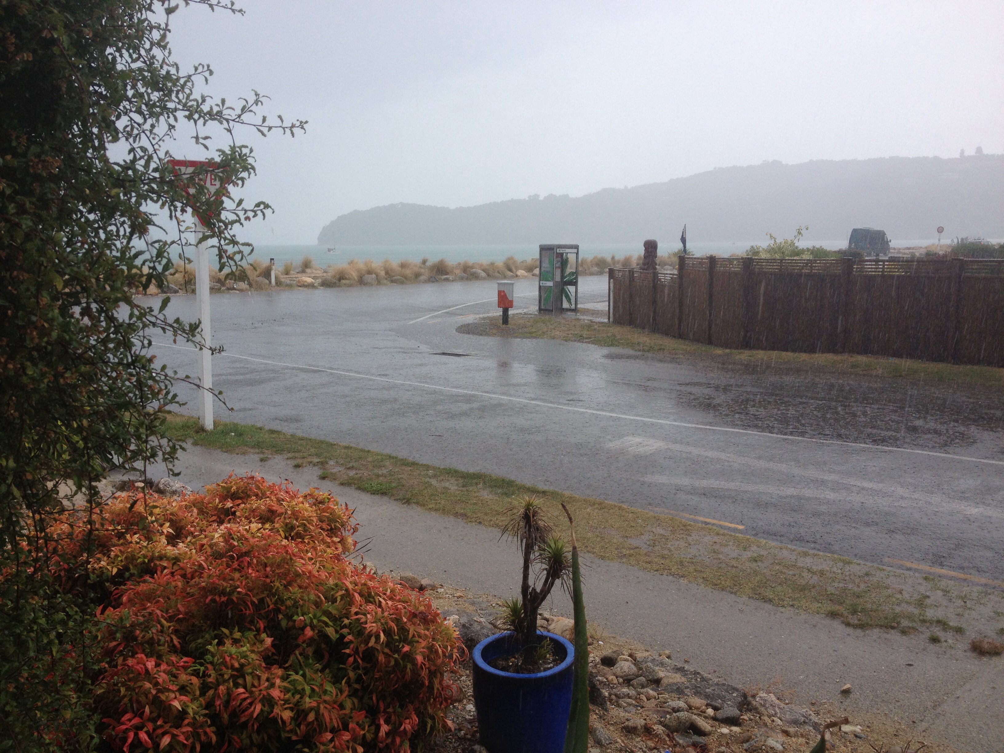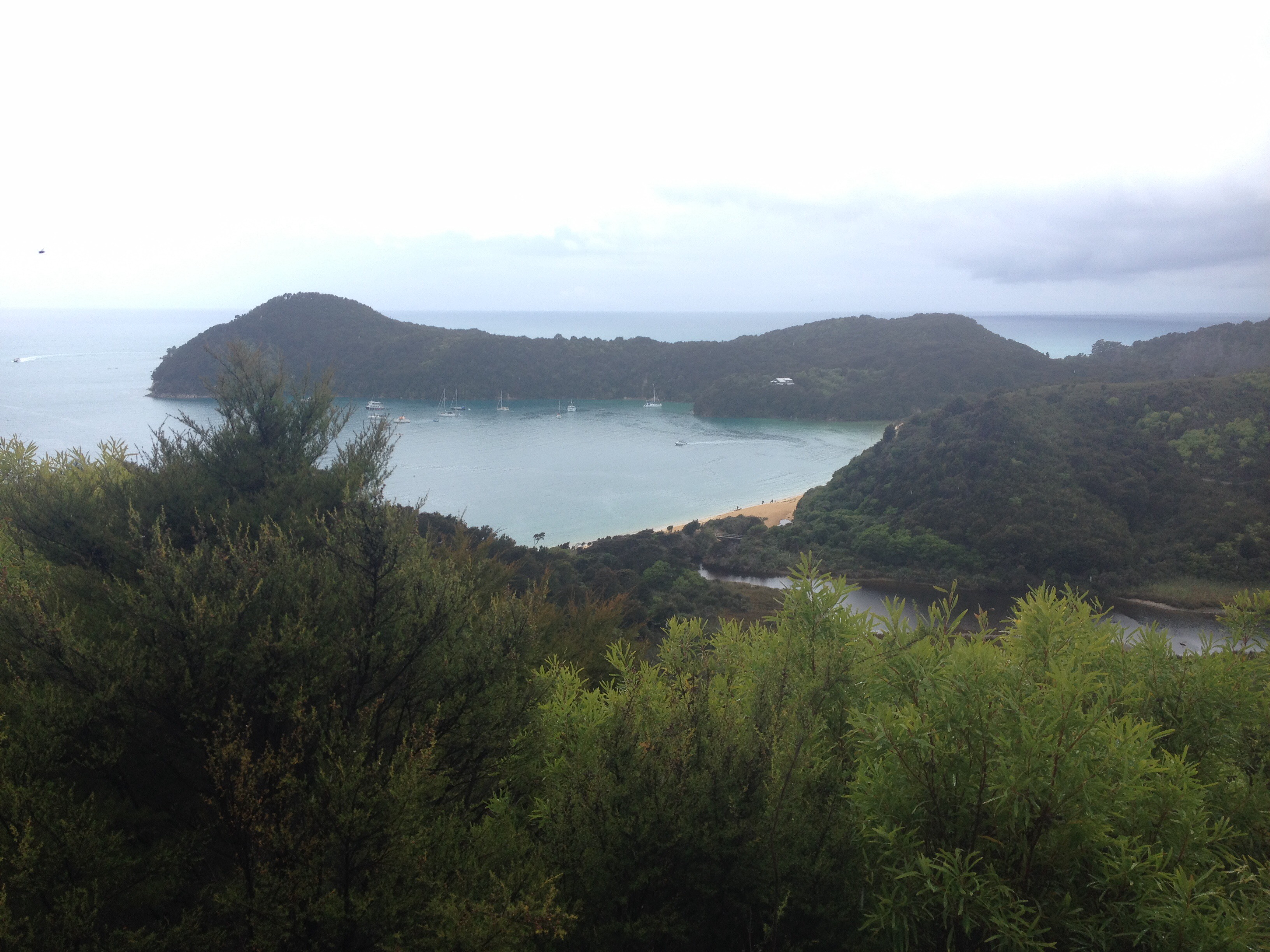 Should we catch a water taxi further into the park? How about walking in and boating back? Or even boating there and walking back? By now everyone was pretty tired of hearing me pipe up to suggest another hike. I wasn’t going to be put off. Mum had done the inland track with me, so I gave her a pass. Lisa was probably just sick of my company by now, did I really want to walk with her for four hours? Probably not. Dad, I don’t know about Dad, maybe he was saving himself for the Tongariro Crossing, I didn’t push it. I agreed to get a boat as far as the Anchorage. Mum, Dad and Lisa were going to walk a short section of the coastal track before catching a water taxi back. I was going to walk back alone. As we finalised the purchase of our tickets an apocalypse of rain struck. It came down in lakes, the roads turned to rivers instantly. A couple waiting with us cancelled almost immediately. A little bit of rain wasn’t going to put us weather hardened Brits off!