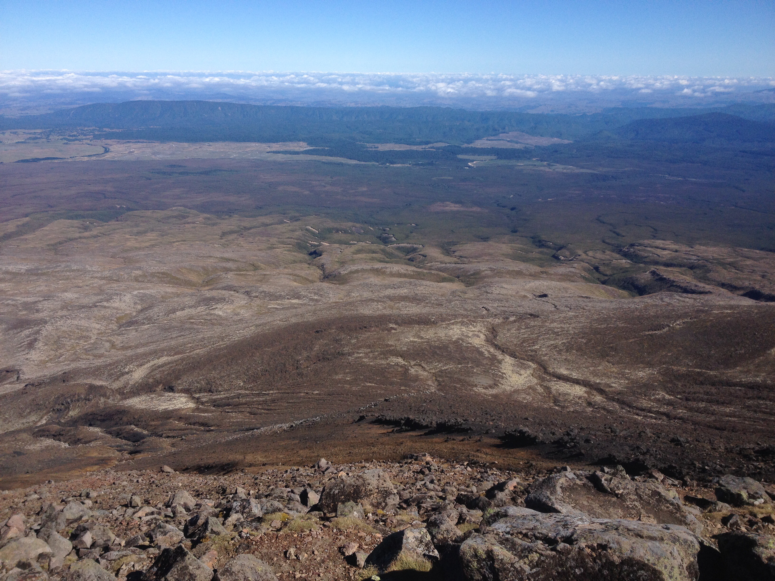 It’s a short walk out of the crater, out of all the craters and onto the towering mountainside. The walls parted to provide the most incredible view over the country to the north. Lake Taupo shimmered in the afternoon sun, a giant inland sea surrounded by rolling peaks of supposedly extinct volcanoes. I could see a white stripe that marked the drive to the finishing car park. I still had some serious walking left to do, about half as far as the car park I could see the roof of the Ketetahi hut, home to the first toilets since the Soda Springs. I checked the time, wondering how far ahead Lisa was, how far behind Mum and Dad were. I was surprised not to have seen any of them again.