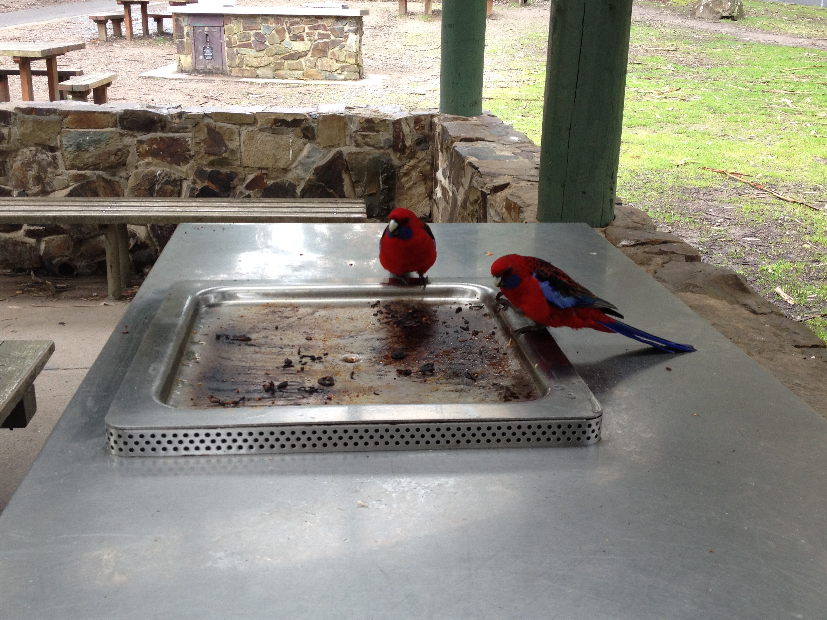 Two crimson rosellas pick at the burned remains of a barbecue. In a tree beyond them, a plump kookaburra keeps watch. The white bird swooped down from it’s branch to pluck a worm out of the moist ground. As we approached the start of the track a most awful sound began to crescendo. A platoon of cockatoos soared overhead, a thunderous interruption to the serenity. The Dandenong Ranges are famous as being home to lyrebirds. The ground dwelling bird is renowned for it’s ability to mimic the sounds around it. I’m disappointed we didn’t see any. With the amount of noise around us I wouldn’t be surprised if some of the stranger sounds were from a lyrebird.