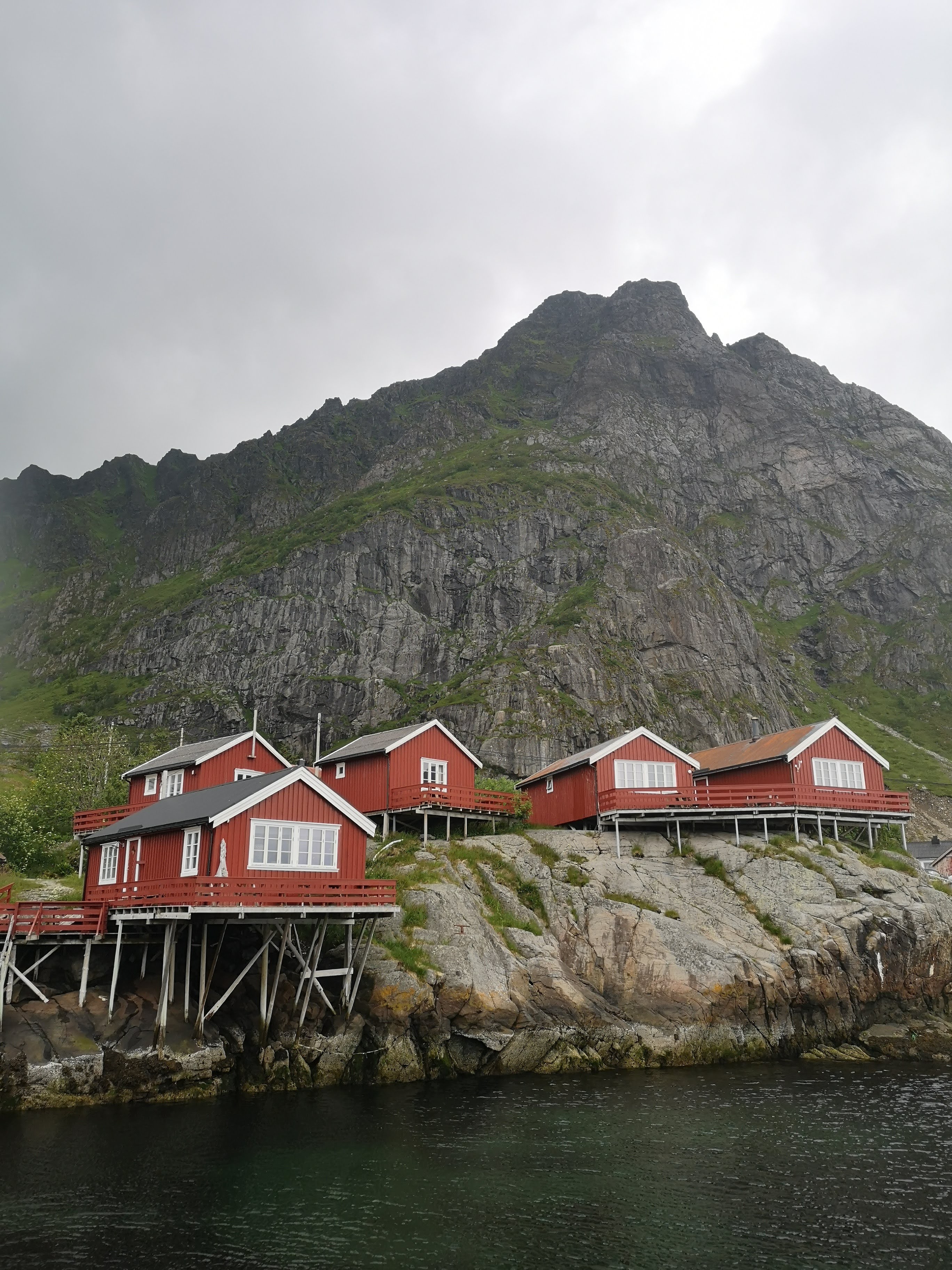 In the morning we were at the ferry terminal. With the exception of the actual children on the boat, we were seriously dragging down the average age. Maybe it’s only people of a certain generation who feel they can afford to travel in Norway, and those of us who don’t care about the financial impact. The ferry pulled out of Bodø, turning between the rocky islands, passing towering mountains that rose like giant fins straight out of the sea. Light and shadow danced across the islands. Clouds lingered in the summits. On the horizon dark clouds and walls of rock merged. Jon and I debated how far we could see. As we drew closer the clouds rose higher and separated from the sharp edge of the mountain summits. White capped grey sea. White tipped grey mountains. White topped puffs of grey cloud. Our first view of the Lofoten archipelago. Colours emerged, green and more shades of grey. Tiny red and white box houses nestled on the shore. Thin white waterfalls crashed out of the peaks.