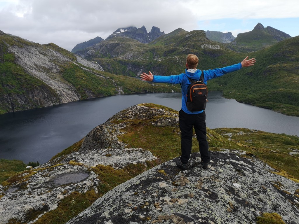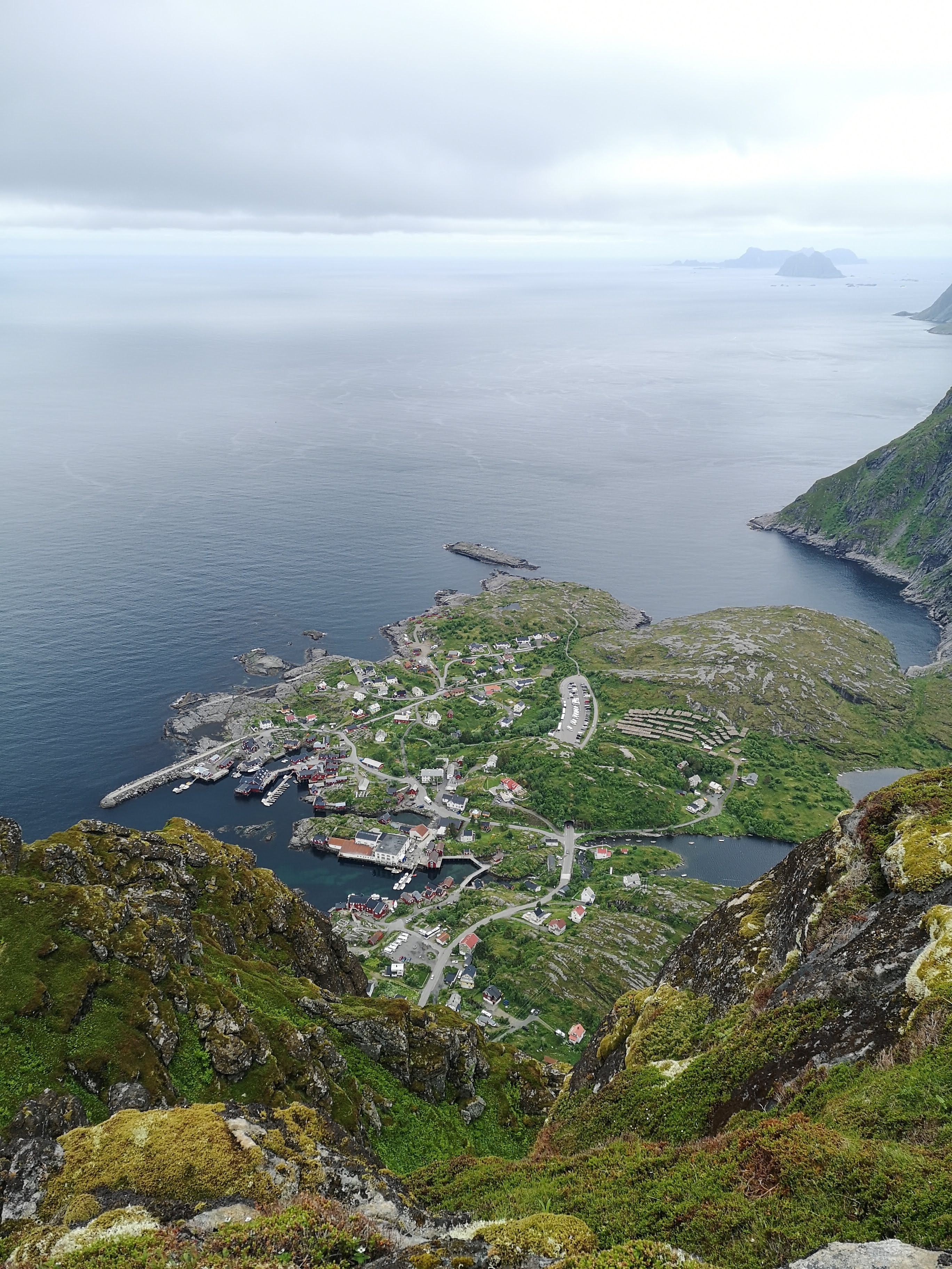 In the morning we filled up on bread and bad coffee before returning to the trail. The clouds were high, blue skies hugged the coast. The conditions were in our favour. We started to climb. The coastline stretched out and rose like stacked shards of broken glass. Behind every summit, higher peaks reached. Waterfalls spilling out of one lake into the next . The trail offered a choice; mud or rock, wet or dry. Maybe you’d like to try them all at once. Open mouthed gaping at the landscape. Grinning madly into the wind. Swearing at how unbelievable our surroundings were. We rose over hills and ascended a gorge, climbing beyond the snow line and scrambling up the ridge between two valleys. Below the town of Å looked insignificant. A cluster of houses, a car park full of camper vans and busses. Beyond, we could see the endless pillars and walls that form the Lofoten archipelago. Day one on the island chain and our expectations were already smashed. We raced the rain back down to sea level.