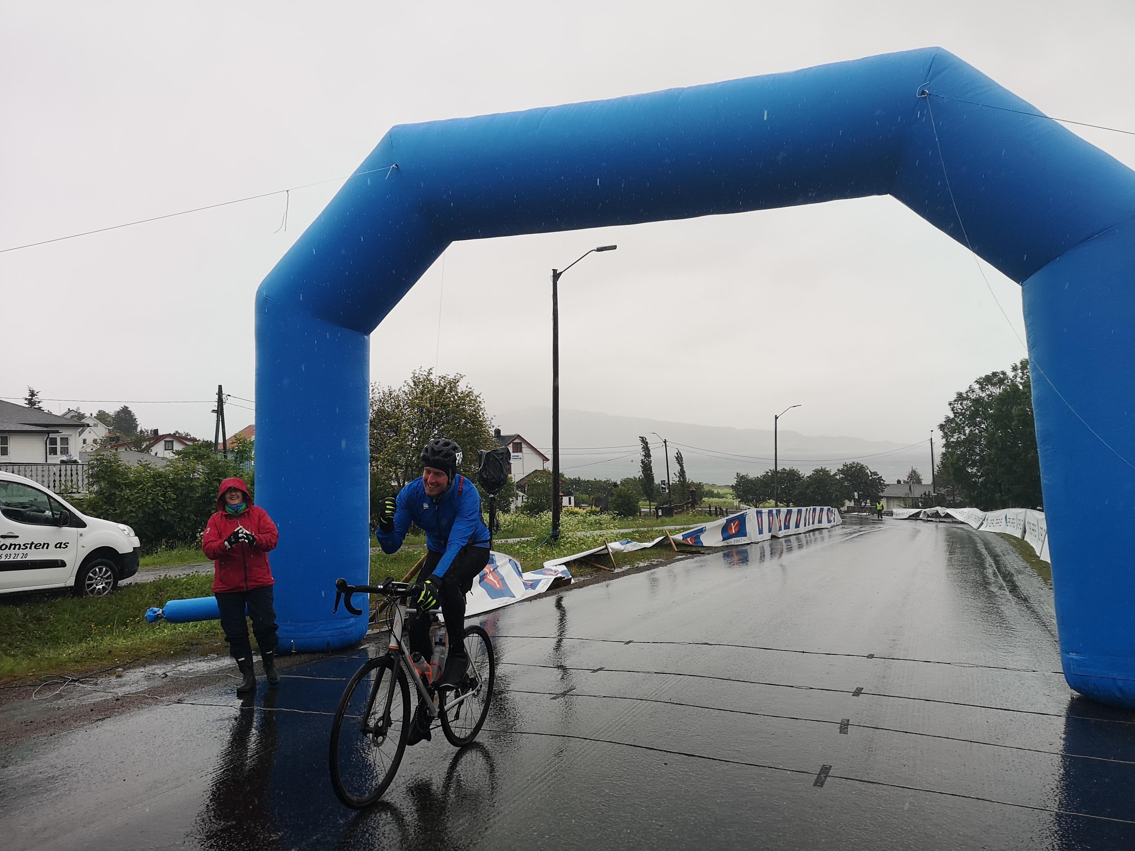 I drove along white sand beaches, through deep glacial valleys, beneath colossal spires of black granite. Huge tunnels swallowed the car and spat it out into a new valley. The rain started up again. I stopped briefly to stretch my legs before the damp wind pushed me back into the car. The views continued to amaze. I joined a trail of traffic, the first I’d encountered, to see the safety car for the tourers. Two cyclists were plodding along. I hadn’t seen Jon yet but I didn’t have to wait long. 10km from the finish I passed a lone biker in a blue jacket, seeing just enough to know who it was. I had the briefest of emotional experiences. Pride, relief, elation. He was going to do it. I got to the finish line not long before him. I followed his location on GPS, the little dot moving closer and closer. I layered up and headed to the finish line. The support crew were soaking wet, cheering on everyone who crossed the line. He rounded the final corner, a grin on his face, a fist pump across the line. Cold, wet, tired and complete.