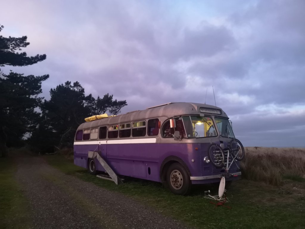 What am I gonna do for an hour? Everything I have is inside the van. I can’t leave the van because the minute I’m out of sight, someone from the AA will arrive. I pick up a few pine cones and start juggling. They’re not the easiest juggling balls in the world. Flaking, breaking, spraying dust into my eyes. They’re a good weight for it though. Not long into it I’m accosted by a small dog. She doesn’t know about social distancing and certainly doesn’t care for it. Her paws are on my thighs, her teeth nibbling at my thumb as I give her a pat. “Like it or not, everyone gets a pat.” The dog’s owner, Rod, emerges from the other side of my van. We talk for a while about where we’ve come from. I explain why I’m stood outside my van, not that you really need to explain this sort of thing. Free country and all. Rod laughs, tells me we’ve all been there. He drives a bus, but before that he used to have a Toyota Lightace. You used to be able to stick a thing in the window and pop the lock he said. There’s always a way to get back in. He takes Furby, the dog, for a walk along the beach and I continue to wait. As Rod returns, so rolls up The Man from the AA. Not in a bright yellow van as I expected, but in a ute branded with the local garage details. The Man from the AA has a couple of tricks in his car, after a bit of jimmying about he pops the lock and I’m reunited with my keys. Rod invites me over to his bus, The Dragons Liar. Not my typo but the one on his business card. The bus has a double bed in the back, separate shower and toilet. A dining table for two, gas stove and oven, a fridge, a sink with hot water on tap. A sofa and a TV. There is an awful lot of room. I take a cup of tea with Rod and he tells me about the bus, where he found it, the work he’s done. The power supply. It sets me to dreaming about what another van might look like in the future.
