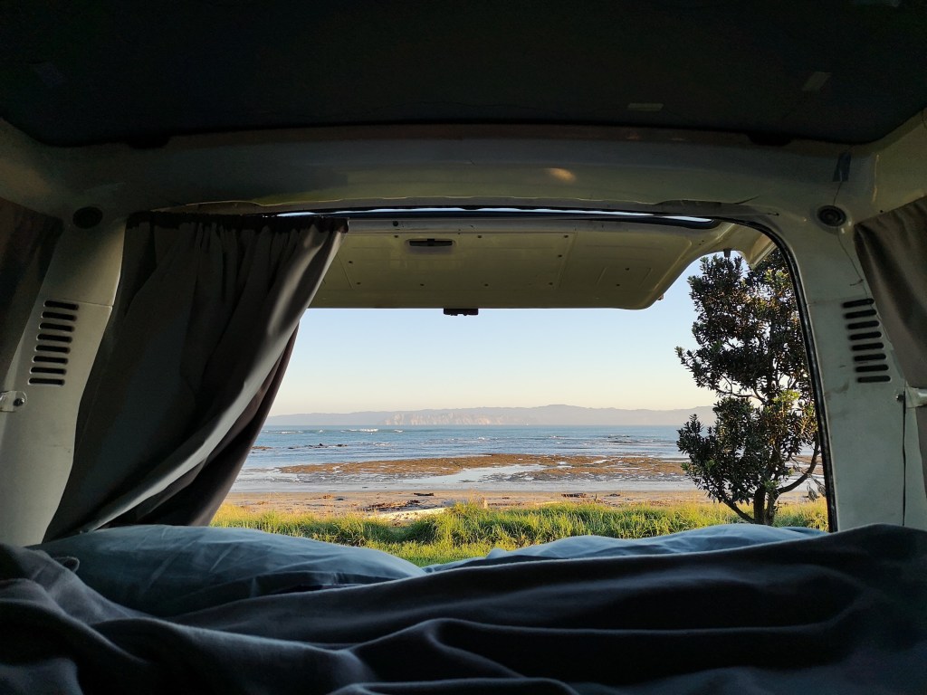 I drive on into Gisborne. On my way into the city I pass Sunshine Brewery. I decide to turn back. A few people are drinking tiny little beers on the deck. I’ve only got a short drive from here, to the shops, and then to camp. I decide I can probably treat myself to a tiny little serving of the light pilsner. I realise this is the first poured beer I’ve had since I was in Auckland. I wonder if the beer tastes better because of it, or if it is actually quite good. Once I’ve ticked off my chores I head down to Kaiti Beach to park up for the night. I reverse in so I can open the back door to a view of Poverty Bay. Looking to my left, there’s another van. Without the luxury of parking sensors, I really am in the dark over how long my van is. How do people know how far back their vehicles go? I slowly back up until my cab is almost in line with the one across from me when I feel the bump. Turns out my van is a little longer than the other one. I roll forward. More caution required next time. The bay is filled with sea spray, around the coast Norfolk pines stand out in the fading light. The evening is beautiful. More and more vans fill the parking area. For a while I have a van-sized space on either side of me. They don’t last. Mr Netherlands doesn’t notice me when he steps out of his van. He walks down on to the beach to take in the view. On his return he sees me perched in the back of my van and stops to chat. He’s come off the East Cape. I’m heading out that way. “You must go to Anaura Bay,” he tells me. I make a note and share it with everyone I know.