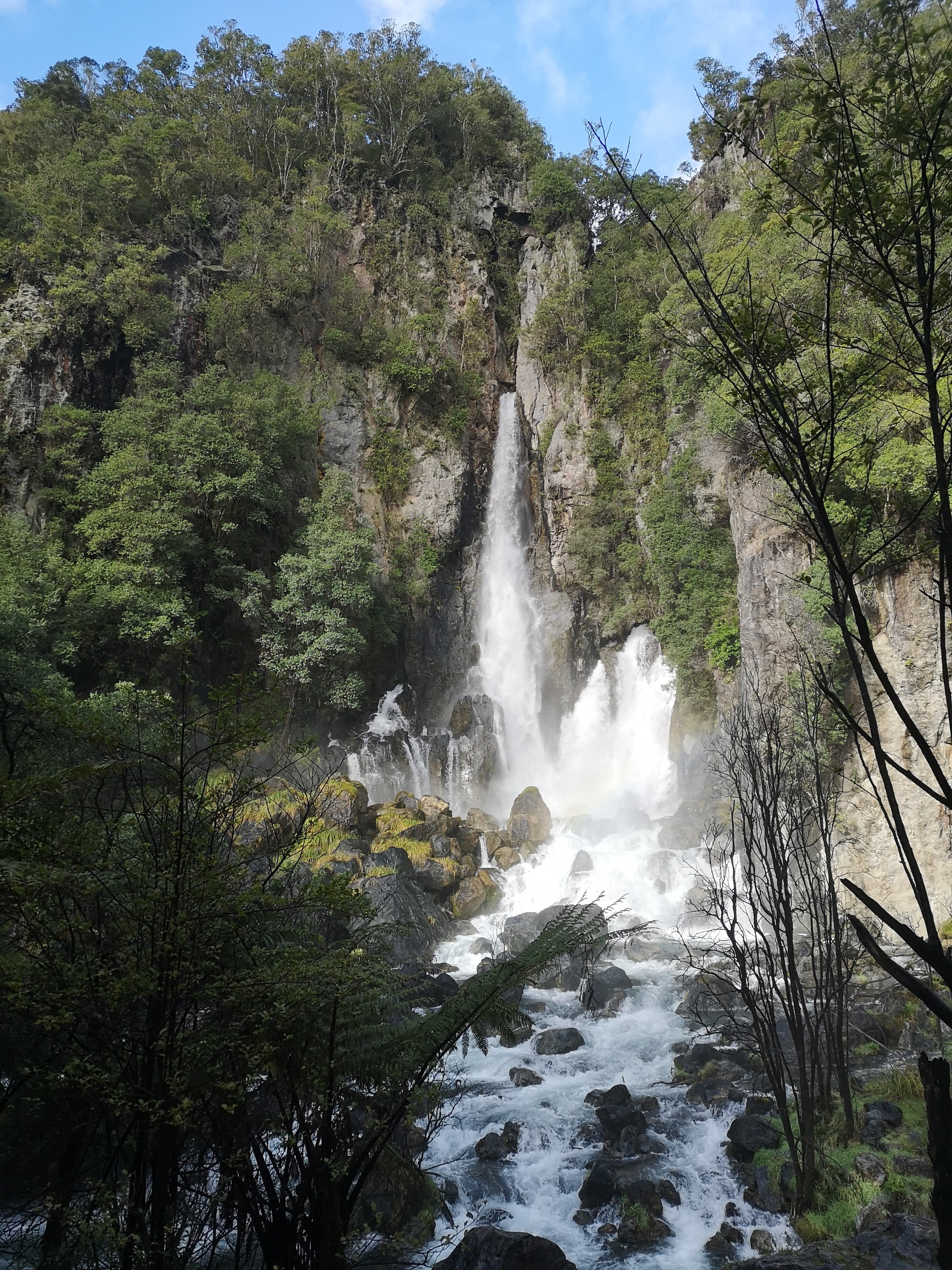 I did want to go out and walk along the Tarawera River and see the falls. To do this I would have to pass through the plantations. Access required a permit. I stopped in at the i-Site in Kawerau to buy one. Unhappy about having to pay money to be allowed outside, I left before I upset anyone other than myself. I drove for half an hour through various stages of pine development. From pin-cushioned tufts of bright green, to regimented lines of mature tall trees, to the post-harvest wastelands. Signs warn the road isn’t maintained. Rather than potholes, I find I’m battling across trenches. The van took a pounding. All my belongings shaken, not stirred. When I do stop I’ve come to a closed gate. The campsite is closed, which I had been told at the i-Site. I foolishly assumed closed meant no camping. I wasn’t expecting there to be a bar across the road. I’d have to go back. At least this time I was ready for the trenches. I finally arrived in another, unlocked car park, pleased to find I’m the only one there.