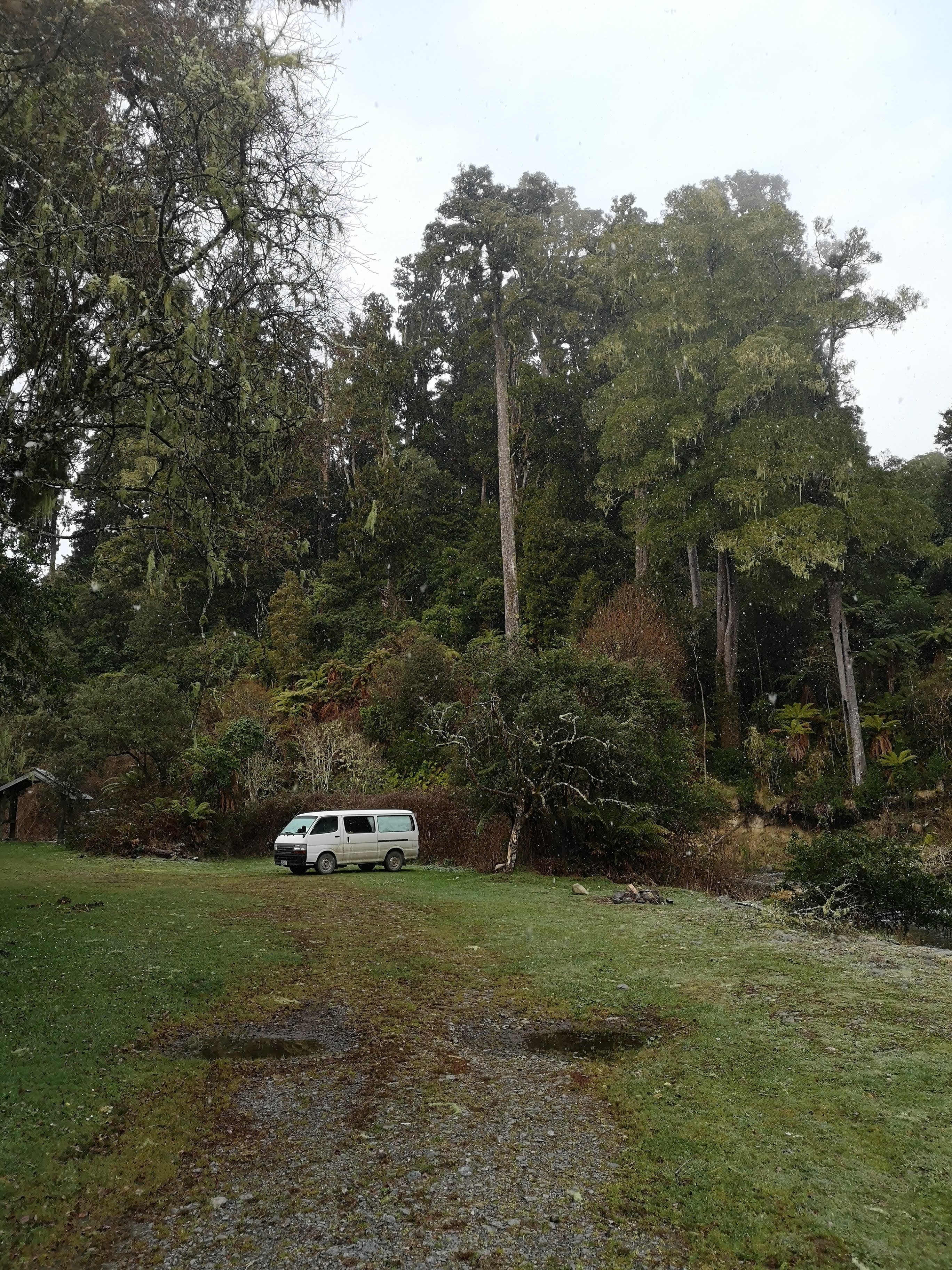 My feet must have gotten cold at some point in the night. They never warmed up. I found myself curled up in the foetal position. Trying to use my body to heat my feet. In the end, I gave up, put socks on and got out of bed. I open the curtain across the side door. Little white flakes are falling from the sky. I can’t quite believe it. Snow has settled on the windscreen, in the black rubber window frames. There’s blue sky between the clouds. I open my stove, put the kettle on and wait for an eternity. The gas isn’t really burning. There’s not enough heat to boil the water. I’ve since learned that the vaporising point of butane is -0.5 degrees. It was too cold for my stove. I drank down a tepid cup of tea and breakfasted on cold oats. I knew that if my stove wouldn’t fire up, I’d probably need to leave the van a while to warm up. At around 11am I put the keys in, lights came on but there was no action. No cranking, no clicking. Nothing. The only time I’ve had this problem before is when the battery was flat. I waited another hour and tried again. Still nothing. Shit. My phone would occasionally show a single bar of reception. I couldn’t connect a call to the AA. I walked back up the night walk trail, up hill. Still nothing. I realised with some regret that if anyone had come through while I was away, I would have missed them. I went back to the camp, past the van and started walking down the road. Checking my phone every few minutes, trying to place a call. Eventually I got through the automated call system to speak with a person. They can’t find my location, I try to guide them and the phone cuts out. I call back, pressing the right numbers and the phone cuts out. I try again, impressed that I’m back with the same person. Less impressed they still can’t locate me. The phone cuts out. This time I get through to somebody else, they find my location and tell me I’ll have about an hour to wait. No problem, I think. “No problem,” I said. I had walked at least half an hour from the van, I’ll only have half an hour to wait when I get back. On reaching the van I decide to satisfy my curiosity. Another hour has passed after all. I put the keys in the ignition. The engine bursts into action. I don’t know what to do, the AA will be here soon so I might as well wait and let them check things over. An hour passes, then two. I see I’ve got a text message from the AA. Someone will be with me within 120 minutes. I have no idea how long ago it was sent, only that it was received 20 minutes ago. Eventually a white pick-up bundles into the camping area. A stereotypically friendly Kiwi jumps out of the front, apologising for the wait. I apologise back, for probably wasting his time. He gives me a funny look and I tell him, “It started”. “No problem,” he says. He does his checks. “This battery is mint,” he tells me. “Brand new is it?” he asks. “Sort of,” I reply. No wiser as to why the van didn’t start, he waits to make sure I can start it again. He speeds off as I slowly follow.