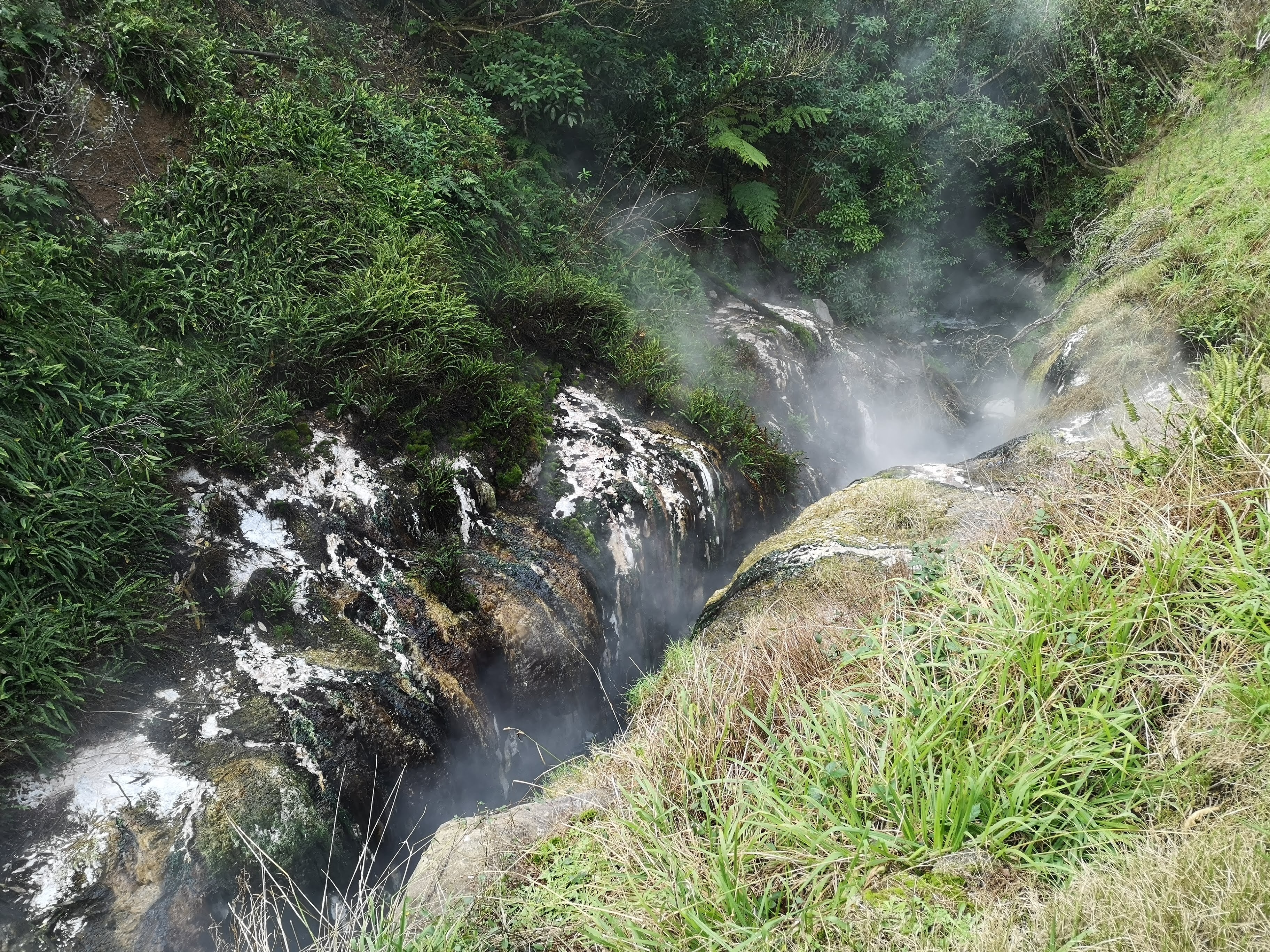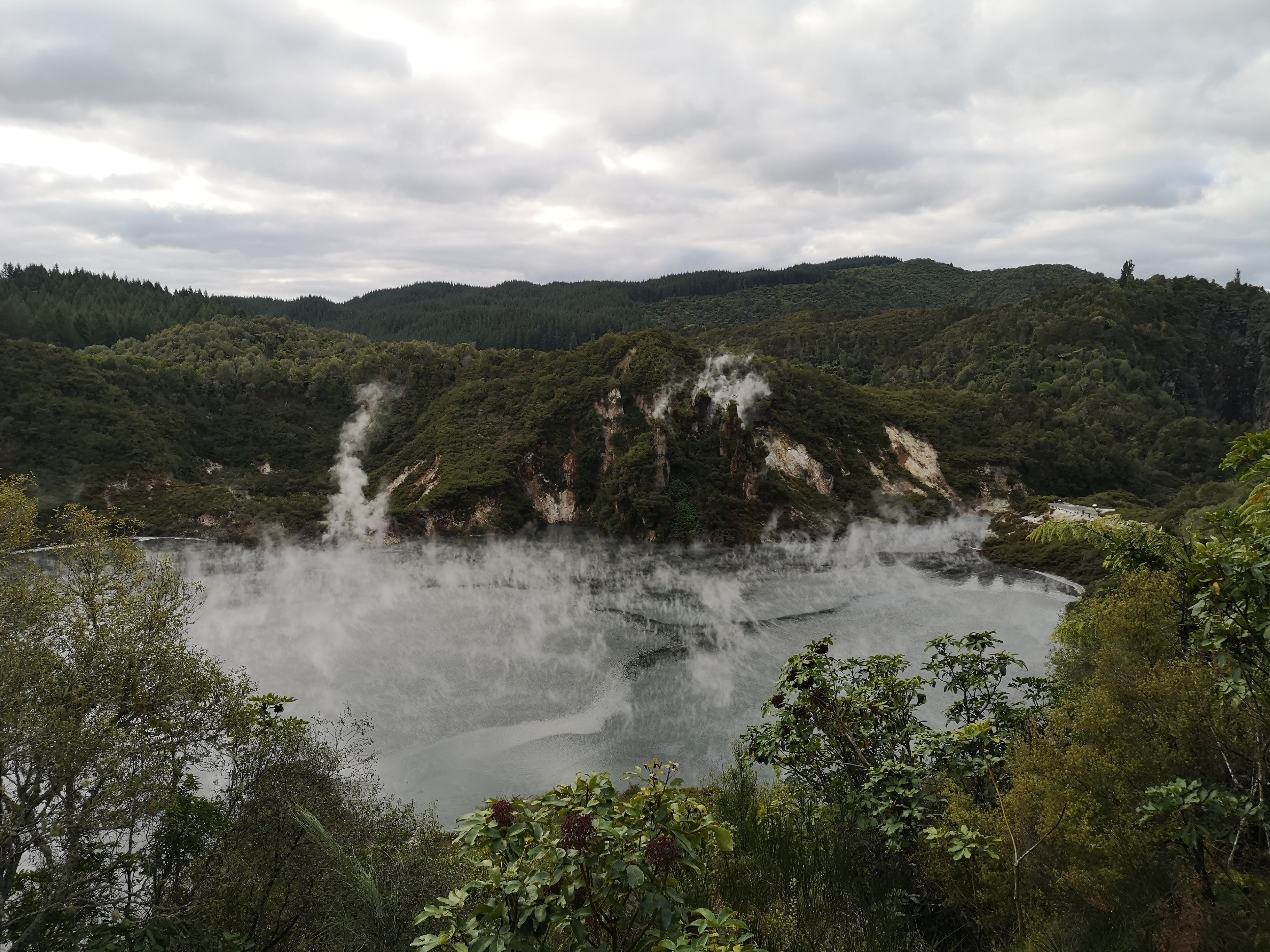 Disembarked, it was time to get stuck in to the Wanderer element of my day; a self-guided walk. The route is set out for a down-hill walk. The idea is you arrive, walk down the valley, do the boat trip, return to the car park on the bus. I was doing it in reverse. The first stand out location on the steady climb up the valley is the Warbrick Terrace. A series of multicoloured terraces are being built by silica deposits and algae growths. On my visit they appeared to be mostly white, with a variety of New Zealand greens thrown in for good measure. I continued my ascent, I detoured off the main trail to climb Mount Haszard from which I was gifted my first view of the Inferno Crater Lake. This bright, pale blue lake was chuffing away, steam rising rapidly in the cool air. A stream runs through, steaming the entire way down to Lake Rotomahana. Along the way there are other features of interest; bubbling pools, craters, and brightly coloured vents covered in algal blooms. A personal favourite is the Birds Nest Terrace, which looks as though a bird regularly visits, leaving white deposits on the sides. Waimangu Volcanic Valley peels back the top layer of the planet, offering a glimpse at the raging fire beneath our feet. The final stop is Frying Pan Lake, presumably named because on any given day you could cook an egg in it. The darker water in this crater was simmering. Huge volumes of steam spinning, twisting, rising away from the surface. I was pleased with my trip, so much so as I’d go as far as recommending a trip to Waimangu Volcanic Valley if ever you find yourself in the area, not only does it have a good logo but the self-guided walk and the boat tour are excellent. There’s plenty to see, you can easily fill half a day exploring the features and being reminded of the extraordinary power of the Earth. Having had my fill of geothermal activity I drove in to Rotorua.