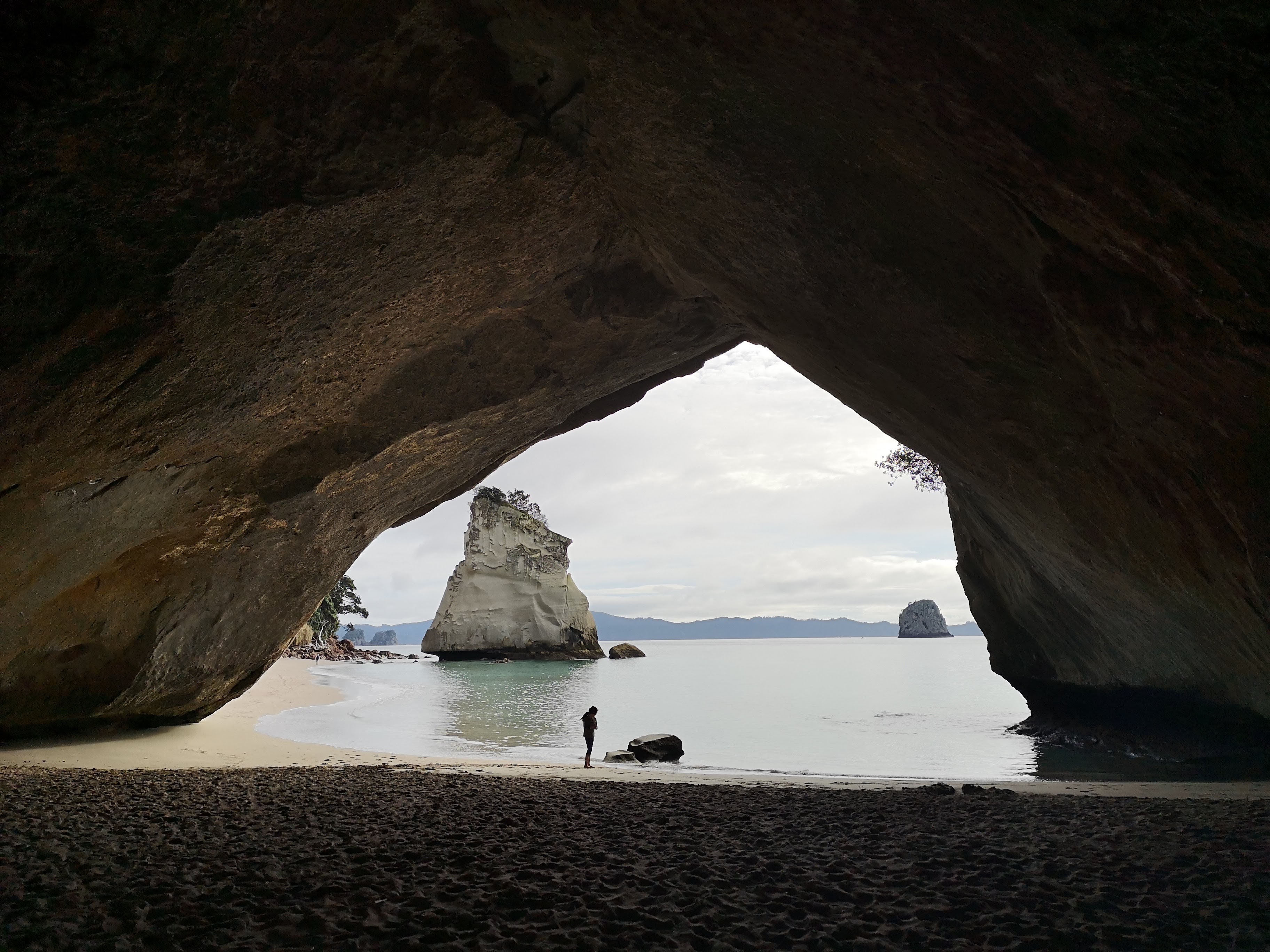 I make my breakfast while Levi tells me how many seagulls he can see. I say goodbye to my new friend. “I’m off on an adventure”, I tell him. I’m sining Moving by Supergrass as I drive away. At least, I’m singing the words I remember. Someone else might not call it singing. Another step closer to becoming my father. I’m on the road at 8:30am. A new personal best. I hope to get to Cathedral Cove before the light gets too harsh. I pull in to the top car park, one van and two cars. Ideal. The pay meter wants $15 for four hours. Not ideal. I drive back down into the village of Hahei where there’s free parking and a longer walk. I’ve come to realise why I like New Zealand so much. The land is tall land the sky is broad. Mountains by the sea. You don’t need to choose when you can have both. I climb back up to the unreasonably priced car park to join the trail. The entire length of the path is paved, it’s better quality than most of the roads I’ve driven down. I guess that’s what you get when people willingly pay silly amounts of money to avoid walking up one hill. I head straight to the end, to Cathedral Cove. I walk through the archway, a single sea stack stands in the shallows. The sun hits the water, turning it mouthwash mint green before returning to grey. At first I’m not sure which bit looks like a cathedral but if there’s one thing I am sure this place is real nice. Maybe it’s the way the limestone cliffs have been carved by the wind and the rain. I can sort of see a resemblance to La Sagrada Familia in that it isn’t finished yet. As more people file down on to the beach I make my return.