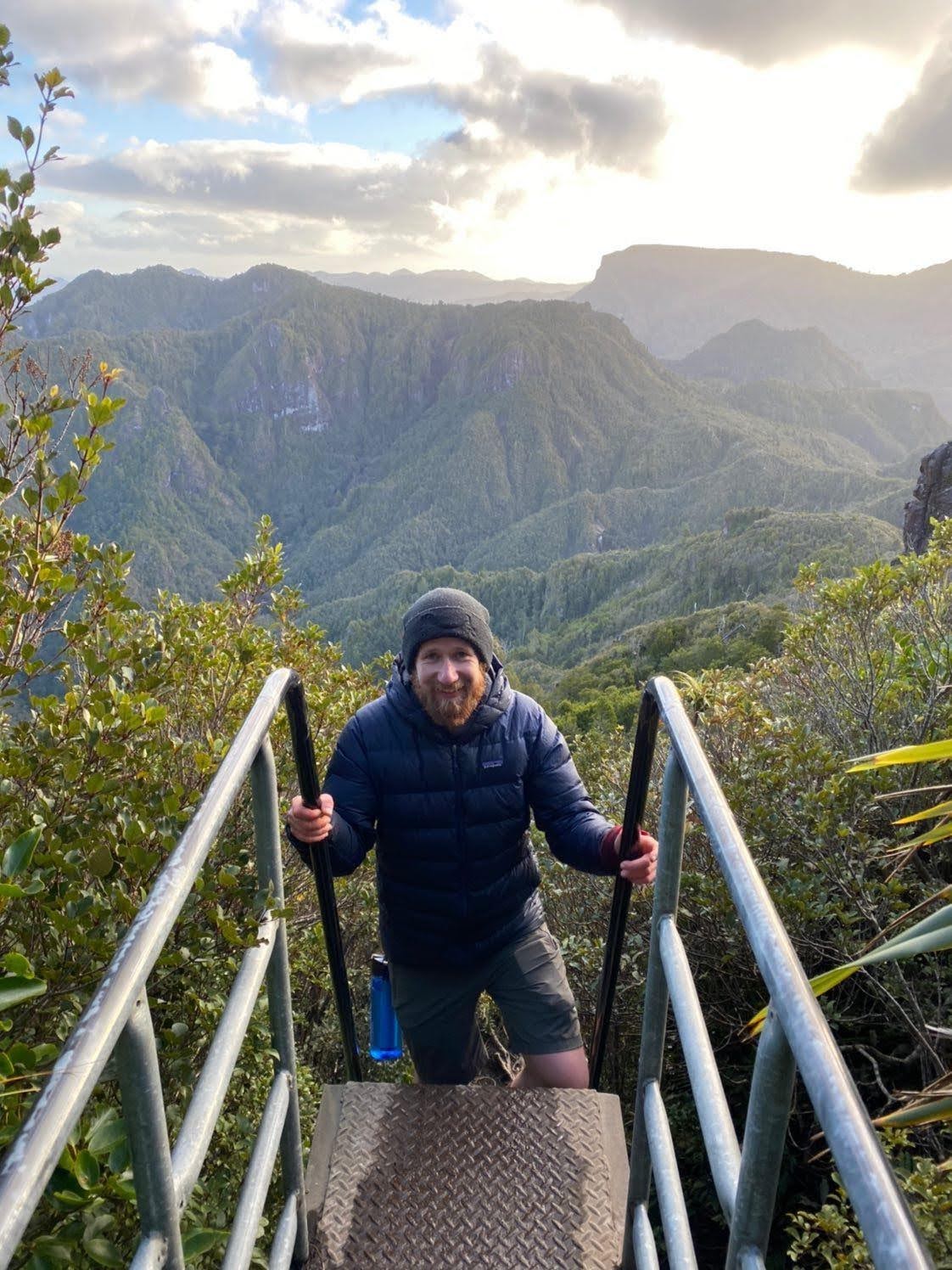 Pike, Kelly and I decide on a good time to make our ascent. Those that have gone up are already on their way back down. Some people haven’t gone at all, presumably waiting for sunrise. I’m surprised. Having the opportunity to do both means I’m going to do both. The final climb begins with an infinite stair case. Off to the left the ground disappears into a rolling valley, unfolding like an ocean of waves until it reaches the sea. Legs pushing up, down, up, down. I’m glad I don’t have my pack for this. I’m struggling to breathe between words I share with Pike and Kelly. We get off the stairs to find the first of a series of step ladders. On the bottom hand rail, the Department of Conservation have attached a hand sanitiser dispenser. Another reminder of the realities over the sea and far away. The ladders disappear and we’re left scrambling over rocks, pulling ourselves up on metal staples drilled into boulders. The view spreads out behind us. Ridge lines, peaks, deep green valleys. The wind has picked up too, blowing the mountain cold deep into my fingers. We reached the platform at the top. We’re the only one’s there. I’ve no idea how 80 people would squeeze up here on a busy morning. The view isn’t quite panoramic, the Pinnacles themselves stretching off the end of the platform. What I can see is more than enough, possibly even too much. The sun descends through the clouds. Rays of light shine down, casting shadows of the peaks into the valleys below. The light show over the ranges is incredible, mesmerising. I can’t stop looking. We’re joined by Matteo, who has come up with his tripod and camera. No doubt he will have some spectacular shots as the curtain closes on the day. The sun disappears behind the mountains. We decide to get down while it’s still light enough to see where we’re putting our feet.