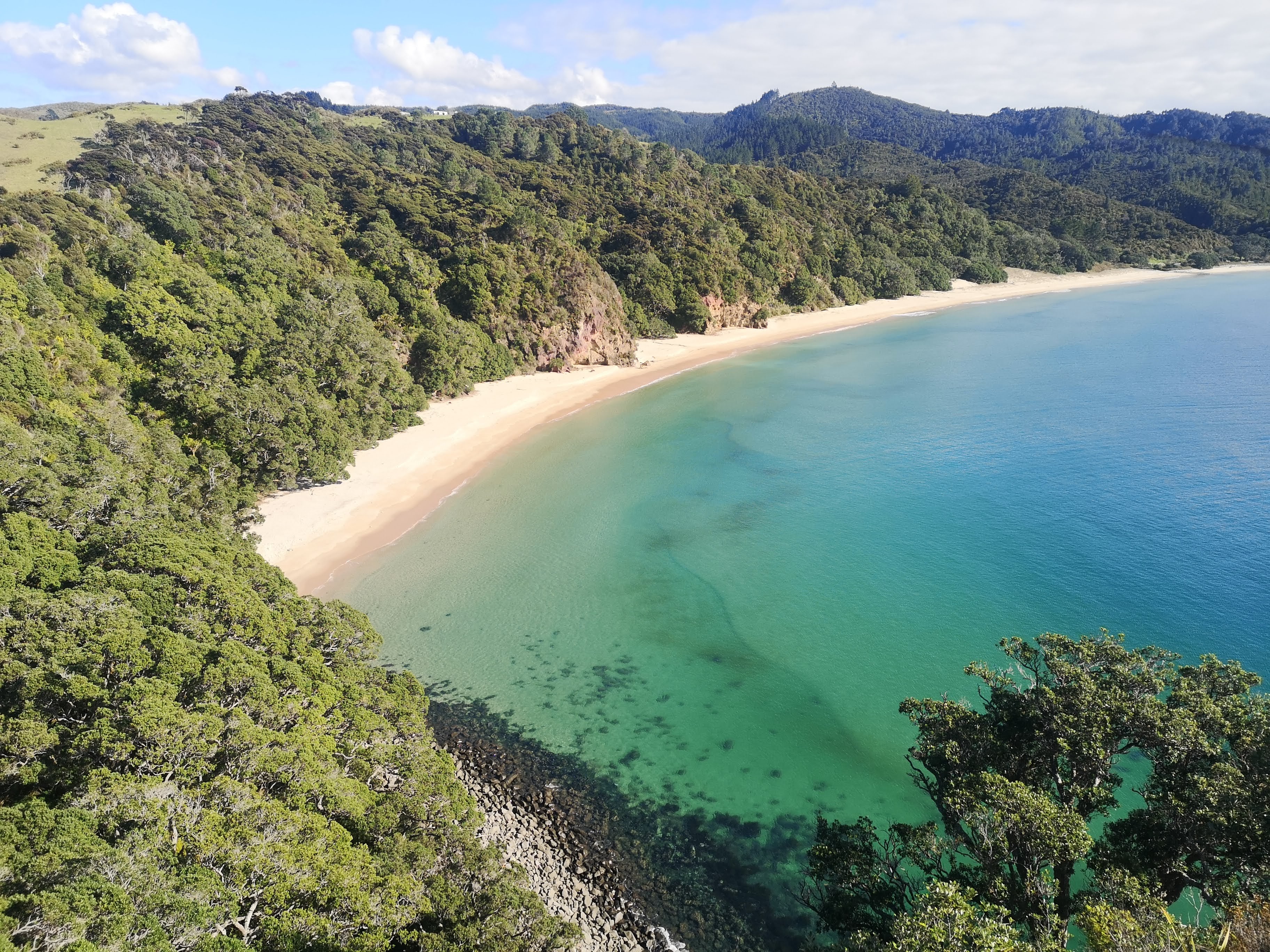 I left Pike and Kelly with instructions to visit the Coromandel Coastal Walkway and the hope I’d run into them again somewhere down the road. I was going to another beach I had skipped on my first circuit of the Coromandel Peninsula; New Chums Beach. When I last passed the turn off for Whangapoua the road was more like a river. Saying no was too easy. This time white fluffy clouds danced across a bright blue sky. Beach weather indeed. On the information board for the walking trail to New Chums Beach there appears to be a crossing over the river estuary. Looking ahead, I could see only the river. Some maps don’t even show the river estuary. I knew the trail head was on the other side of the river, but how to get there? I walked the beach, followed the sandy bank of the river for a while until I accepted I would have to get wet. I sat down, took my boots and socks off. I looked for the shortest, shallowest point. The water was cool, not unpleasant. I strode out, feet sinking into the wet sand. The water reaching my ankles, my knees, not quite reaching my shorts. The tide was still coming in, my return journey would be interesting. I wiped my feet off on my socks before putting my boots back on. Even on the right side of the river the trail head was hard to find. I stumbled up a cliffside to find nothing. I went back down to the rocky beach and followed a narrow strip of pebbles until I found the muddy, well-trodden path I had been expecting to find from the beginning.