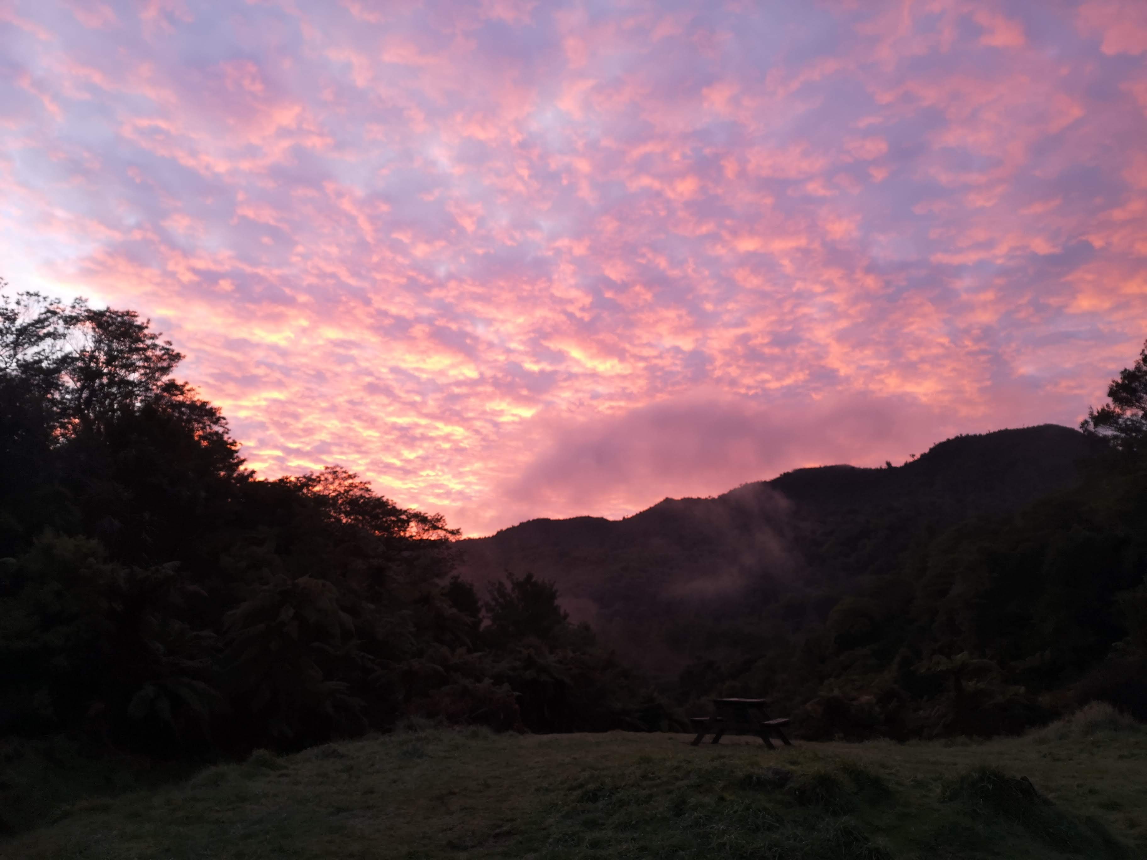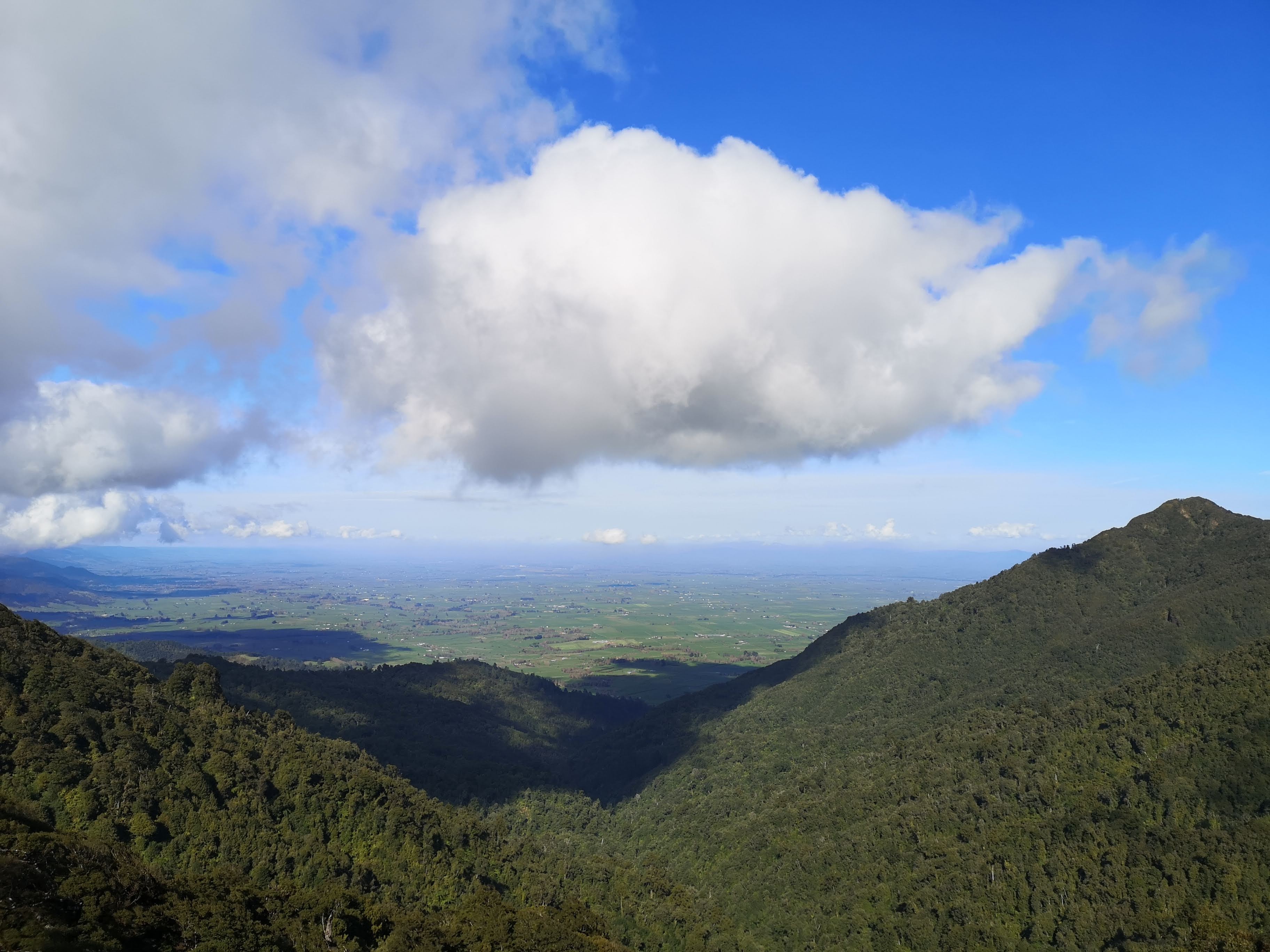I woke up to pink chalk smudges on a purple sky. Mist like clouds hang around the trees. Out of the light at first, the whisps flash pink in the rising sun. I pack my bag, spill half my remaining fresh water, mop the floor, and restock the wood pile. I want to get moving early, having decided to take a different route out. I am going to walk along the Waipapa Trail and then on to the Mangakino Pack Track. The forest is loud in the morning. The birds either disappear or become quiet as the day goes on. The occasional blast of warmth from the sun seems to be accompanies by a whistle or a song from the canopy. The Waipapa Track starts in the same way as the Waitawheta finishes, broad straight lines, bridges over streams. Only once do I encounter a problem. A giant tree has fallen in front of one of the bridges. The trunk has snapped across the narrow gorge. There’s no way through to the bridge. I’m going to have to go down. I step on to what looks like a decent foot hold. As my weight spreads, the soil gives way and I slide the rest of the way down to the stream trickling through the bottom. I scramble back up the other side. Things remain easy after this. I reach a clearing close to Te Aroha Mountain, in the distance the mountains stop altogether and I can see flat farm land. I know I’m nearly at the junction for the Mangakino Pack Track.