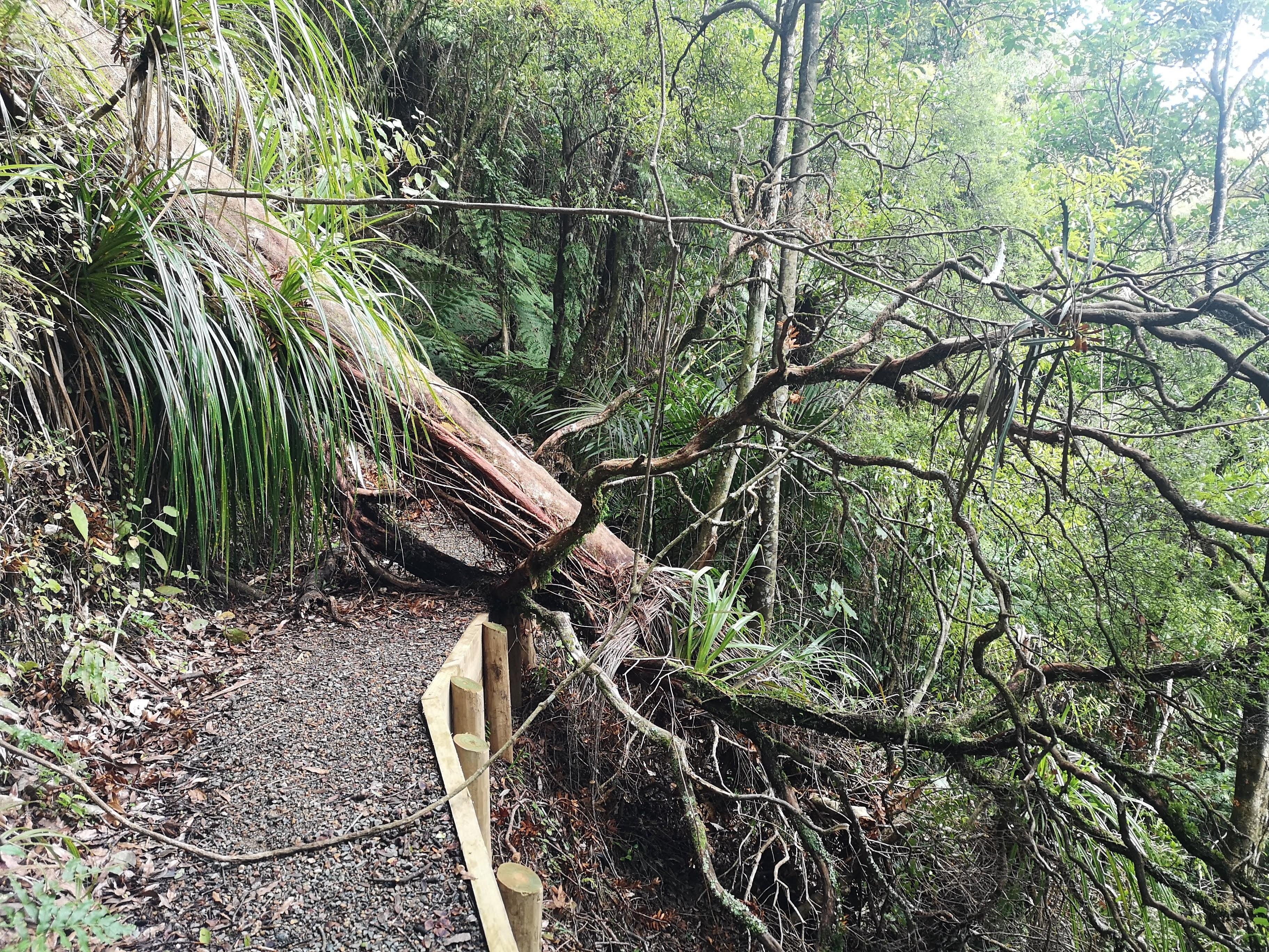 I pass the Mangakino Shelter, I pass other turn offs to different trails. I am still making progress. I’m shocked by the explosion of noise as a Keruru bombs out of a tree behind me. Three of my toes are tingling. I’m not sure but I suspect my first blisters forming. The trail continues to lay down a challenge, throwing up obstacles. Get around this. Get passed that. Each one another puzzle to solve. I reach one tree fall so rotten it feels like a sponge. I decide to go over the top. My legs aren’t quite long enough and I feel myself sliding slowly down the trunk like a fireman in to the gorge below. I quickly pull myself over, back on to the path. I reach a wooden boardwalk, I must be getting close to the end. The narrow track along the gorge side suddenly has wooden buttresses and a gravel topping. I’m flying now. Finally making the kind of time I’m used to. The forest eventually lets me go, I stumble out in to the farm fields above the car park. So close to home.