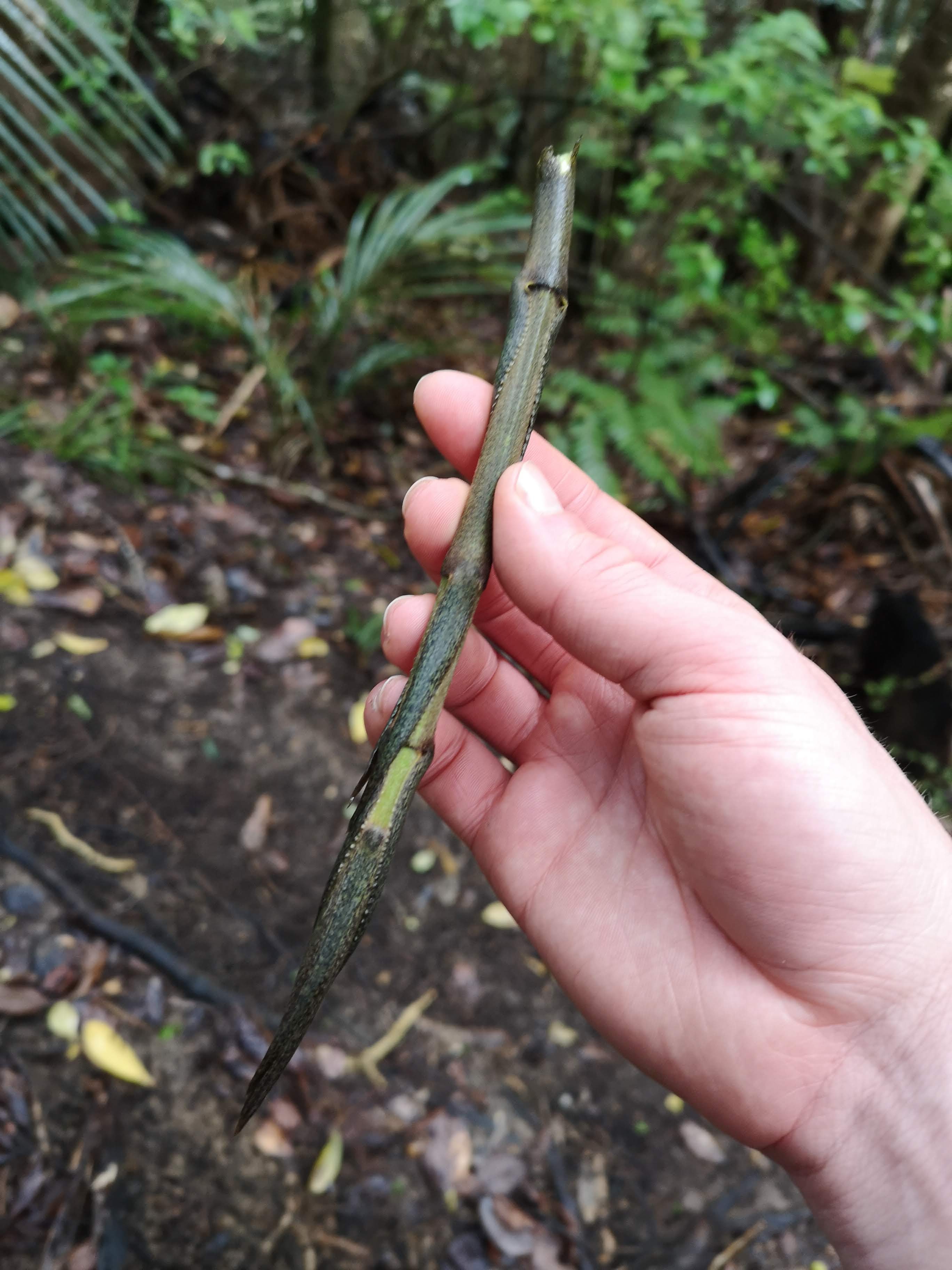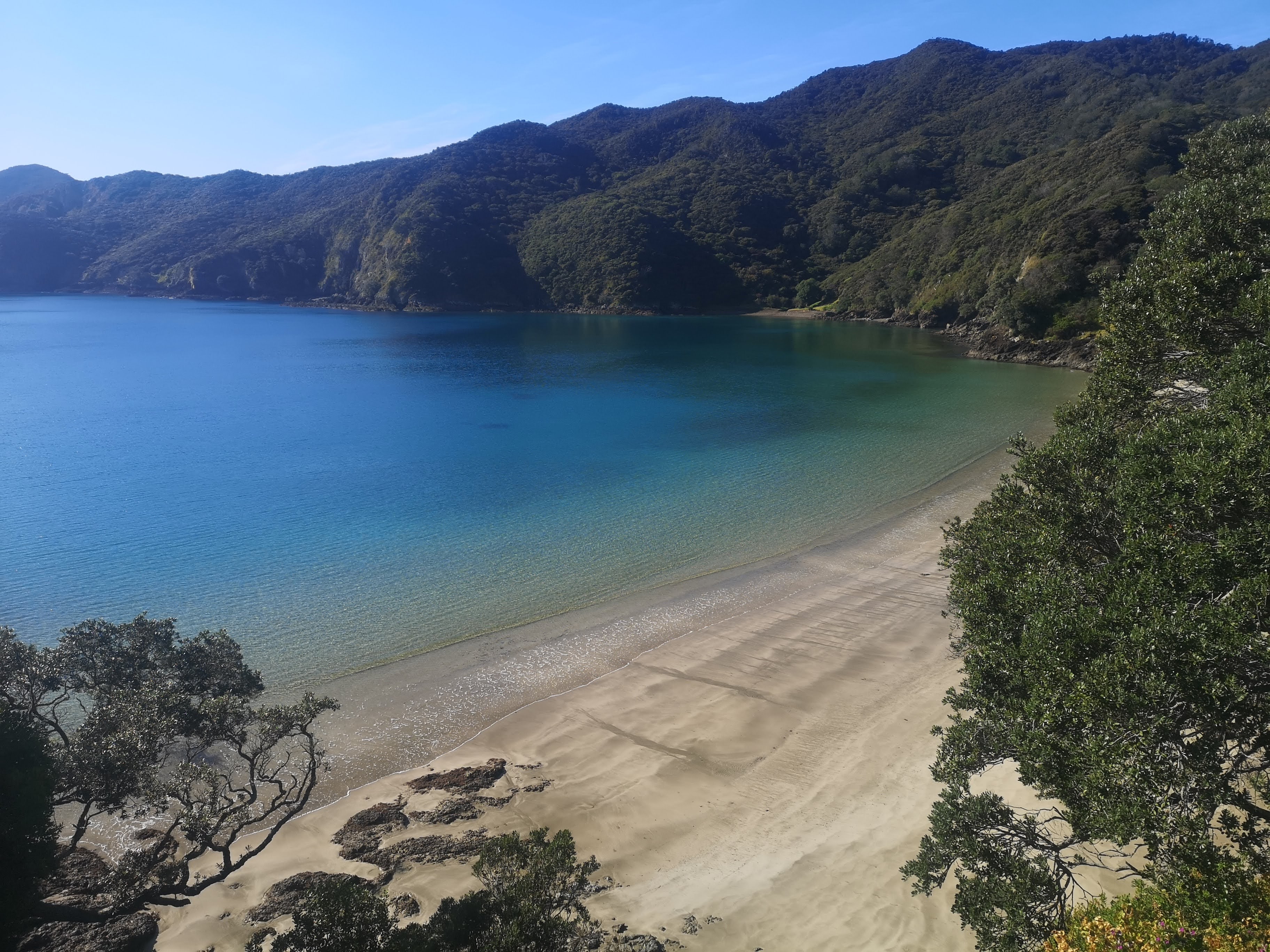In the morning Kiani was up and on the trail while I was still faffing. “See you later,” she said. I was less confident. Another 20 minutes later I was finally on my way. The strenuous final 5km became a challenging opener. I reached the Deep Water Cove junction in good spirits. Down the hill I could see the bright pink of Kiani’s hiking gear. We joined up as she stepped off the trail to investigate a plant. “Eat this,” she said. “It’s bush lettuce.” She told me a mnemonic to remember the name and I’ve already forgotten. Small, green leaves that taste sort of like spinach in that they don’t really taste of anything at all. She points out Kawakawa, a plant I already know by sight and now know by name. The heart shaped leaves full of holes are used in medicine. They’re good for an upset stomach. I’m shown lancewood, which grows as though Moa still roam the forests. Defensive until the leaves are too tall to be eaten. This was great, I was getting an education. Learning more about the forest I’m walking in. Seeing new things. She handed me the new growth on the end of a vine. “This is supplejack, try it, it tastes like green beans.” I’d seen the vines everywhere but never the juicy end. Clearly everyone and everything was snacking on these.