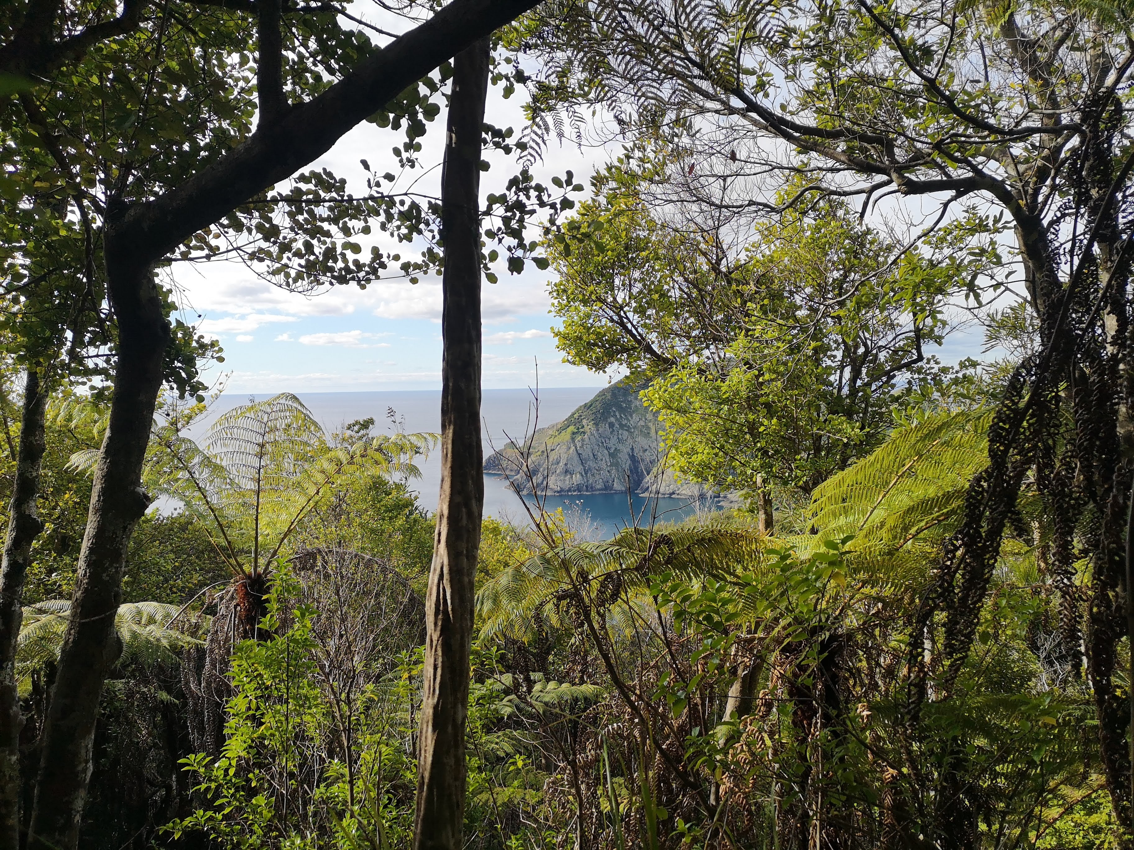 The forest, like the coast, is always changing. Every so often the tree screened views of the headlands and bays of the jigsaw puzzle coast open up and I’m left with sprawling panoramas of the Bay of Islands and the East Coast. I know I’ve complained about the rain a lot, but the weather makes the world of difference. Under blue skies and sunshine it might as well be a different country. Sweat pools. Joints pop. My calves strain to the point I’m sure they’re going to explode. I’m going up again when I pass the first couple coming the other way. They don’t look half as bad as I feel, maybe the trail gets easier. There’s rustling in the bush. At first I assume it’s other people further up the track. Then I realise they noise is definitely not on the track. The sounds seem too big for birds. A black mass bursts from the ferns. I jump as the feral pig plunges in to the understory on the other side of the trail. Still shaken by the unexpected explosion of life, I jump again as a second pig follows suit a few meters on. I pass a second couple soon after. “Pigs on the trail,” I say, instead of hello. They don’t think I’m crazy. “We saw their tracks, did you see them?” the woman asks.