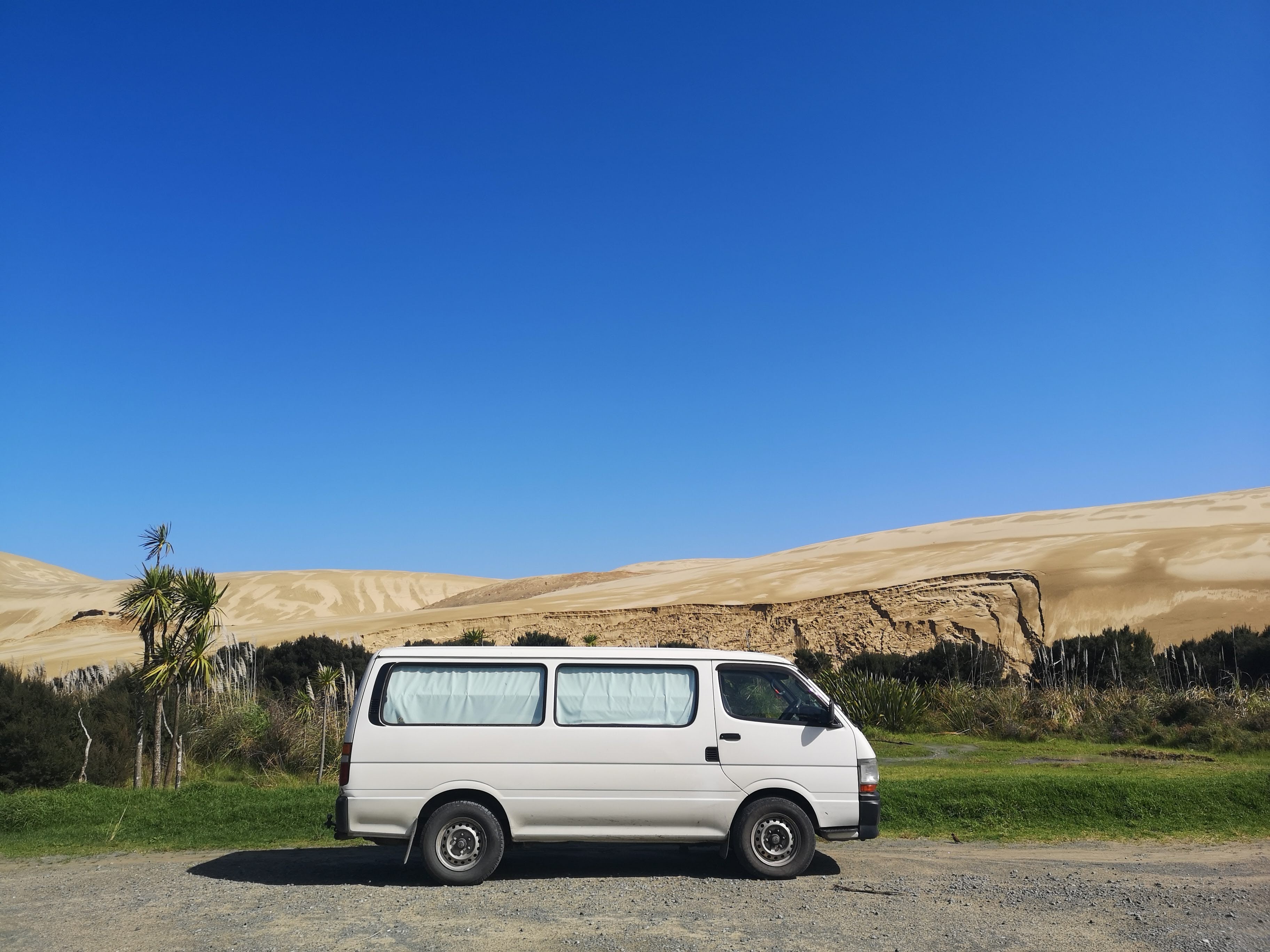The next day I decide I’m leaving no matter what. Predicting the weather has been of no use these last few days. I can’t be any worse off further up the cape. If I don’t go to Spirits Bay now, I may never go. Before I leave, Ellie and Harper share their videos of sand boarding at the Te Paki Giant Sand Dunes. A small human shape at the top of a yellow hill. The small human shape moves forward onto the dune. Moving faster, passing the camera, the camera turns in what is near perfect timing. The board stops moving. Ellie doesn’t. She completes a sequence of fantastic barrel rolls. I can’t help myself. I start laughing. She’s in front of me, uninjured so I feel less bad when I ask to watch it again. I watch three times. “You need to send that to You’ve Been Framed,” I said. Remember those days? When someone would pay you for a humiliating video. They tell me to hire the board on the road-side, the van at the sand dunes was unmanned when they went so had to double back. Good advice. I pull in to a homestead with a hand painted sign that says “sandboards.” I give the man some personal details in case I don’t come back, unsure as to what he would do with them if I do make a run for it with his board. I give him some money too, knowing this at least I’ll never see again.