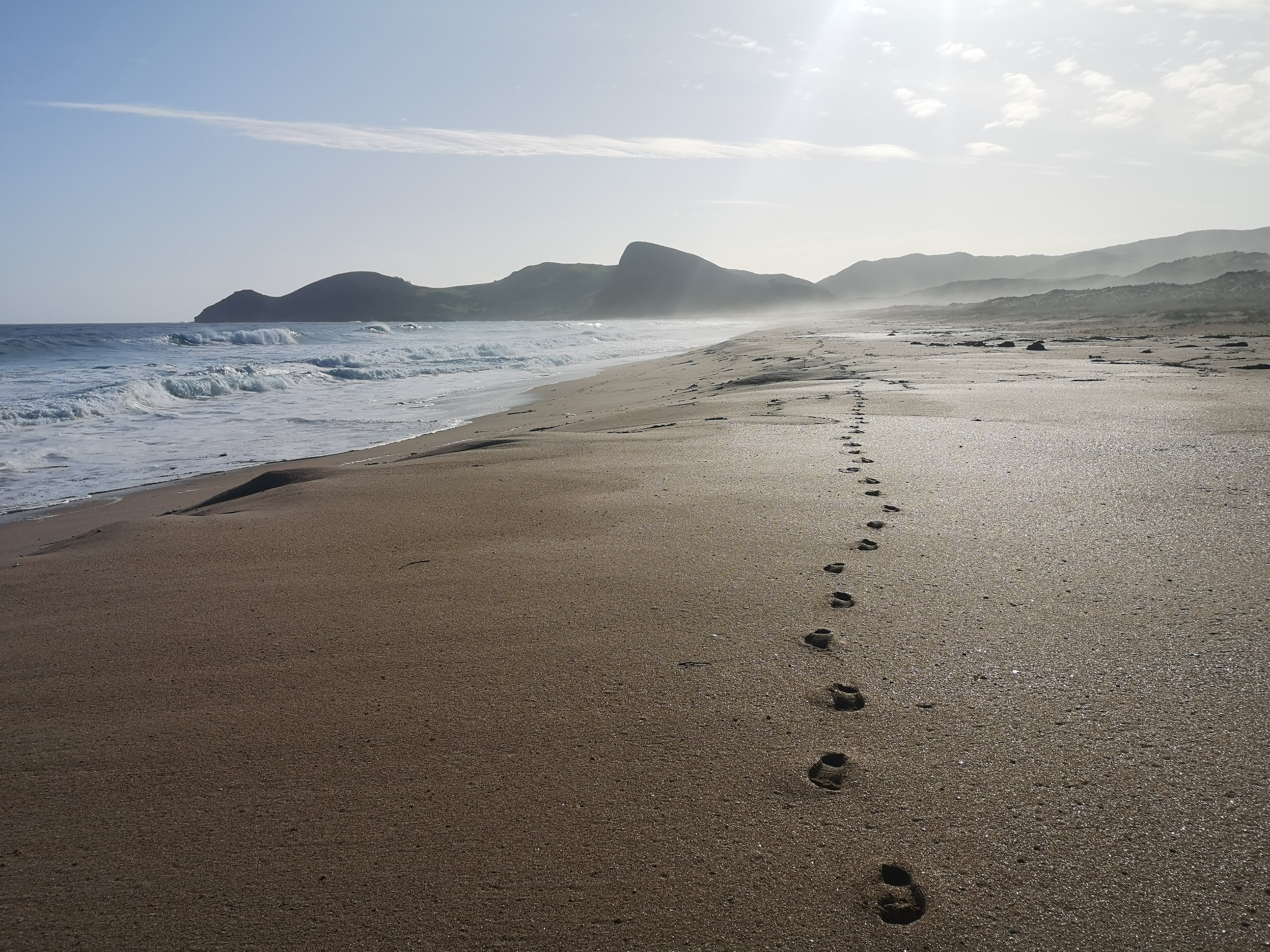 I woke up with my new found time and considered walking all the way to the Pandora camp ground and back at the other end of the beach. After 20 minutes of hard slog across the rolling beach, the soft sand, the hard sand, the broken shells, I agreed half way was probably far enough. I was glad I had not added this to the list of overnight training hikes. The sun was out, the surf driving a sea mist over the hills. The tide line is littered with shells, blue xenomorph heads which must be some kind of jellyfish, and the battered plastic milk bottle caps. I’m only really a third of the way when I turn around. I got back to the highway, turned right to continue North. As I’d come this far, I might as well carry on the extra 20km up the road to see Cape Reinga again. Despite the on-going global crisis, nothing appears to have changed. From Cape Palliser lighthouse in the South, to Cape Reinga lighthouse in the North, with a few others in between, I felt as though I’d finished another journey. I’ve crossed the entire length of the North Island twice. There, and back again. Now I have to hope I’ll be able to do it again. A little faster than three months, but ideally a little slower than two days.