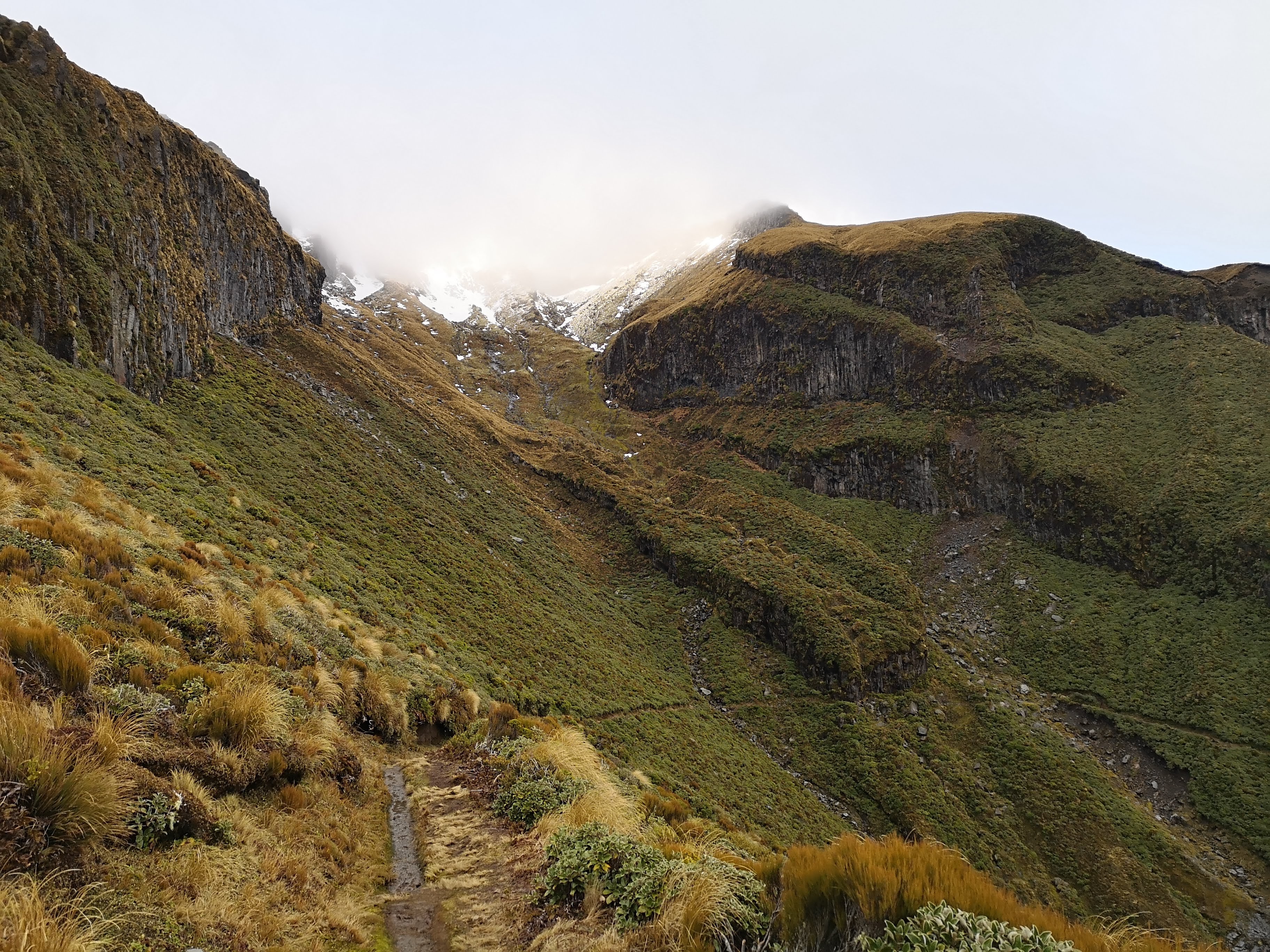 In the morning I didn’t hesitate. No time wasted on the scrolling pocket screen of doom. I knew I had to get moving. I put the final things I knew I’d need in the top of my pack. Toothbrush, down jacket, flip-flops. I checked the time as I started up the Holly Hut Track. 07:15 isn’t the earliest I’ve ever been on the trail but the earliest on this trip. A little bit of motivation goes a long way. Steps make the climb up the Razorback easier. For a while the going up is relentless. As I break out of the bush line into the sub-alpine zone the trail turns. No longer going up, going around. Clouds swirl above the snow line. New Plymouth sits under blue skies no bigger than a smear on my glasses. The visitor centre a series of white dots amongst the green of trees. At my feet, to the side of the trail I spot foam. Only it isn’t foam, it’s patches of ice. A dark stripe rides around the edge of the mountain, the thin strip of the trail cut out of the plants. Wow, I think, I’ve never hiked anything like this before. Forgetting only 18 months ago I was in Patagonia on trails just like this. I passed beneath stacked lava columns of the Dieffenbach Cliffs. Frozen white arms reached out of the clouds, clawing down the mountain side. They don’t get far before they melt, trickling down the exposed rocks. I come to the Boomerang Slip. Pumice rubble turning to sand as black as the beaches. Ahead of me I can see the Pouakai Range, the remains of an older volcano on the site. Behind me, there’s the 2.5km high peak of the current volcano; Mount Taranaki still shrouded in cloud.