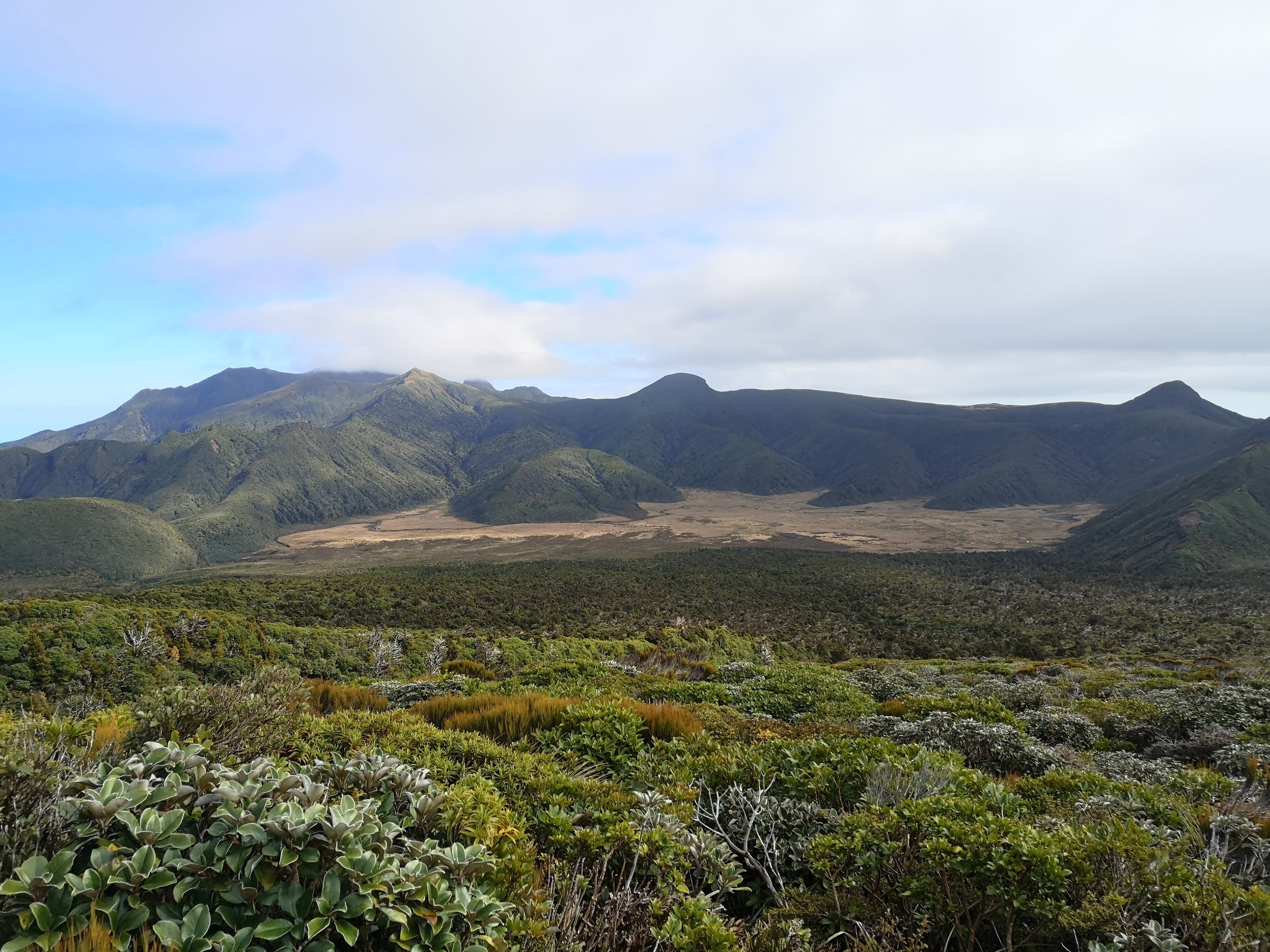 The track begins to descend. Between the old mountains and the new is the Ahukawakawa Swamp. From this distance the golden tussock looks like fields turned to pasture. I reach the turn off for Holly Hut, the bigger hut on the trail with 32 bunks and apparently the added luxury of solar lighting. This isn’t my stop. I reach the boardwalk crossing the swamp. The wooden boards feel like they’re built to float. For the most part they’re under water. I reach a platform where a group of three other trampers are taking in the surrounding scenery. I can’t believe someone set off before me. “Hey guys, did you stay at Holly Hut last night?” I asked. They had. “Many of you in there?”, fishing for information. “It was about half full, about 10 of us are headed to the Pouakai Hut tonight.” I did the maths, me plus the seven others somewhere ahead of me is half full. I tell my fellow hikers the bad news of yesterday. “The hut was full yesterday at midday so I’ll see you there!” I leave them on the platform, sloshing through the swamp. Getting ahead of them reduces the competition for a bed. I slip-slide along the waterlogged planks of the boardwalk. I impress myself with the placement of one foot in the surface water, I manage to spray water up the inside of my shorts.