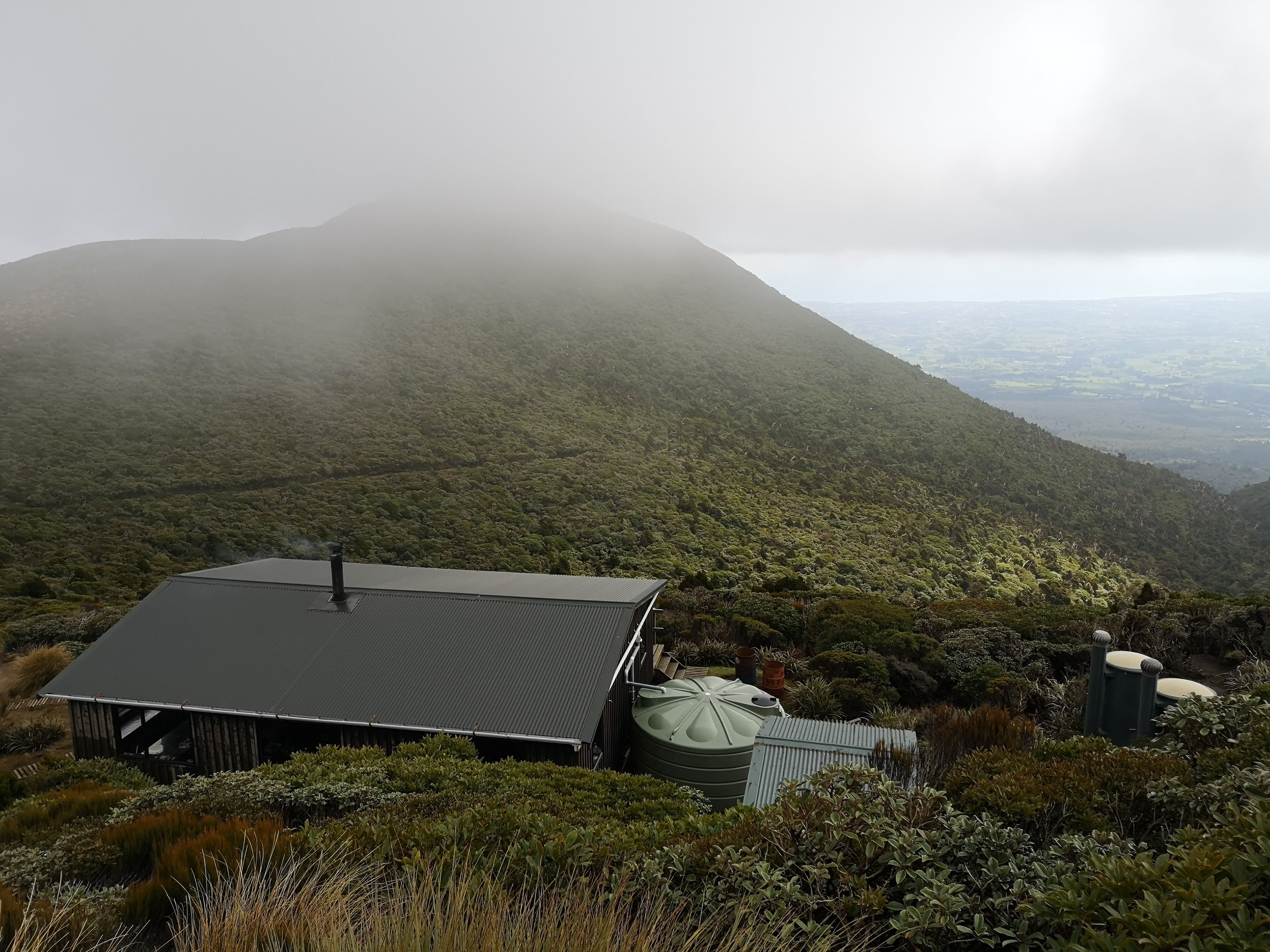 The exit from the swamp is immediate. A new staircase straight up the side of the Pouakai Range. I climb the early flights fast, insistent on putting distance between myself any those behind me. Coming the other way I’m passed by trail runners doing the full 25km circuit in one day. “You, lot, are, mental,” I managed to squeeze out as I scrambled for air. I could hear them laugh as they took two stairs at a time. As the climb continued I slowed. The flattening I was hoping for never seemed to arrive. Between the peaks I found some flat ground. Looking up I could see two people coming down. If the junction to the hut is between me and them I needed to be there first. I picked up the pace. The trail now turning to thick mud. I pulled my feet out to put them back in. The two men came passed, no junction. They were out for the day, no intention of stopping for the night. Two less to worry about. “How much further is it?” I ask, knowing I don’t really want to know but I’ve got to be close. “Ah from here maybe 20 minutes to the hut.” Not yet midday. I’ve given myself the best chance. I reach another peak, up ahead is a rocky plateau with a huge group of people pulling on jackets. I hope they’re leaving. I really hope they’re leaving. Behind the ridge I can see the corner of the hut. Smoke already billowing out of the chimney. At least there’s some good news, the fire is already burning. The group disappear into the next valley. I turn off the main circuit. The roof of the hut comes into view. I’ve made it. The couple on the deck ask me “are you staying the night?” “I sure hope so,” I replied. “Great, there’s plenty of room in here.” I open the door to the first bunk room, only two taken so far. Relief washes over me in an awesome wave. I’ve made it and I’ve got a bed for the night.