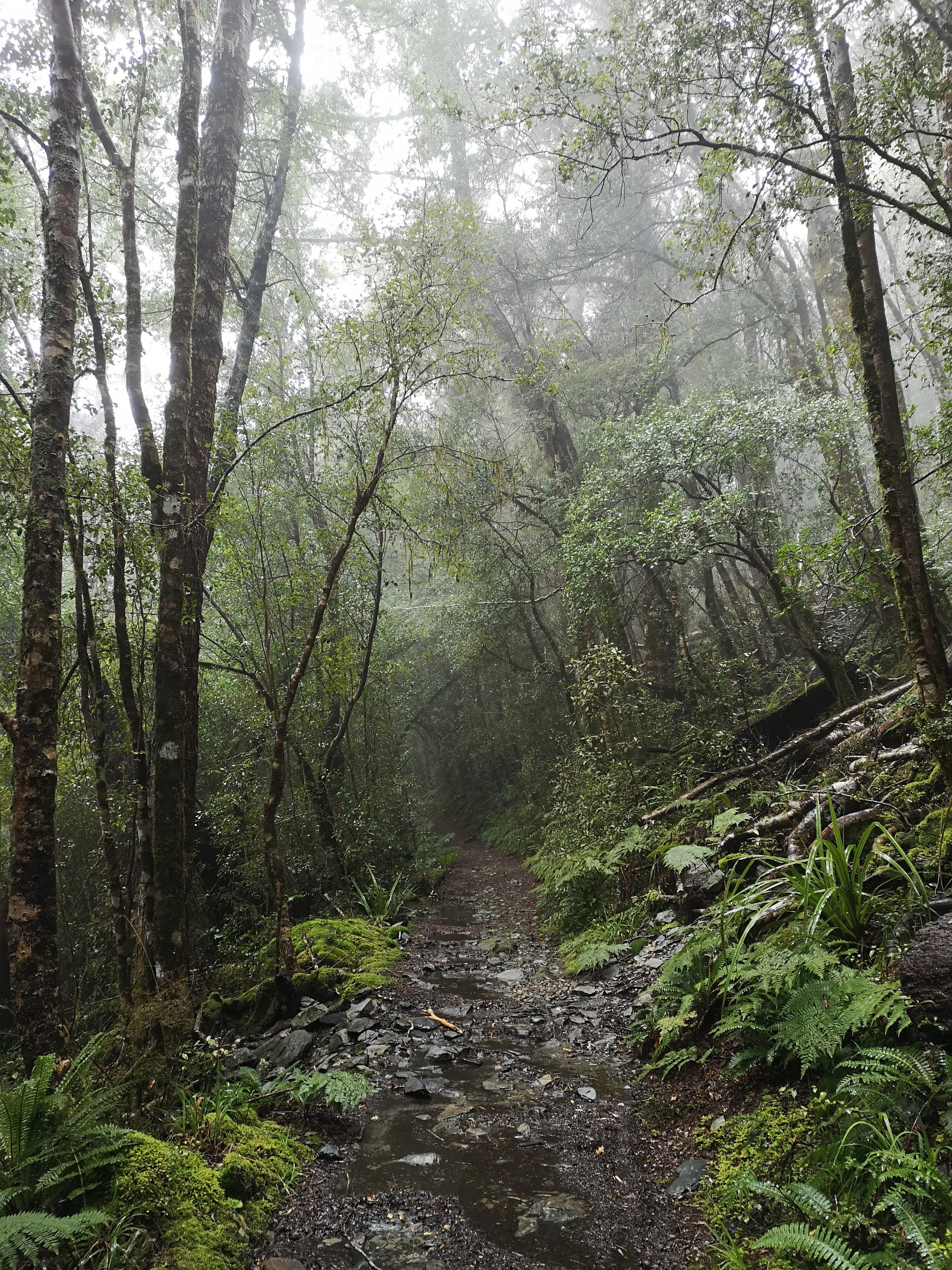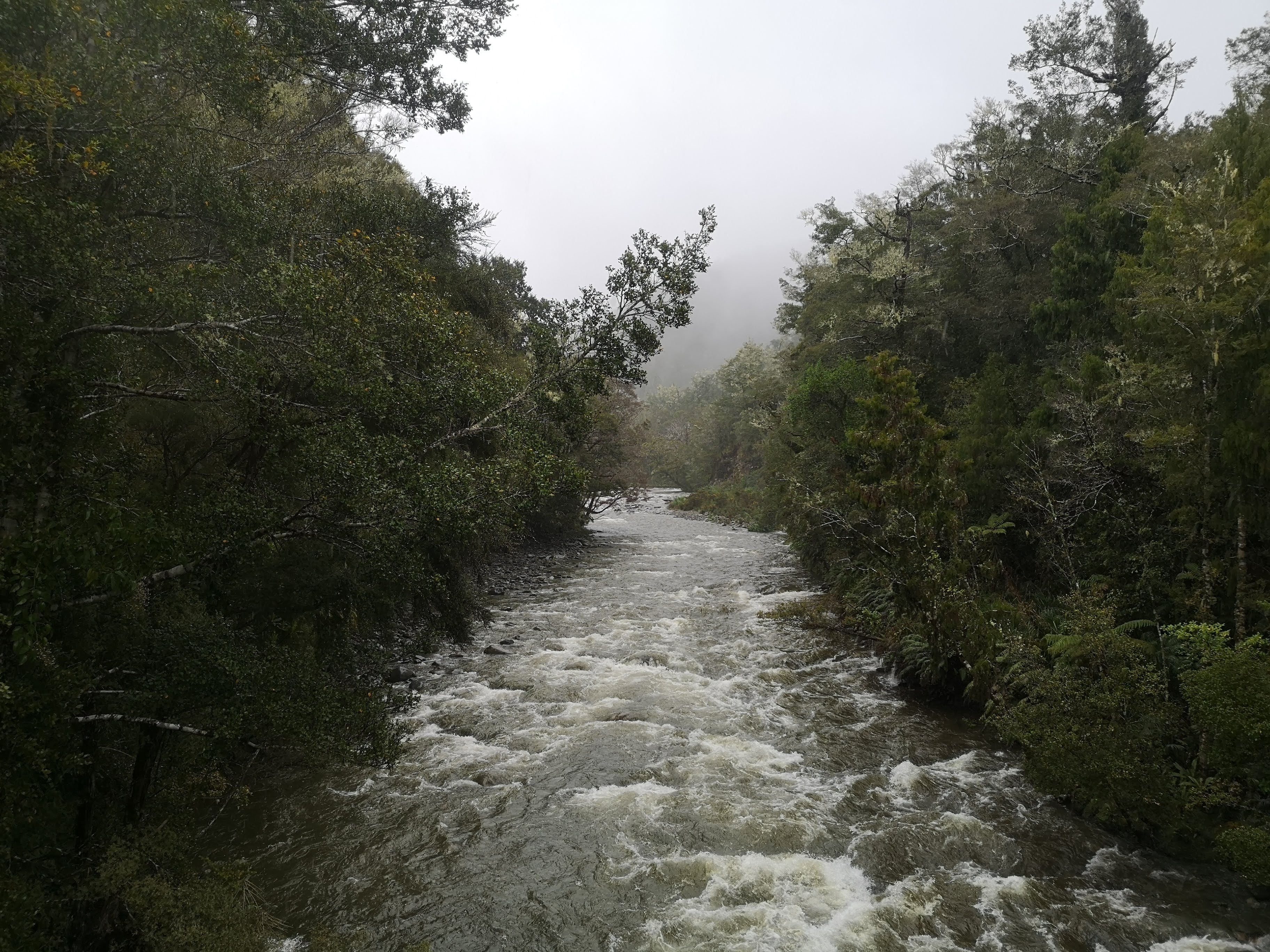 The drive in takes over an hour. The rain never stops. I keep thinking I’ll be alright, I don’t have my tent. At the end of the day I’ll get to Perry Saddle Hut like everyone else and warm up by the fire. I mention to the team how quiet the Abel Tasman Coast Track was. “I don’t expect the huts will be very busy.” We arrive at the Brown Hut car park. The shelter appears to be in the process of being rebuilt. There is nowhere dry to make final adjustments. I rapidly take my boots off, pull my waterproof trousers on. I take the rain cover out and wrap up my backpack. Sufficiently protected from the relentless downpour I set off with one foot in front of the other. The Heaphy Track is like an old English bridleway. Wide enough for an all terrain vehicle, such as a horse. A black horse, with a dark, hooded rider chasing down a nasty little hobbit. In today’s downpour the track also resembles a river bed. The steady, comfortable climb is made more challenging by the deep puddles, the streams gunning off the path. Torrents cascade down narrow galleys, waterfalls pound the track. What should be simple stream crossings are ankle deep. There’s no point in taking my boots off. They’re saturated. My feet squelch as much with the water within as the water without. I check back at unusual sounds, expecting Ritchie and Brad to come past on their bikes at any second. They can’t be too far behind. Between the trees the views are non-existent. Ridge lines disappear like shadows. Twisting, swirling clouds climb up the trees and down the mountainside. Rain beats down. There is no escape. I hear the squeak of a bike brake. Brad comes round the corner, Ritchie not far behind. “What do you reckon, are we half way?” he asks. “I really hope so.” I genuinely have no idea. i know there’s a shelter coming up but I don’t know how far away it is. Maybe that’s half way. By the time I reach the Aorere Shetler I’ve found a puddle in the bottom of the rain cover. Less than ideal. I try to put my bag down without placing it in the puddle so I can attempt to empty out the excess water. I’ll need to try and readjust, to prevent the build up again. Beyond the shelter I get the next break at Flannagan’s Corner. This is the highest point on the trail. I’ve reached the end of the relentless climb from the trail head. I step up on to the picnic table to survey the view. All I really get is a bright white streak on the opposing grey hill which must be a waterfall. I wonder if it’s there when the weather is dry.