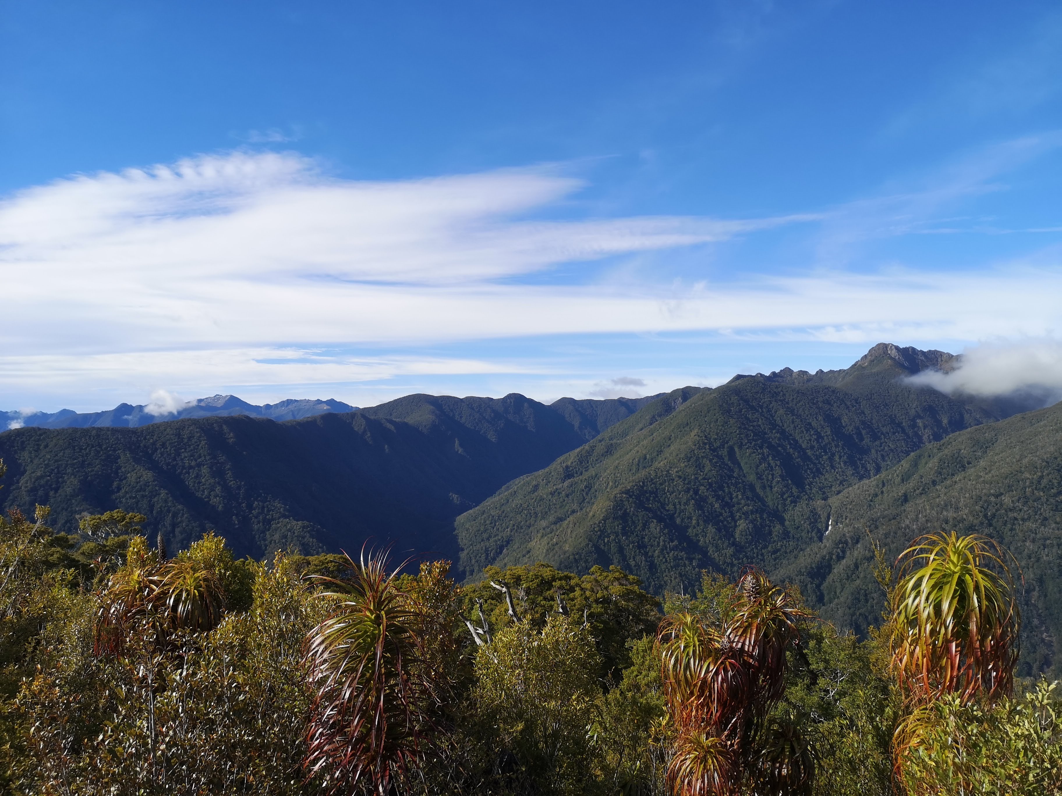 Some of the keys to my hiking success. Go early, go alone. I march through the cold morning mountain air. I descend through beech forest to podocarp. Early light sprinkled across leaves, over moss. A tomtit lands on a branch overheard. The sunlight glistening through the wings of the fly caught in his beak. The depths of the forest moving towards the day. A knotted mass of supple jack vines. Tuis croaking. Other birds chirping. Human voices in the forest sound out of place. I catch up with people I didn’t see leave. Backpacks I don’t recognise. They aren’t those I know. Those I do, I catch up with. While they definitely don’t feed crumbs to a South Island Robin. We watch the skinny grey bird with the white breast fill its beak with human food. It darts off to a nearby tree where it feeds a nearly full grown chick. Eugene leads on, Peter falls in behind him, and then me. Taking pleasure in Peter’s vocal enthusiasm for the outdoors. Isn’t everything just beautiful? Limestone cliffs appears between tree trunks. In the valley below the Heaphy River flows over round white boulders. We reach the 1km marker to the Lewis Hut where our paths separate. The wind catches the aroma of the drop toilets, blowing it straight up my nose. This is goodbye. Eugene tells me to give him a call if ever I need a shower in Nelson. Peter says he hopes I’ll drop by when I walk Te Araroa. The long path passing right behind his bach. At the bend in the river the sandflies hunt in packs. I apply repellent and hope for the best. Alone again I follow the brown waters of the river that shimmer blue under the bright sky. Massive rata trees break up the tropical trunks of the nikau palms. The forest, changing again, for one last time. The alpine environment left behind, somewhere further up the trail. The day becomes warm, has been warm for a while. I pause at a branch overhanging the river, the ends heavy with the nests of common shags. I pass my last 1km to the hut marker. Closing in on the final night, on the end of the trail. There’s enough room for me to save bottom bunks for Susan, John and Cheryl. I started this five day journey alone, I’ve been found myself now attached to groups of others.