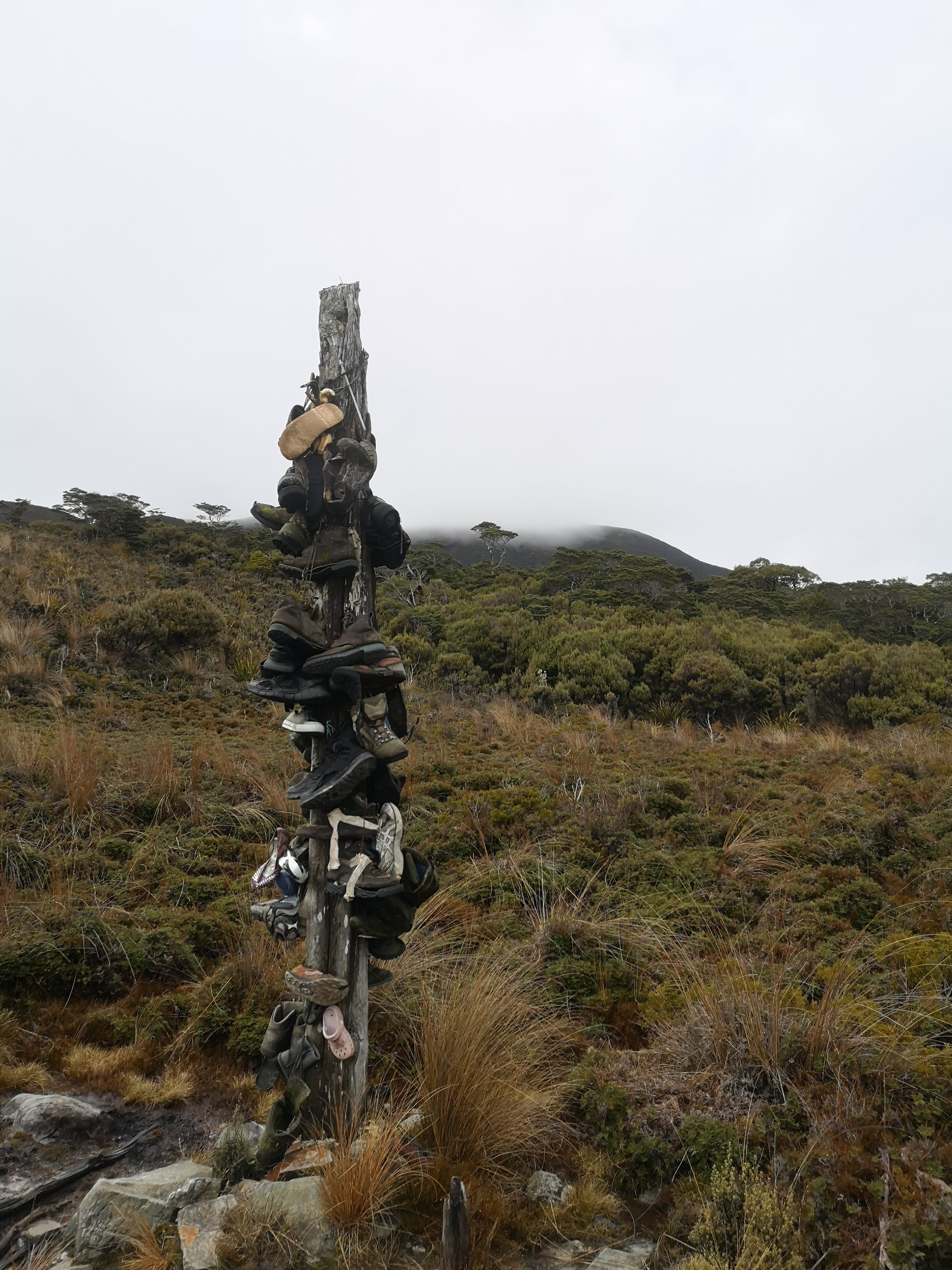 I keep an eye out for the carnivorous snail, Powelliphanta, who might be visible on the trackside after rain. Nothing. Although it’s hard to look for something when you don’t really know what you’re looking for. I open my Real Fruit Dinosaurs. Another trial for snacks; “healthy” gummies rather than dried fruit puree. There are about five thumbnail sized dinosaurs in each pack. A treat but probably not worth the money. Along the rock-lined walls of the track water drips through neon moss. Cobwebs laced with droplets glow like fairy lights. The forest has held on to a lot of yesterday’s downpour. Gouland Downs opens up beyond Perry Saddle. They remind me of the moors back home, only they’re covered with dense, thick, waxy plants. Brown, tannin rich streams flow through the Downs. A yellow sign with a black silhouette informs me I’m now in Takahe territory. Old mate Matt from Auckland told me he’d seen these mega-bigtime Pukekos when he completed the Heaphy Track. One of the wardens on the Abel Tasman Coast Track gave me a similar story. I pass Picnic Bench Corner, where a picnic table sits on a turn in the track. Beyond this is Boot Pole Corner. Another turn, this time with a pole boots strung from it. I am unsure if these are boots which have given up on the trail, or boots people have carried in specifically to hang on the pole. Either way, I was impressed by the imagination behind the names of these two places. I can see the next band of forest up ahead, the end of the Downs approaching. I was convinced I’d see Takahe. Again, nothing. Other birds chirp in the approaching trees. I feel a little disappointed, my expectations were too high. I reach the Gouland Downs Hut. I join Susan, Cheryl and John at their table for lunch, noting the tuna sachets and rice cakes they’re munching on. I crack out my marginally improved hiker’s cheeseboard. A block of Edam, sticks of Chorizo, and a re-sealable packet of sun-dried tomatoes. Not the olives I was hoping for but I’m quite pleased with the tomatoey goodness. A tall (tall for a bird anyway) South Island Robin investigates the spread, filling its beak with crumbs. I nosy around the hut, a rustic affair. Bunks on one wall, open fire on the other. Cosy but not mine. The Downs are split by a small pocket of goblin forest. A carpet of moss covers every surface. There’s a final climb for me. I’m tiring now. The 1km to the hut sign appears. I decide I like this method. Not enough to be discouraging, but one to let you know. You’re almost there. Keep going. Peter and Eugene are already at Saxon Hut. The fire is going. I realise I’m completely dry. I make up my bed on the top bunks among the imaginative carvings of “I was not here” and “Liar”. My sleeping bag is dry too! The pot, I am informed has just boiled. Wonderful. I make a cup of tea, settle down on one of the benches. Nothing to do now but let the day pass by. Listen to the conversation of those around me. Ask questions about what’s that you’ve got there? Oh you dehydrated it yourself? How convenient to have an oven of your own. I hope the evening will bring a few more birds. A weka patrols the outside, picking up anything that looks like food. Pecking at bags to see if they reveal anything worth stealing. I enjoy the diverse mix of company. A pilot, a pastry chef, a banker to name but a few.