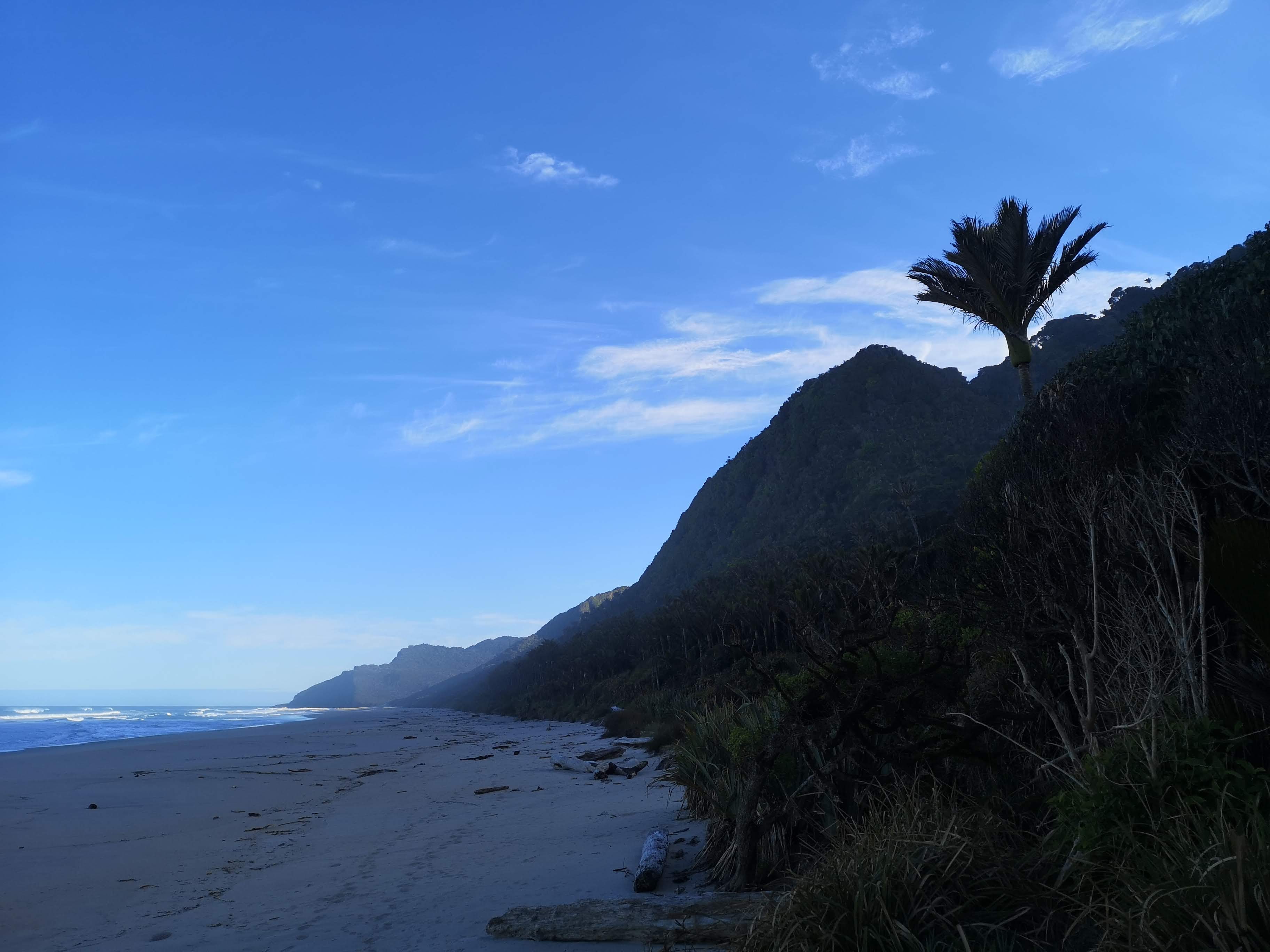 In the morning Jack gets taped up, strapped in and commits to walking out. A few of us exchange concerned glances. 5 hours to do 16km at a hobbling pace. I’m not confident. I’ve got space in my backpack, I’ve eaten my way through the food weight. “Can I take anything out of your bag to make it easier?” I end up with an extra sleeping bag, I’d expected more. No more words can help but I offer some anyway. “Take your time, take it easy. Once I get out the end I’ll drop my pack and come back for yours.” An easy pledge to make when you’re feeling fresh at the start of the day. I head out into the trail. I come across Cheryl and Susan first, taking photos of the lichen growing on the nikau palms. “Ah,” I say as I pass, “the artists at work.” The Midwives fly in behind me, I step off the trail to let them pass. Ok, bye-e. I wave them on. They might still be at the trail end when I get there. I come across John, moving slowly along. One foot in front of the other. I’ve shared bunk rooms, tables, the trail with these people. They’ve made it more enjoyable. Been a salve for the fluctuating loneliness of living on the road. I catch the next bunch. “Did you see the penguin?” Blister Girl and Her Friend ask me. “Are you sure? Looks like a shag to me.” I’m not convinced. “We’ll get a closer look around the beach,” they say. I carry on walking through the palms, keeping one eye on the bird in the surf. The penguin spreads its wings in a black iron cross. I laugh out loud. My eyes are better than I think. The beaches of the West Coast are incredible. Short surf, golden sand backed by rising peaks covered in coconut-less palms. Swing bridges cross rivers that sing over sun bleached pebbles. Sea mist climbs into the valleys. Sun light sparkles through the palm fronds.