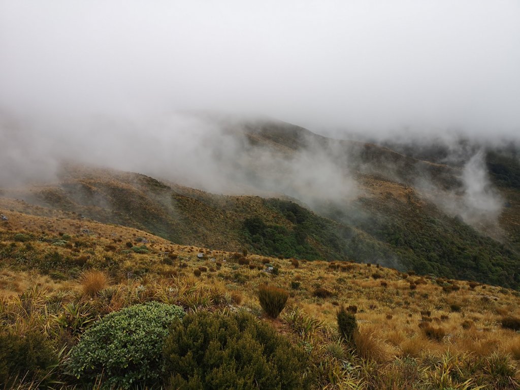 I slide past the Three Ladies while they stop to regroup. “Put the kettle on! Get the fire going!” are the instructions called to me as I move on towards Pororari Hut. I arrive as James the Warden is finishing the clear up from the previous guests. I take the same bunk as the night before in the carbon copy hut. We’re likely to arrive in an almost identical order. The Three Ladies arrive while I’m still setting up, I’ve done neither of the jobs. I let them get settled and start on the fire and then on the kettle. Pockets of blue sky appear. The first in two days. The lower ridgelines emerge briefly from the clouds, still pointing up in to the sky. Disappearing again as the cloud climbed higher.