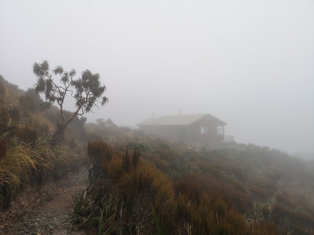 The trail climbs steadily. Leaving the forest, climbing above the clouds. The 1km to the hut post is nice but it’s not my hut. Ces Clark Hut is full and not with people staying there. This is my completion for bunks at Moonlight Tops Hut. I decide not to stop, to get ahead of this Gang of 11 and claim a better bunk. Spectres whisp across the tussock. Hillsides come and hillsides go. Black forest fades to grey, disappears into the sky. Orange warning poles with black exclamation marks are I guess for the cyclists. Stream pools. Dips in the trail. A low tree. The open, exposed, windswept tops. I finally find my good boy mentality. Enjoying simply being outside, being alive, being absolutely battered by the weather. Wind drives the clouds up the ridge, punching like a train. The bad weather is good for something, I don’t hang around for the view. Is it fog? Most? Cloud? Whatever it is, it blows across the trail. I see just once the bright white of the ocean far below. The rocks on the trail are now coated with water. I come across the for me this time 1km to the hut post. The uplift of mood complete. I arrive before the crowd. Three Ladies are already here, lighting the fire, putting the kettle on. I hang my wet hear out which thankfully doesn’t include my sleeping bag. I finally crack out my lunch.