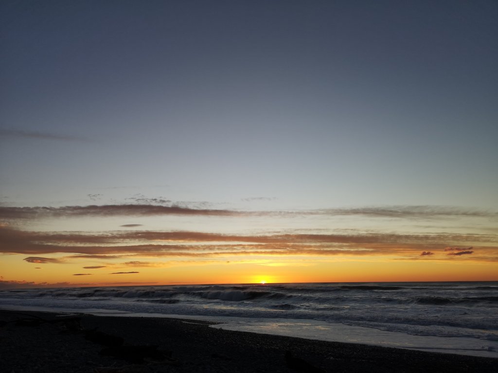 The rain comes down again overnight. A never ending pounding on the roof. I must have slept at some point, I have the lingering memories of things that aren’t real, of places that don’t exist. A wet Sunday with nothing to do, no place to be. The rain is eventually replaced by a cold, gusty wind. In these parts it’s known as The Barber, presumably because it’s like getting a haircut only the scissors are freezing and they cut to the bone. So much for getting the doors open. The wind at least drives the clouds away. The Southern Alps stretch down the coast. Ridges overlap up the Grey River valley. Spots of blue appear in the sky. I decide to layer up and go for a walk, remaining in flip flops but this time opting for my down jacket and beanie. Aside from the queue of people on the platform waiting for the Transalpine Express, Greymouth is a ghost town. An industrial wasteland built on foundations of coal and timber. The work here dried up long before the recent border closure. There doesn’t appear to be much in the way of tourist activity. Greymouth is between places, somewhere you might stop on the way to anywhere else. I head out to the breakwaters at the river mouth. Barreling waves explode over the rocks. The boom of the break roars down the coast. The wind racing down the valley catches the white water, pushing the waves back and up. They break in half, a white mist blasting up into the air, what’s left crashes down. I start to taste the salt on my lips. The long black figure of a surfer catches the edge of a curling wave before being obliterated by the falling water. In the gap between the clouds and the ocean the sun breaks free for the first time in weeks. The light is painted across every surface. The clouds shift through yellow to pink. The black strip of mountains topped with white snow, topped again with mountains of grey cloud topped once more with the last pink light of the day.