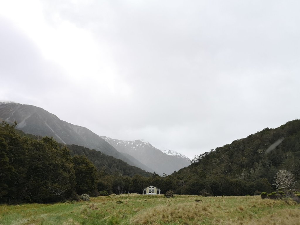The St James Walkway is a good reminder of how well maintained, and really just how easy the Great Walks have been so far. I’m back to climbing up and down tree roots. Completely submerged sections, including what once we’re strategically placed boardwalks that may never dry out. I find a hole in one of my boots, or more accurately the water finds the hole. I take a while to get used to the extra weight. Mattress in case the bunks are fill. Gas and stove. I’m glad I didn’t pack the tent as well but I feel like I’ve forgotten something. A fart later and I remember. Toilet paper. I thought about it at one point but never got around to actually bagging it. I’ll have to hope the toilets are supplied, or there are generous people at the hut. I spend the first day in beech forest through Cannibal Gorge. This particular valley got the name thanks to all the human remains found in the area. Left overs from old victory feasts. I come up on an open field of grass pretending to be solid ground but actually hiding masses of water beneath. At the forest edge is a postcard view of Cannibal Gorge Hut flanked by broken knuckle peaks. Too soon to stop for long. I carry on into avalanche country. The cloud is fairly high, I’m delighted to be able to see any of the mountains at all. Signs everywhere warn not to stop in winter. It isn’t winter anymore. I don’t mean to stop myself but I slip on the lubricated surface of a rock in the creek. Hands plant, legs spread. I’m not in the water at least and I don’t appear to have even broken skin. A lucky escape. Please, pay attention. The serpent trail weaves through the moss, the scales on its back the silver of stone, the brown of beech. Where creeks cross the trail, the brown gives way to the silvers and greys of the river rock.