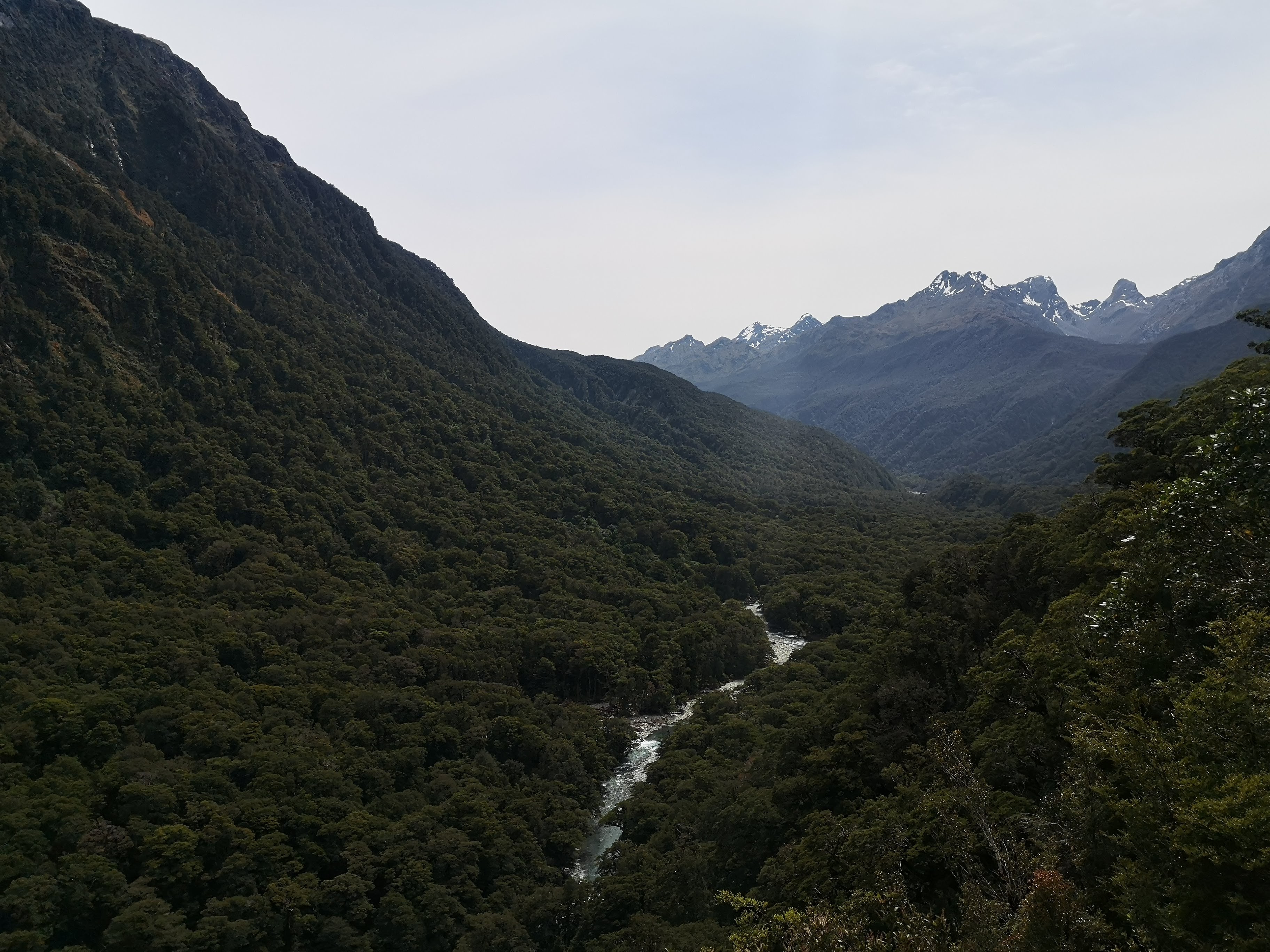 In the morning I wake up cold. I am never, ever going to put the blanket away. The temperature has to have dropped to a single figure. I don’t want to get up, but I also want to go for a run. My fingers and ears start cold. My lungs burn. The morning is clear, hence the chill. No clouds hang over the Kepler range, another good morning for those up in Luxmore Hut. I take several wrong turns through the marina, I might accidentally run further than the 5km I planned on. Not by much. Back at the Te Anau Lakeview Holiday Park I slowly wrap everything up and away in the van. I’m pleased with this site. Coming back in January when I walk the Milford Track is an easy decision to make. I haven’t quite figured out what next or for how long. North again to walk the Rees-Dart Track or float around the South until I cross over to Stewart Island? I go to the shop, buy enough food for the next couple of days. Fill up with fuel just in case and then head off towards the end of State Highway 94. I pass through farms along the way to Te Anau Downs where recently sheered sheep look like peeled potatoes on sticks. Then I’m back in the Fiordland National Park. The beech forest, a tunnel of green. Out of sight, the mountains climb higher. In the pastoral plains the road disappears down the valley. The impenetrable walls of rock climb ever higher, closing in on the road. There are so many places to stop. Beyond the Divide, past the turn off for the Hollyford Road things get ridiculous. Fortress like mountains all around, glistening gullies dry for now. Road works are everywhere, probably all year round. Those at the end desperate to keep the road open.