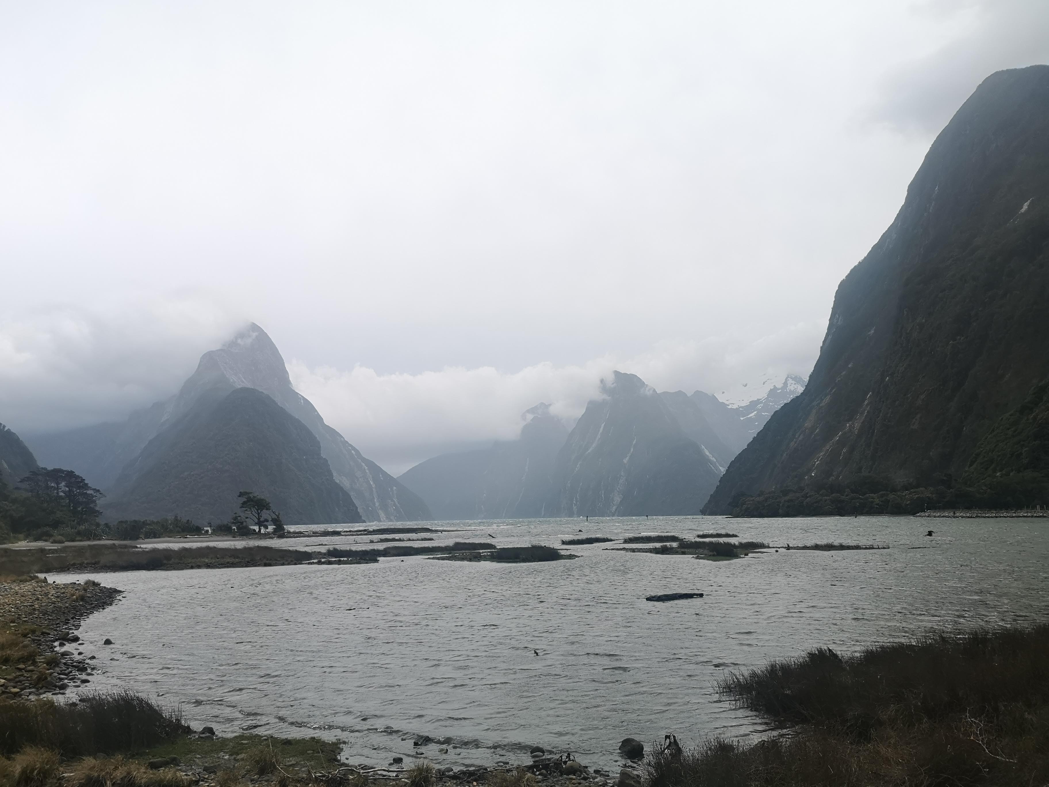 Snow sits thick like chipped white paint in the dizzying heights. The road sidewinds. Along the river, around slips. So many shoulders and car parks are closed. I stop in the ones remaining open, take photos, laugh at my surroundings. A landscape carved first by ice and then by rain. These things appear so permanent yet are so easily washed away. There are a couple of cars in the Gertrude Valley car park. I’m too late in the day and I don’t trust the weather to hold. There’ll be another opportunity, I have to come back again, to walk in through the Milford Track. I drive through Homer Tunnel. Tunnels bored through mountains might really be the peak of civilisation. A proper, actual, conquest of the Earth. We have not been stopped. We have made the journey shorter, easier and mildly terrifying. I come out clean on the far side and I have to pull my jaw back up off the pedals. I have seen this view before. This is not new to me, and yet I am still floored by the the drop down through the final valley. I fall into Piopiotahi Milford Sound. I drive in to the car park where my registration plate is recorded on the camera and I am forced to pay $20 for the privilege of parking here. I should have thought more about staying in the campground and paid an extra $10 for the night. I walk around. The sky threatens to break at any moment. The cruise boats pull in and out of the harbour. A handful of tour buses in the 50 bus car park. A weekend crowd in full swing but nothing like what it could be, were anyone allowed in.