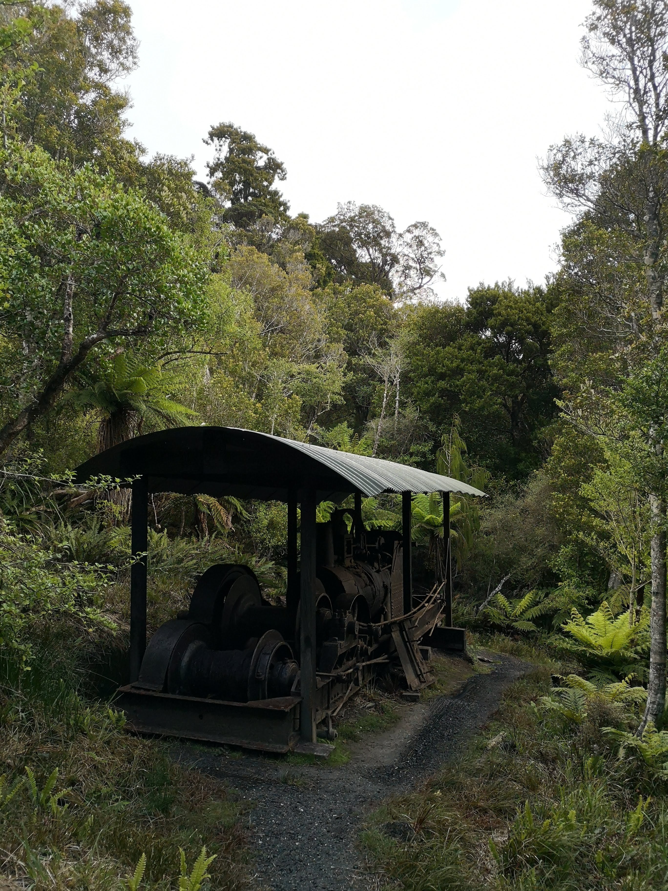There can be few things as satisfying as waking up to find the forecast rain still hasn’t arrived. The tent is dry. The tent is still here, in one piece. Several victories to celebrate. I drop the tent while the air remains clear. Everything else can wait. The tea towel I left hanging in the shelter has departed from the hook. Maybe the wind claimed one victory. I look through the nearby bushes to see if it’s caught anywhere. A minor inconvenience to have to let things air dry. While I’m cleaning my teeth I spot it, trapped beneath the shelter wall and the floor. Take that, wind! I am walking out of camp at 9am. Grey skies hang over head, the threat of rain is imminent. This is another short distance day that I expect to be over fairly quickly. The Rakiura Track doesn’t have the same “oh wow” factor that the other Great Walks so far have had. It is a three day bush walk, that at a push, could be completed in a day. There are no big climbs, no river crossings, the only thing anyone talks about is the mud. The mud comes. The gravel disappears. Black netting that may have once held something like a track together passes through the puddles. In the end, the mud isn’t all that much to worry about. Maybe I’m lucky, the last few days have been dry. This isn’t super squelcher territory. There are many other routes around the worst of the mud. The one miss-step I take places me ankle deep in bog. The mud sucks on my boot, the bottom of my gaiter and I pull myself free. The poles, however, i lose more frequently. This at least is a benefit of a quiet, mostly well formed track. I can learn a little bit more about my new equipment. How to get the best out of them, or at least how now to avoid getting them stuck. My rhythm on the flat is mostly good, on the slight ups and downs I find I start thinking too much. Adjusting the length at every change in gradient seems wasteful so I power on through. The bush at least maintains its power over me. Deep greens, tall trunks, a mix of tree ferns and Rimu. A fallen rimu bridges the path. The vines of a rata wrap around the split, building a new trunk that rises to the canopy. Nothing is wasted in the forest. Dense groves of juveniles cling together. In areas that must have once been cleared for milling Manuka scrub forms the canopy. Scattered throughout the bush are the rusted remains of a dying industry. Bruce told me “you can either remove the rubbish from the trail or you can put up a sign and call it heritage,” which seems to be the case here. The signs don’t explain why the machinery was left to rust. Like carrying your rubbish with you, it would always be easier to leave it behind. The Boys let me pass. I don’t think there’s anyone else on the trail ahead of me. I’ve seen no one from the hut. You wouldn’t know it was there if you didn’t know it was there. One other family passes going the other way. For a Great Walk, I feel remarkably alone. The track is endlessly quiet.