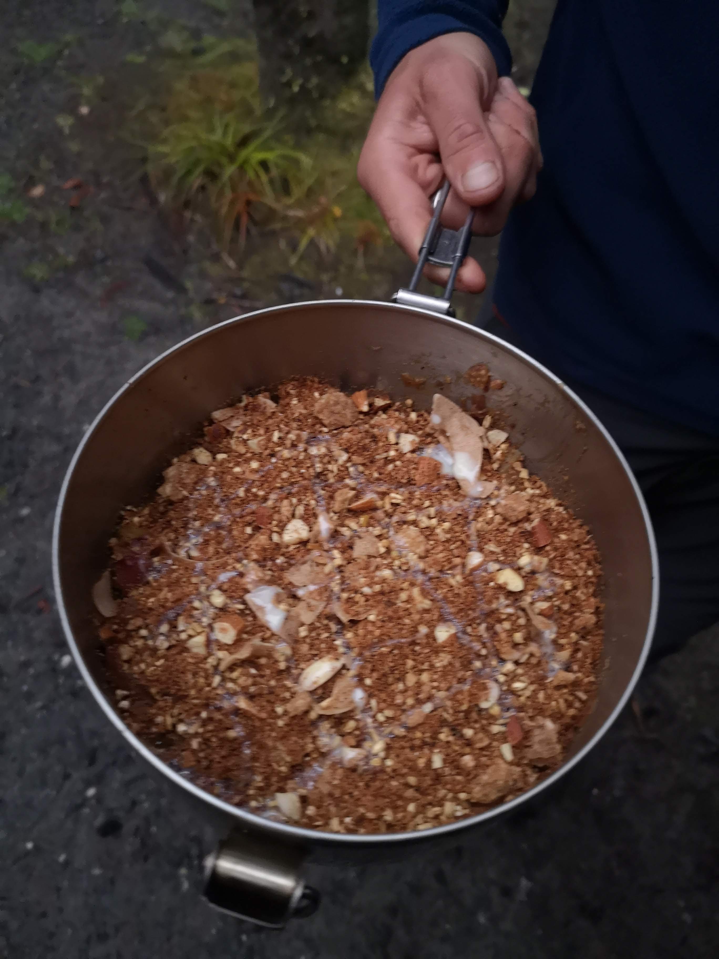 The sky finally lets go, rain starts to fall. The trees play their own song. Creaking and squeaking in the wind. I hold off on putting my waterproofs on. I can’t be far away. For now, the rain is refreshing. A 5 minute to the camp sign appears. I step into the shelter as the water flows heavier. Another man, one I haven’t seen before comes in just after me. “Perfect timing, eh?” he says. “We beat the rain.” Indeed we did. Nadav brews coffee in his pan. I’ve heard of this technique but never seen it done. The rolling boil helps the grounds gain weight, they settle in the same way they would if encouraged by a plunger. He lets me have a taste. Not bad. In fact, it’s pretty amazing what you can do without equipment. He disappears towards where I think the sea might be. There were rumours of good mussels. I wouldn’t know what a good mussel looked like, or how to remove it from the rocks. Nadav comes back with a small bucket full of shells and invites us all to try his ocean bounty. The Boys are having apricot crumble for dessert. Nadav thinks he can make an apple crumble. I’m interested. I have an apple. The Boys contribute some condensed milk. The other couple add some cinnamon oats and dark chocolate. Nadav puts me to work. I chop the apples, a handful of dates, some almonds. The apples go in one pan with a splash of water, a squirt of condensed milk and the dates. “And what are you doing, while I do all the work?” I ask Nadav. “I’m waiting for the apples to soften before I toast the crumble” he declares. We call the other’s cooking skills into doubt, which is brave considering neither of us know how this is going to turn out. The rest of the shelter guests are kept entertained at least. Once Nadav is happy with the texture he begins to fry the oat mix with a Nature Valley granola bar. Now that the apples are done we kill the heat, put the dark chocolate over the top. Nadav sprinkles the crumble on top. We are all of us impressed. The apples are soft and sweet, the chocolate is chocolate, and the crumble is crisp. We would have struggled to do as well in a fully equipped kitchen. Everyone has several spoonfuls.