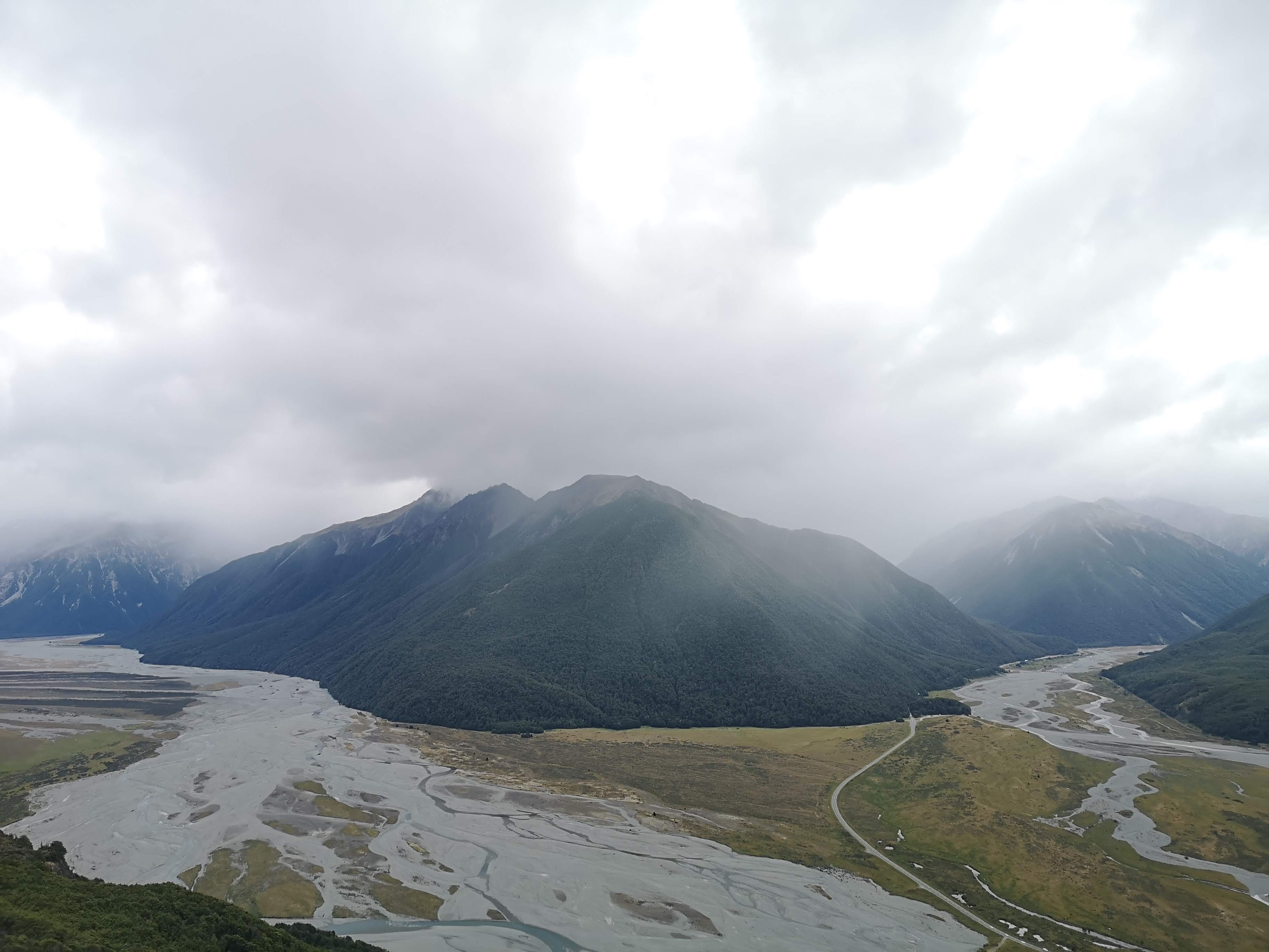 I returned to Andrew’s Shetler. I parked a little further up the road. Up the hill, around the corner. I’m more exposed. This is good. There’s a wind here which keeps the sandflies at bay. I actually step outside, take a look around. I find a couple taking refuge in the shelter. They’d parked where I had last night. Out of the wind, at the mercy of the sandflies. The forecast change never arrived. These things happen with the weather. As with anything, in the mountains the only certainty is change. All that’s happened by the looks of things is a slight delay of 24 hours. The early morning blues silently shift to grey. I commit to going up to Bealey Hut. Not for the night, but another stretch of the legs. I follow the braids of the Waimakariri River, passing over on a One Lane Bridge. Arthur’s Pass remains magnificent. I don’t regret the choices I’ve made. I only wish I had more time. I want to do everything, but I can’t. Bealey Spur track is a gentle, steady climb through beech forest, over tussock grass. Fledgling fantails dance around my head. This one tree is full of little squeakers. They come to see me, a long time has passed since I last had an entourage. In the deep valley below, the Bruce Stream roars like a motorway. Staring over the precipice my legs turn to jelly. I edge forward on to a protruding boulder. The height isn’t the problem, but the clear and obvious drop. The sudden disappearance of ground beneath my feet. The tiny voice returns to say I am going to fall. I believe it and take a step back. The earth no firmer but further from the edge. I continue along the trail up to a view point. Mountain, valley, river, valley, mountain, valley, road, river, railway line, valley mountain. And all again, at least twice more. Beneath a bleak sky the panorama remains phenomenal. At Bealey Hut I turn around. The summit is the same distance again but I’m not keen for it. I suspect I could manage the distance but my intention is to stay dry.